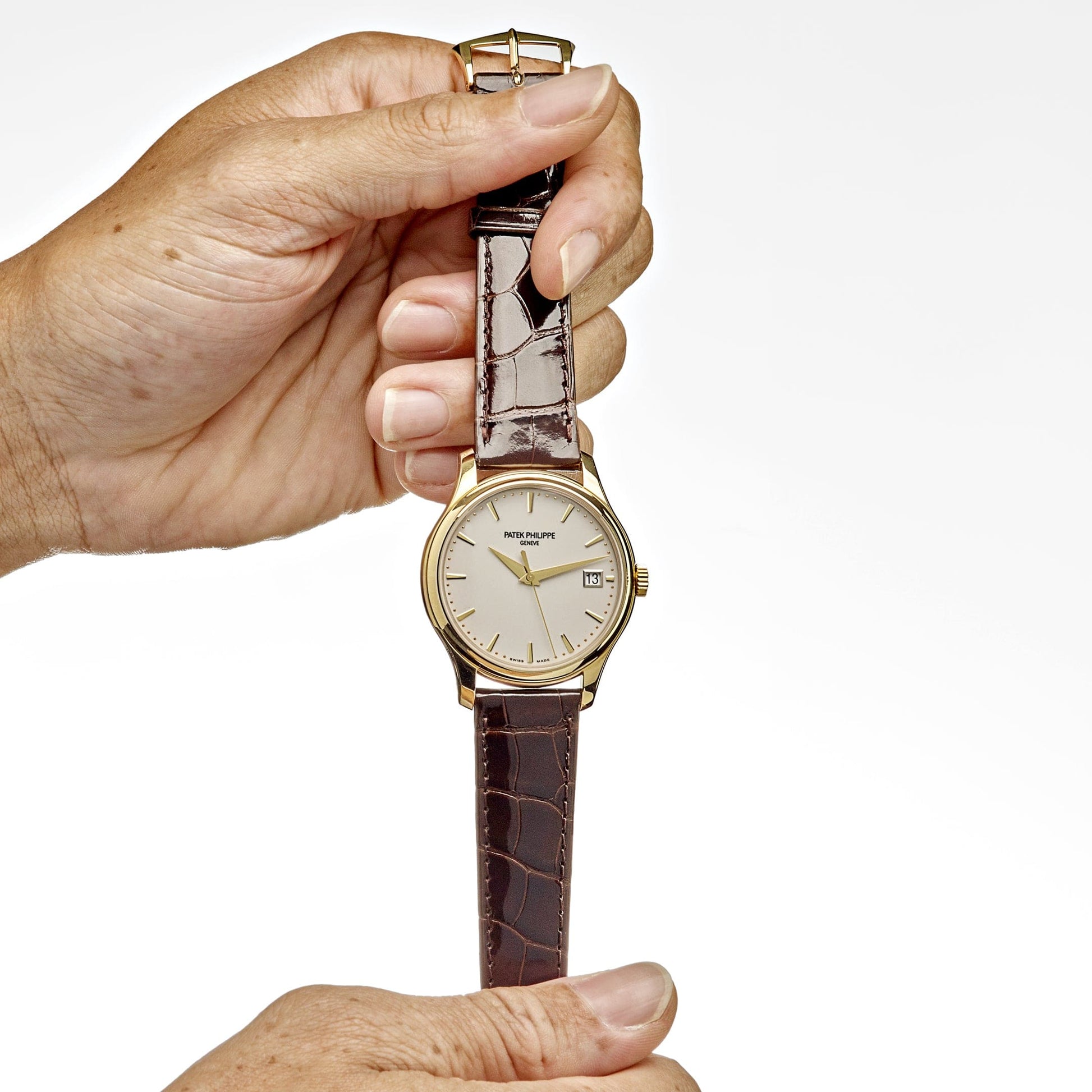 The Patek Philippe Calatrava is recognized as the very essence of the round wristwatch and one of the finest symbols of the Patek Philippe style. The 39mm case of this classical timepiece is designed in yellow gold and sports an ivory lacquered dial surrounded by gold-applied hour markers. The watch comes on a brown alligator strap with a prong buckle.