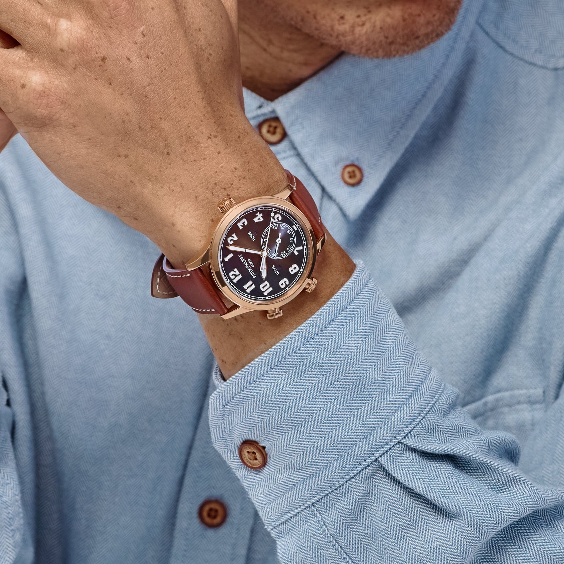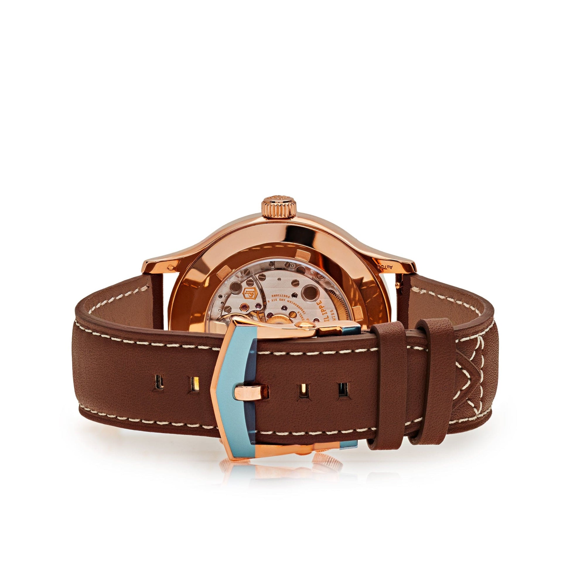 Paired with a vintage-style brown calfskin strap and secured with a rose gold pin buckle, the 5524R-001 is a statement of versatility and sophistication. Perfect for modern travelers, this Calatrava is a standout in Patek Philippe’s collection of complications.