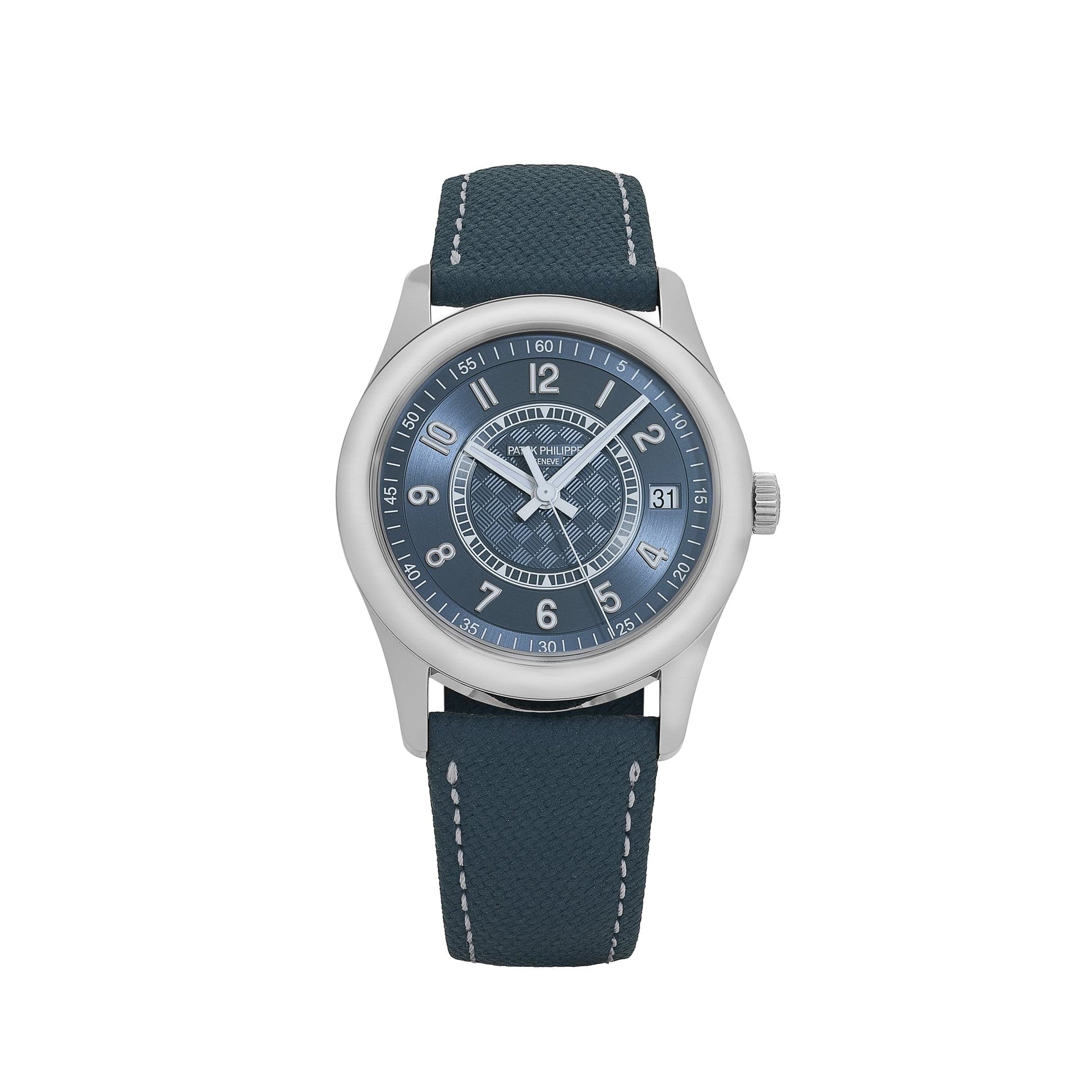 The 40mm case features polished and satin-brushed finishes, offering a modern twist on the classic Calatrava design. The striking grey-blue dial showcases a carbon-fiber-inspired guilloché pattern at its center, adding depth and texture to the clean layout. White gold-applied Arabic numerals and baton hands, treated with luminescent coating, ensure legibility, while a date display at 3 o’clock adds practicality.