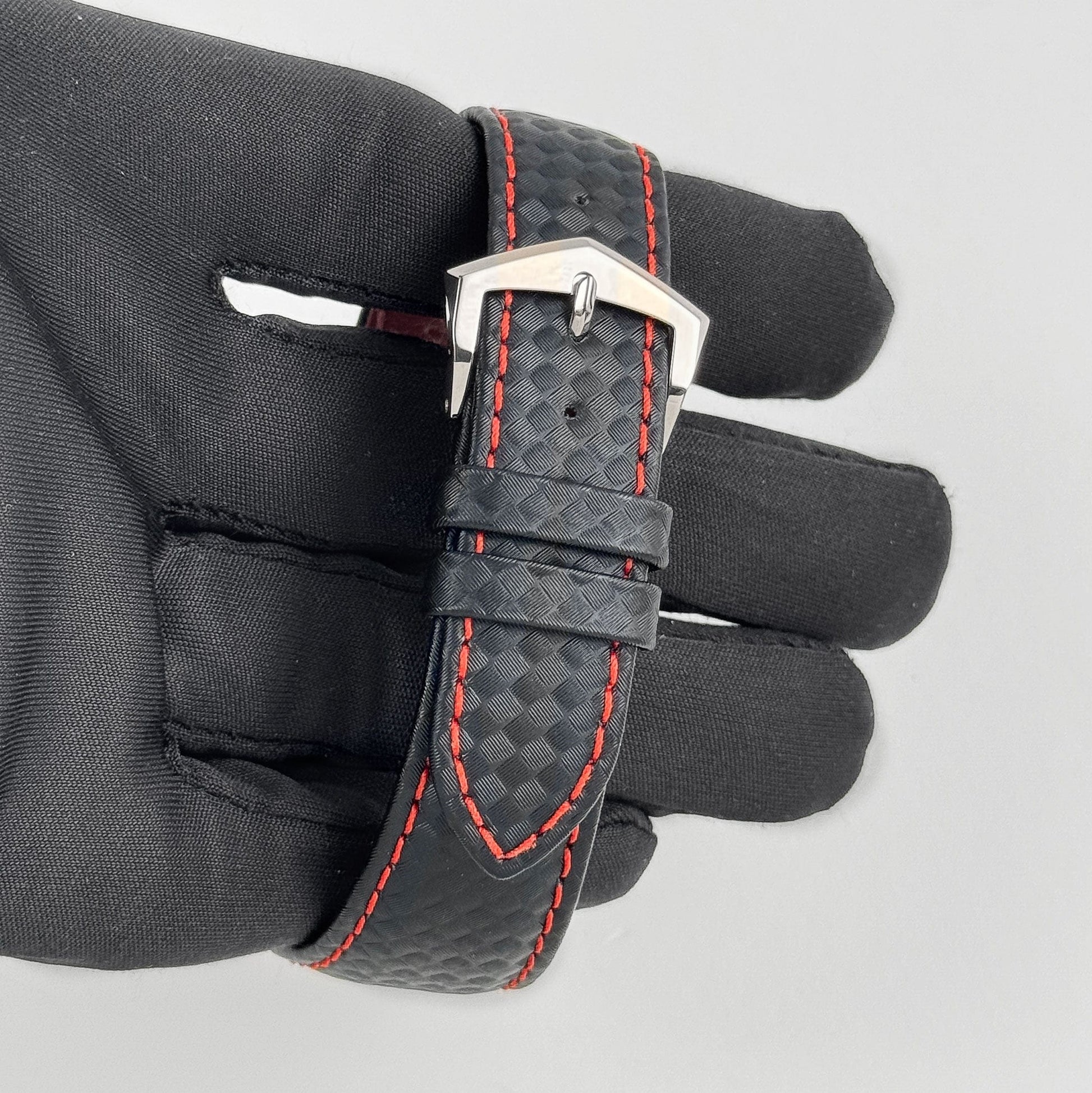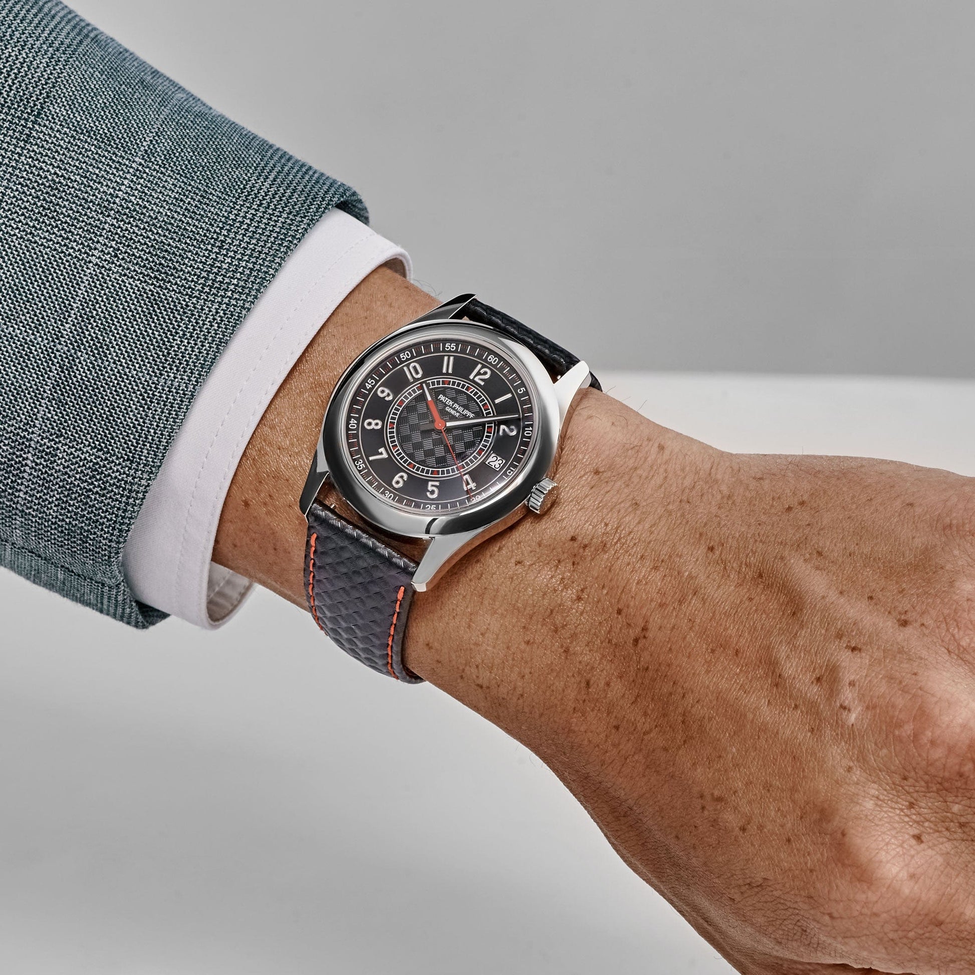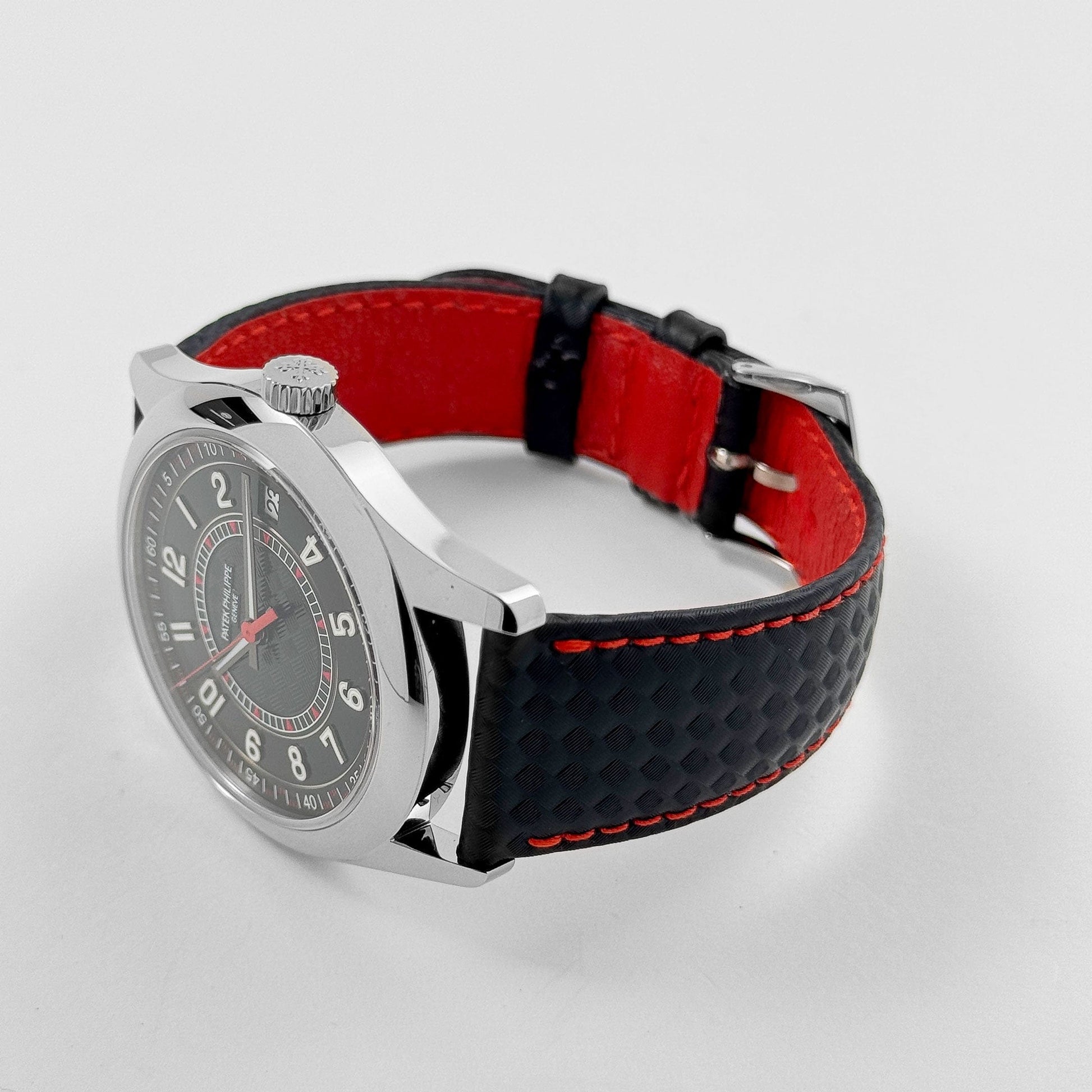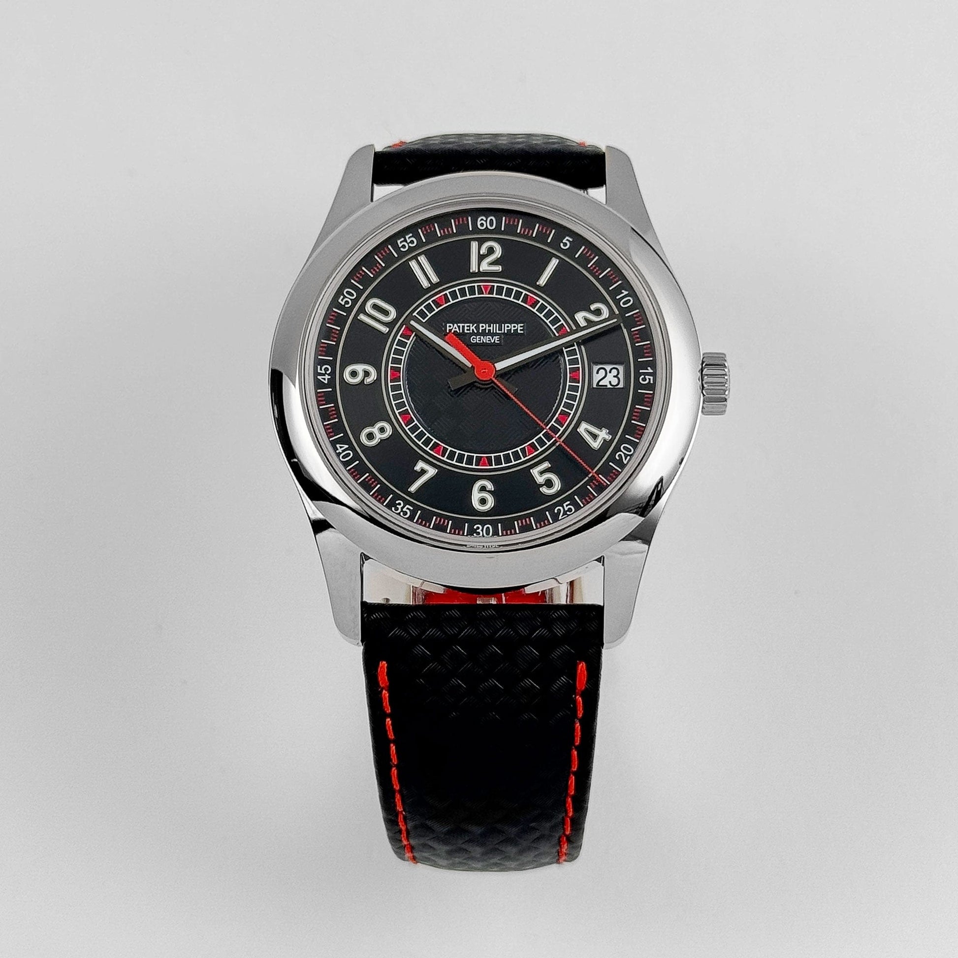This Patek Philippe Calatrava is designed in a 40mm white gold case with a black dial and red accents. The center of the dial and the paired strap feature a carbon motif design, providing texture and depth throughout the timepiece. The watch is fitted on a leather strap with matching stitching that complements the red highlights within the dial.