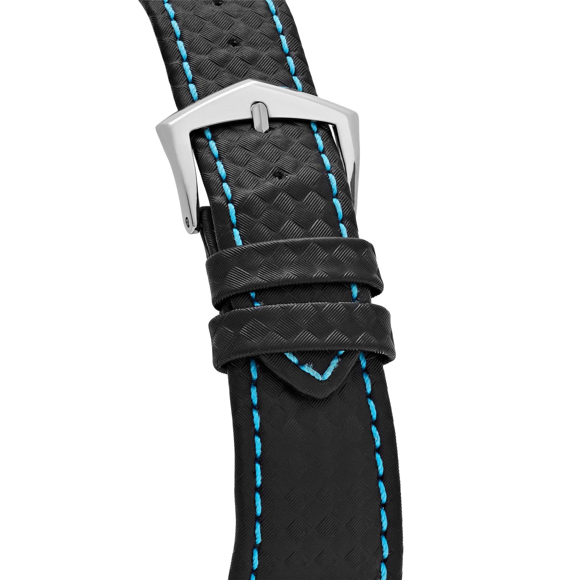 The Patek Philippe Calatrava 6007G-011 is a contemporary take on a classic, crafted in 18k white gold with a 40mm case and vibrant blue accents throughout. The dial features a textured carbon-fiber-style center, luminous Arabic numerals, and a matching blue seconds hand and railway minute track for a sporty yet refined look.