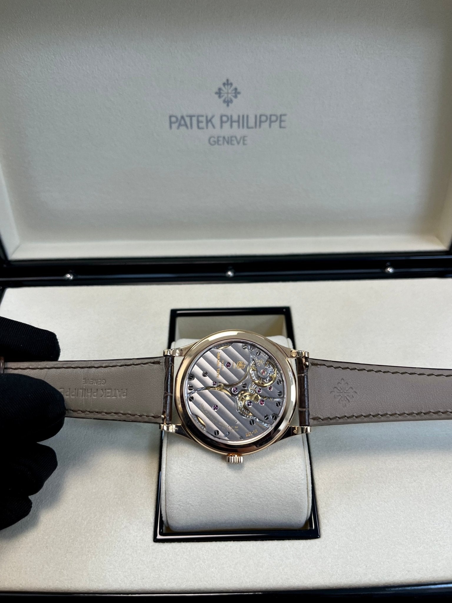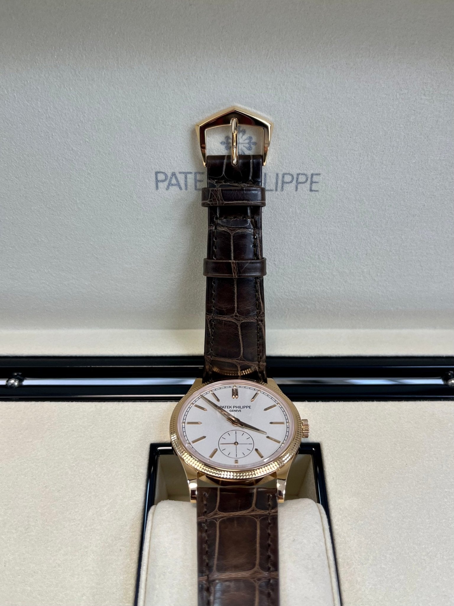 Patek Philippe gives fresh momentum to the emblematic Calatrava model featuring a guilloched hobnail pattern also known as Clous de Paris by treating it to a slightly larger diameter and a design reinterpreted in a contemporary spirit. The faceted applied rose gold hour-markers, combined with dauphine-style hours/minutes hands, create a sleek and timeless dial aesthetic. The elegantly refined rose gold case houses the new manually wound movement 30-255 PS with a 65-hour power reserve.