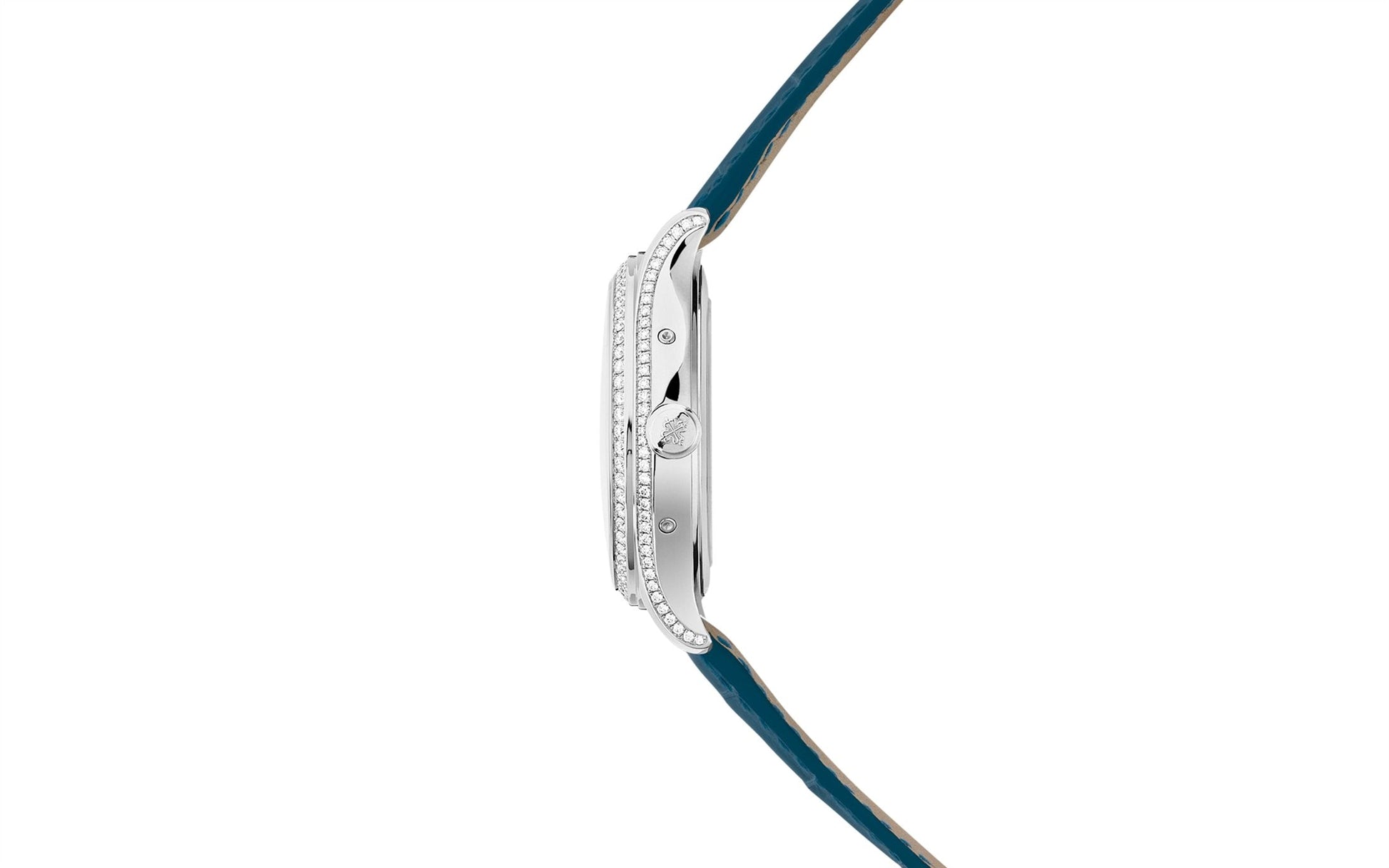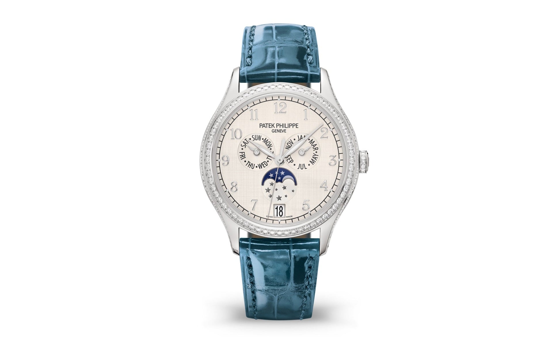 Unworn Luxury Ladies Patek Philippe Complication watch. The 18k White Gold set with 155 diamonds (~1.34 ct) Annual Calendar, 38mm, Reference 4947G-010. The model has elegant Silvery dial with vertical and horizontal satin-finished reminiscent of wild shantung silk and luminous 18k White Gold leaf-style hands and graceful 18k White Gold Center sweep second hand. The dial decorate large 18k White Gold hour markers in the form Arabic numeral. A minute scale is applied along its outer edge. The patented annual calendar is ingenious mechanism which displaying three multi-function sub-dials: month display at the 3 o'clock position; day of the week display at the 9 o'clock position; moonphase display at the 6 o'clock position. In addition, below it at the 6 o'clock position, there is a date display in the aperture. Screw-down 18k White Gold crown, that logo Patek Philippe decorated set with 14 diamonds (~0.06 ct). The dial closed by a Scratch-resistant Sapphire Crystal and Scratch-resistant Sapphire Crystal case back. The watch is polished fixed 18k White Gold bezel set with 64 diamonds. The watch Patek Philippe Caliber 324 S QA LU has Self-winding mechanical movement, containing 34 Jewels, and power reserve min. 35 hours, max. 45 hours. This model presented on shiny peacock blue alligator leather strap with square scales, hand-stitched secured by an 18k White Gold Prong buckle. The water resistance is up to 30m/100ft (3 ATM).
