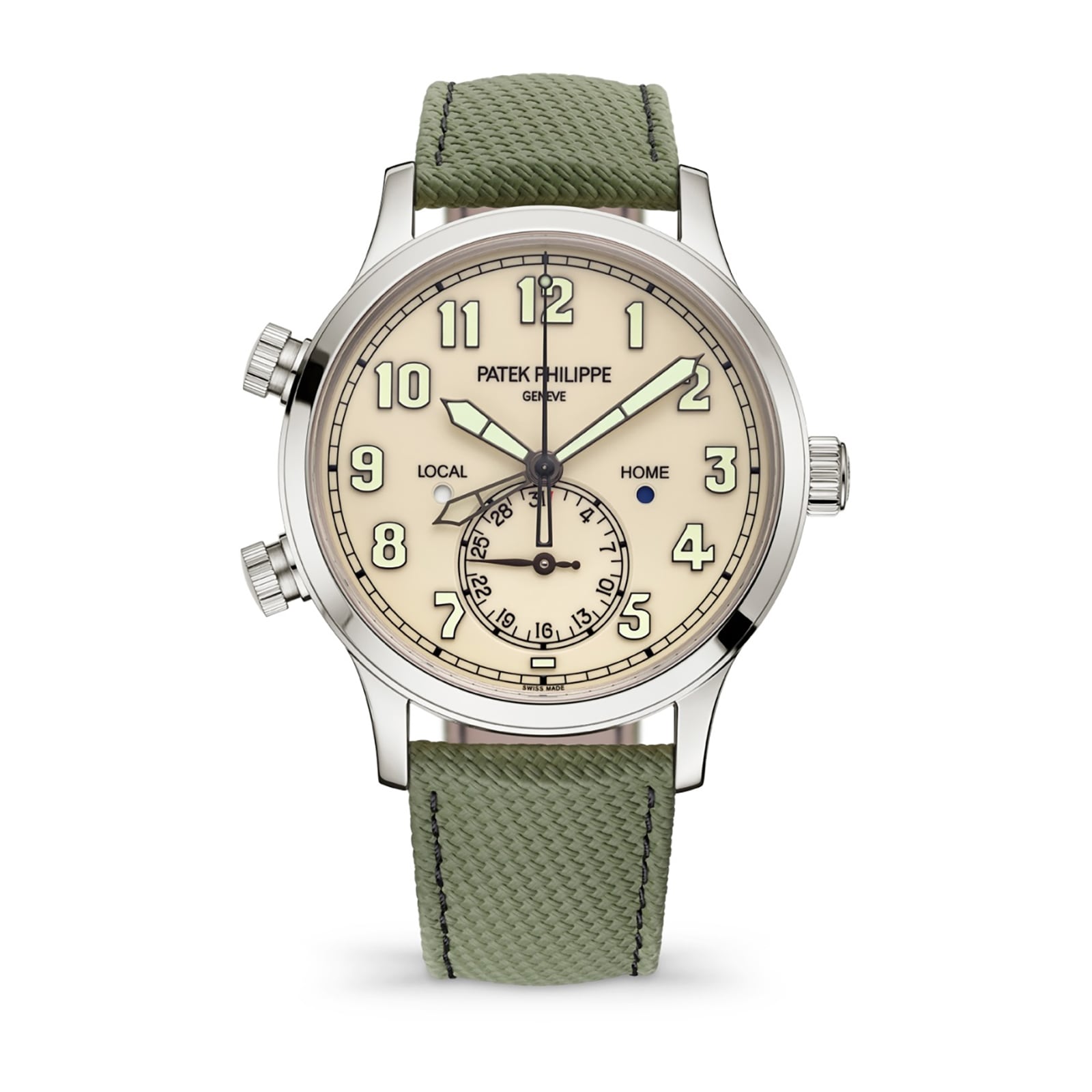 Patek Philippe reinterprets the Calatrava Pilot Travel Time in white gold with an elegant ivory lacquered dial and a khaki green composite-material strap with fabric motif. At the heart of this original, elegant travel watch with an assertive personality beats the 26-330 S C FUS caliber, a self-winding movement distinguished by its easy-to-use Travel Time display system. The date indicated by hand at 6 o'clock automatically adjusts to the local time, whether forwards or backwards. The two time-zone pushers feature a patented safety system designed to prevent accidental disruption of local time.
