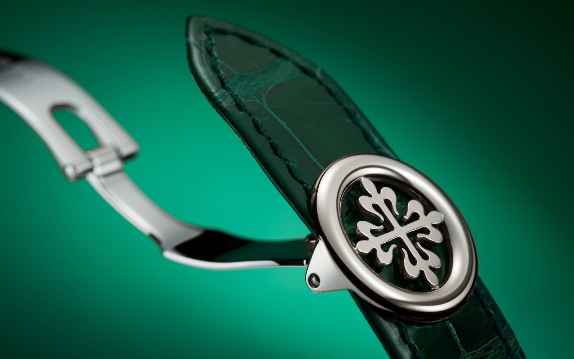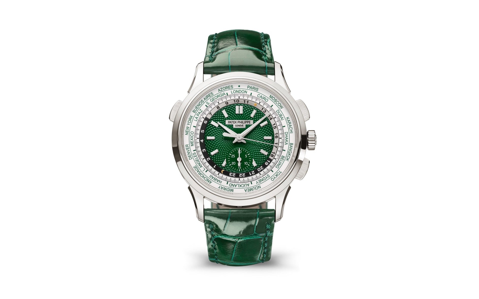 Luxury Patek Philippe Complication World-Time flyback chronograph, Platinum as attested by the diamond between the lugs at 6 o’clock, 39,5mm and Reference 5930P-001. Classicism and boldness. The highlight of this model is say it trendy, vibrant green dial. The circular guilloché pattern, applied by hand, is extremely refined and deservedly does not go unnoticed. Look good on dial applied 18k White Gold index hour markers with luminescent coating. The central Dauphine-style hour and minute hands are paired with a chronograph seconds hand. In the lower half of the green centre section, there is a 30-minute chronograph counter. Moving outward one-step, we find a two-tone day/night and 24-hour ring. Nestled in between that ring, and the outer city ring is the black on white chronograph-seconds track. Lastly, the outer ring shows all 24 time zones with corresponding cities, printed in green. It shows the time at a glance in all 24 time zones at any given moment. To change time zones, simply press the pusher at 10 o’clock and all displays will be simultaneously corrected. Polished Screw-down Platinum crown that with ribbed edge for comfortable grip and logo Patek Philippe with for the flyback chronograph Platinum buttons are located on the right side of the case. The dial closed by a Scratch-resistant Sapphire Crystal and sapphire-crystal case back which allows of the case, allows you to see the magical work of the movement. The watch is equipped fixed polished Platinum bezel. The watch Patek Philippe Caliber СН 28‑520 HU Self-winding mechanical movement, containing 38 Jewels, and has a power reserve of min. 50 hours – max. 55 hours. This model presented on shiny bottle green Alligator leather strap with square scales, hand-stitched and a platinum Fold-over clasp. The water resistance is up to 30m/100ft (3 ATM).