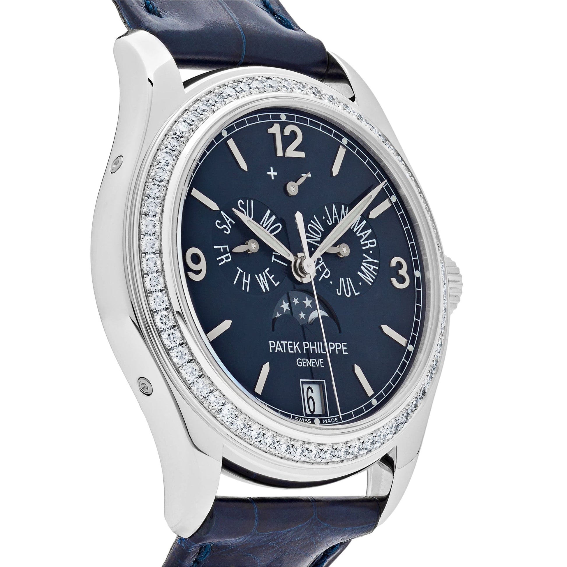 The blue lacquered dial features a refined layout, showcasing Patek Philippe’s annual calendar with day, date, and month apertures, along with a beautifully rendered moon phase display at 6 o’clock. White gold applied hour markers and dauphine hands, enhanced with luminescent coating, ensure excellent legibility.