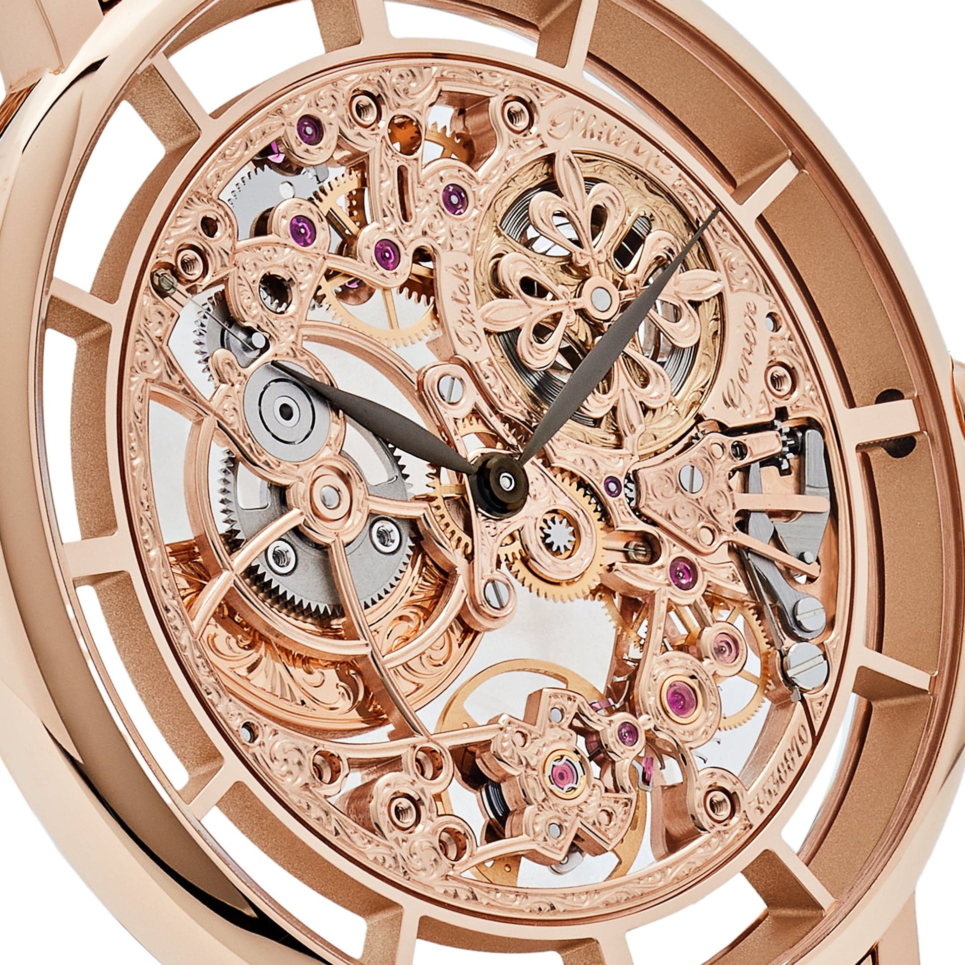 The Patek Philippe Complications 5180/1R-001 is a masterful display of skeletonized artistry and horological expertise. Crafted in 18k rose gold, its 39mm case houses a meticulously hand-engraved skeleton movement, visible from both the dial side and the exhibition caseback. The openworked dial allows a full view of the intricate Caliber 240 SQU, showcasing the fine finishing, delicate bridges, and the micro-rotor, all adorned with exquisite floral motifs and traditional hand-engraved patterns.