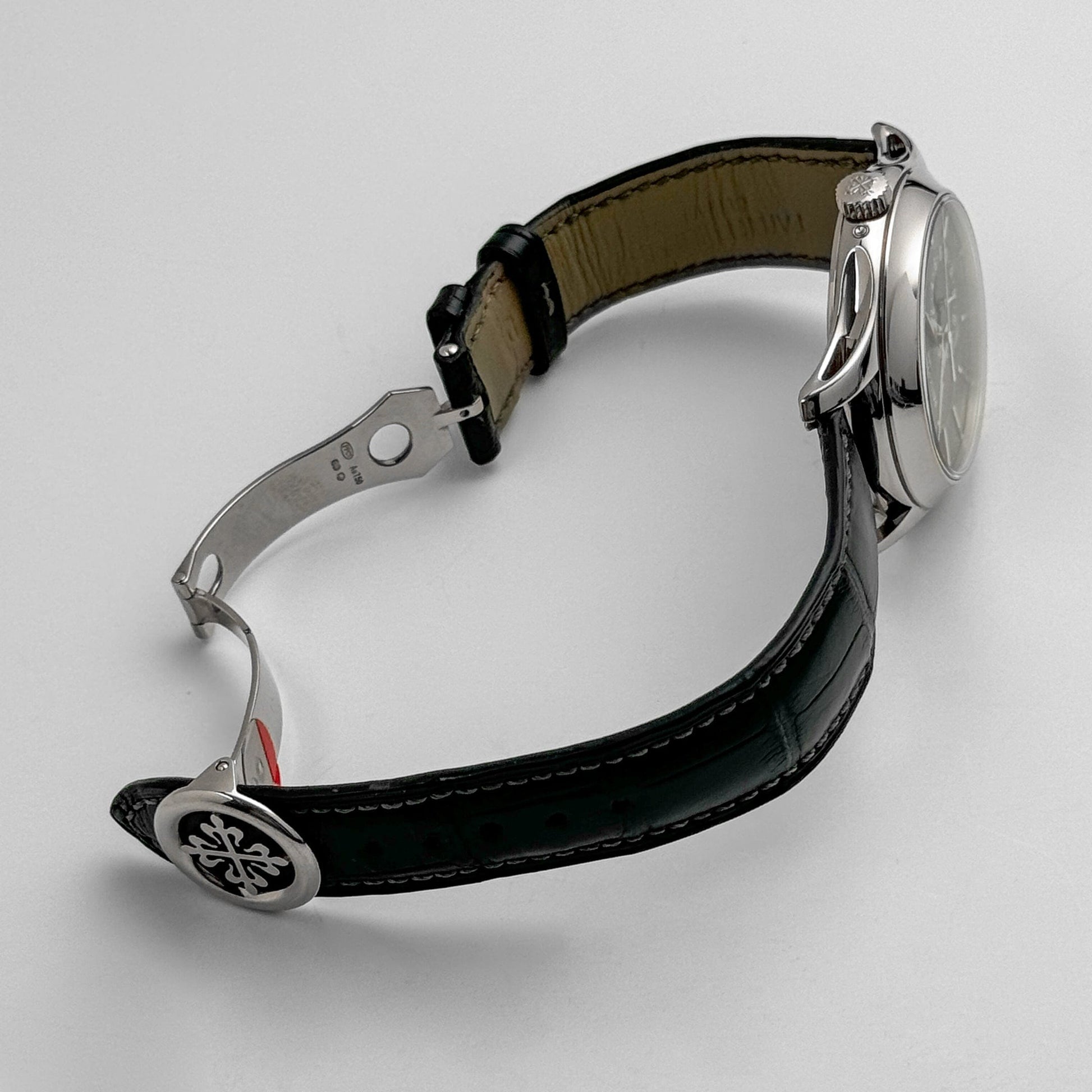 This Annual Calendar Chronograph is recognizable by its three apertures displaying the day, the date and the month. The 40.5mm is inlaid in a 18k white gold case featuring a black two-toned sunburst dial with gold applied hour markers and a slightly concave bezel. It has a moon phase display with day/night indication, and sapphire-crystal. It is housed on a black alligator strap with an 18k white gold ardillon buckle.