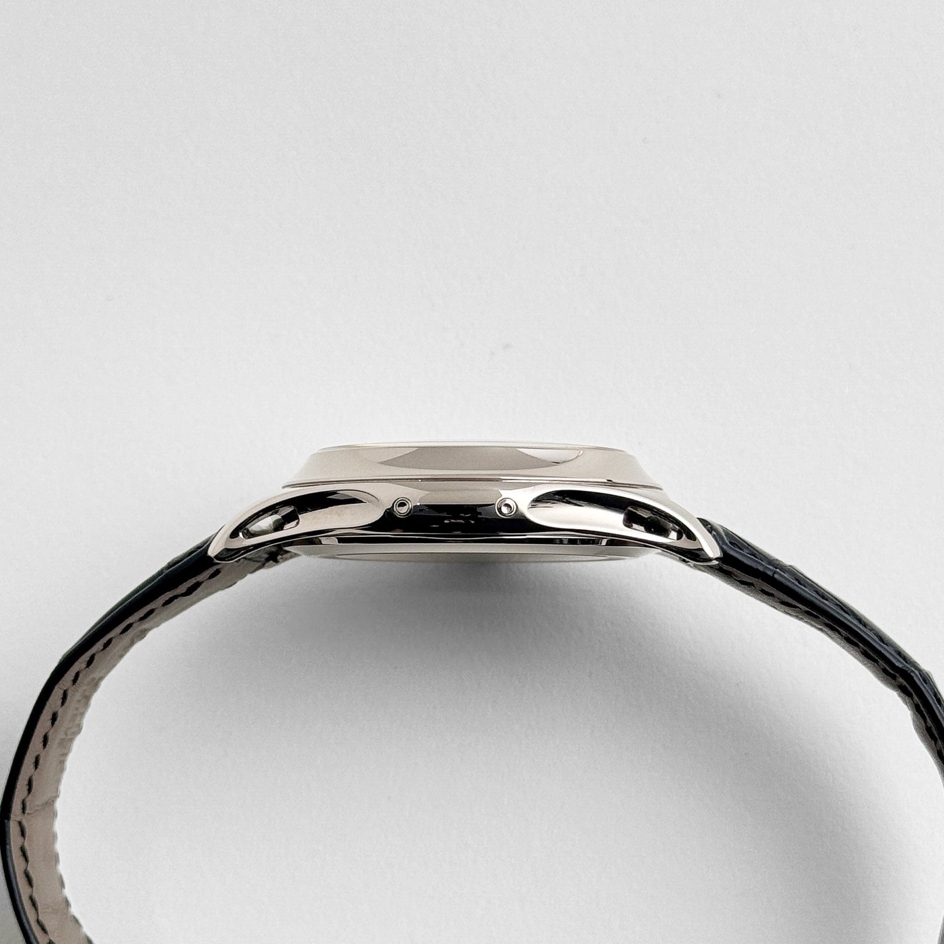 This Complications Annual Calendar is recognized by its three apertures along an arc for displaying the day, the date and the month. The 40mm is inlaid in a 18k white gold case featuring a blue sunburst dial with gold applied hour markers and a slightly concave bezel. It has moon phase display with day/night indication and sapphire-crystal. It is housed on an alligator strap with an 18k white gold prong buckle.