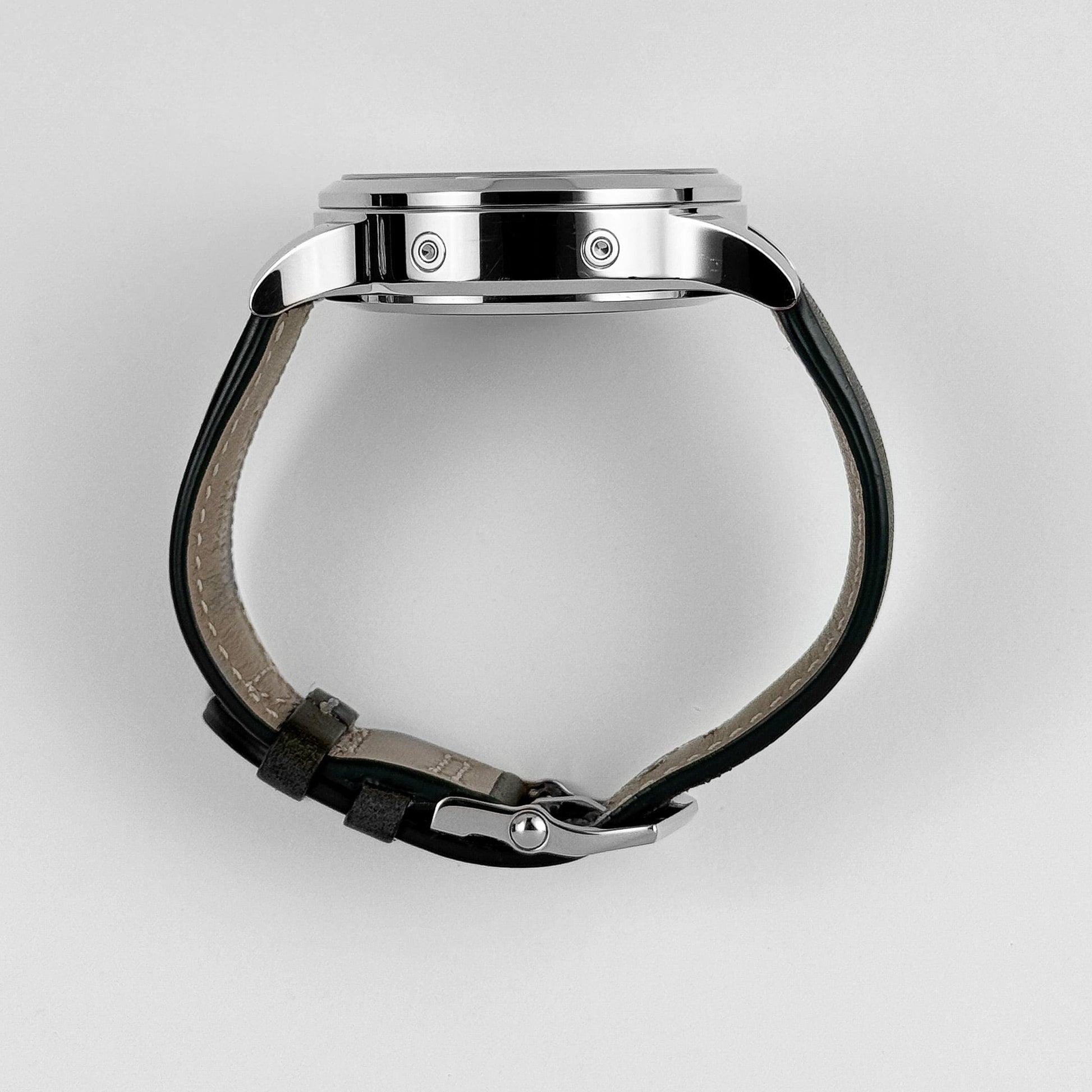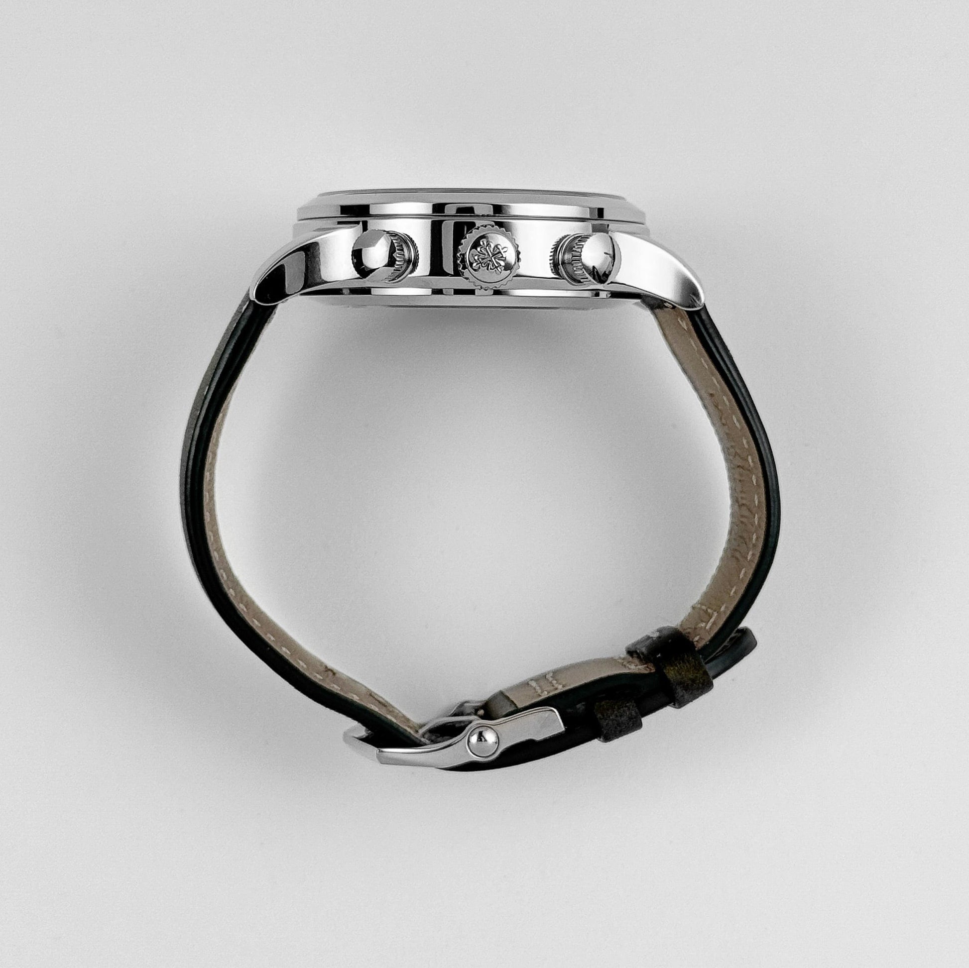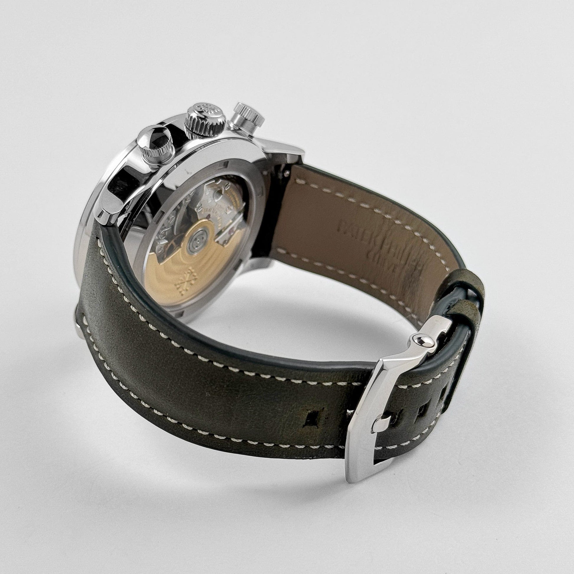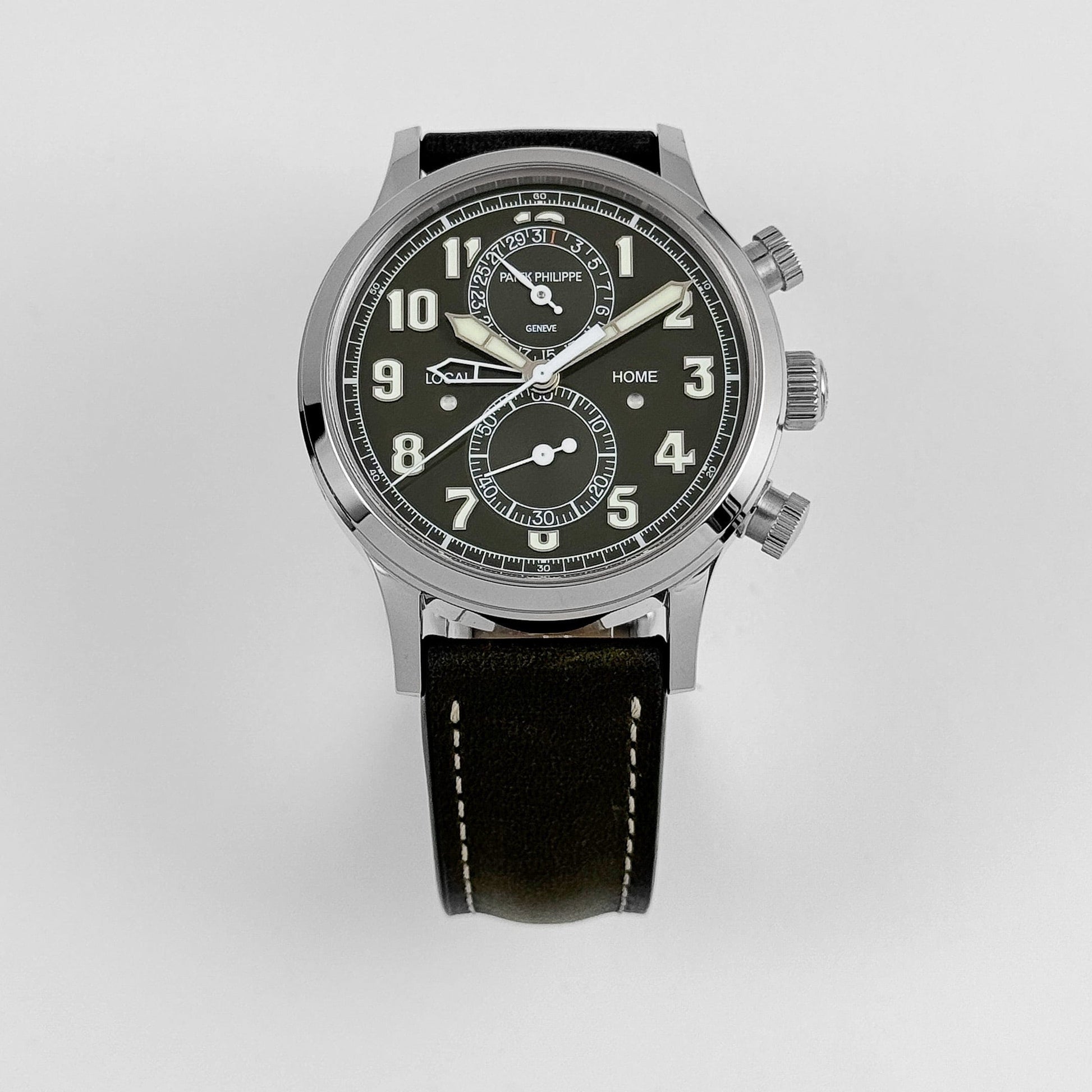 The Patek Philippe Complications 5924G‑010 Calatrava Pilot Travel Time Chronograph introduces the maison’s first chronograph within its Pilot-style collection. Housed in a 42 mm white gold case with distinctive stepped bezel and bold pushers, the watch frames a lacquered khaki-green dial accented by recessed snailed registers and white-gold Arabic numerals filled with Super-LumiNova. Dual time functionality is delivered via a skeletonized home-time hand and a solid local-time hand, while a hand-coupled date indicator at 12 o’clock syncs with local time—and oversized correction pushers at 8 and 10 o’clock adjust the hours independently.