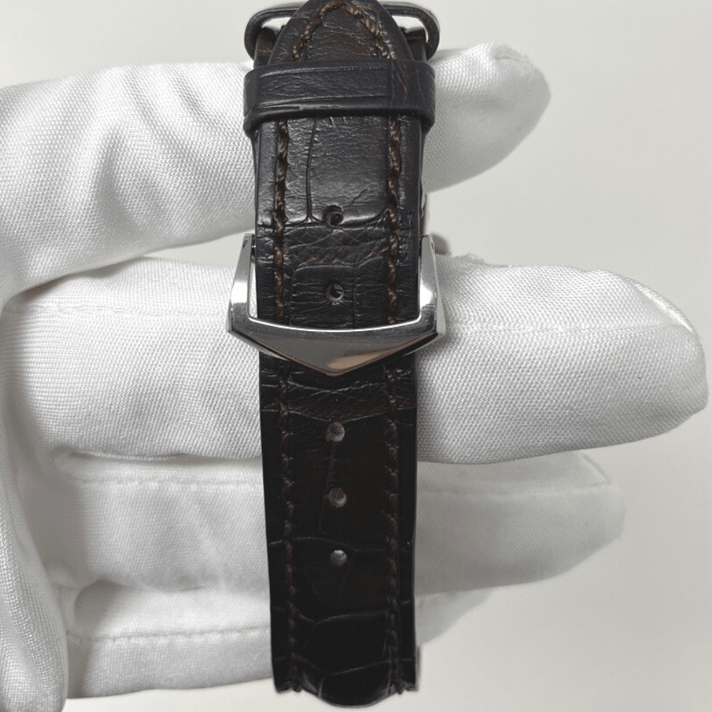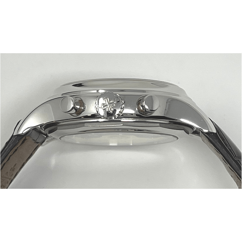 This Patek Philippe Annual Calendar Chronograph is Patek's first in-house chronograph movement. The 40.5mm case is inlaid in Platinum and features a grey anthracite dial with day, date & month displayed in apertures and a chronograph with both the 60-minute and 12-hour counters combined. It is protected by a sapphire-crystal and comes on a brown alligator strap with a platinum deployant buckle.