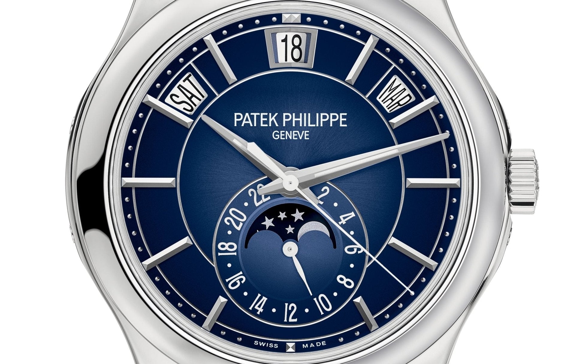 Recognizable by its three apertures along an arc for displaying the day, the date and the month, the Reference 5205 Annual Calendar pairs its white-gold version with an elegant sunburst dial in two tones of blue shading to black. The case construction is notable for the slightly concave bezel and the delicately pierced strap lugs. A sleek, dynamic and very contemporary style graces this calendar watch requiring adjustment only once a year.