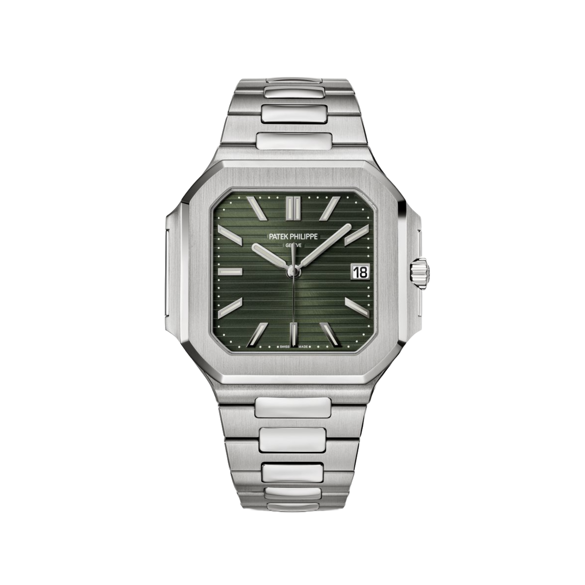 This new square case, featuring rounded edges, offers an elegantly slim fit on the wrist. Its horizontally embossed dial showcases a refined sunburst olive green color. The steel bracelet comes with a lockable adjustment system and a patented Patek Philippe fold-over clasp, ensuring both comfort and security.