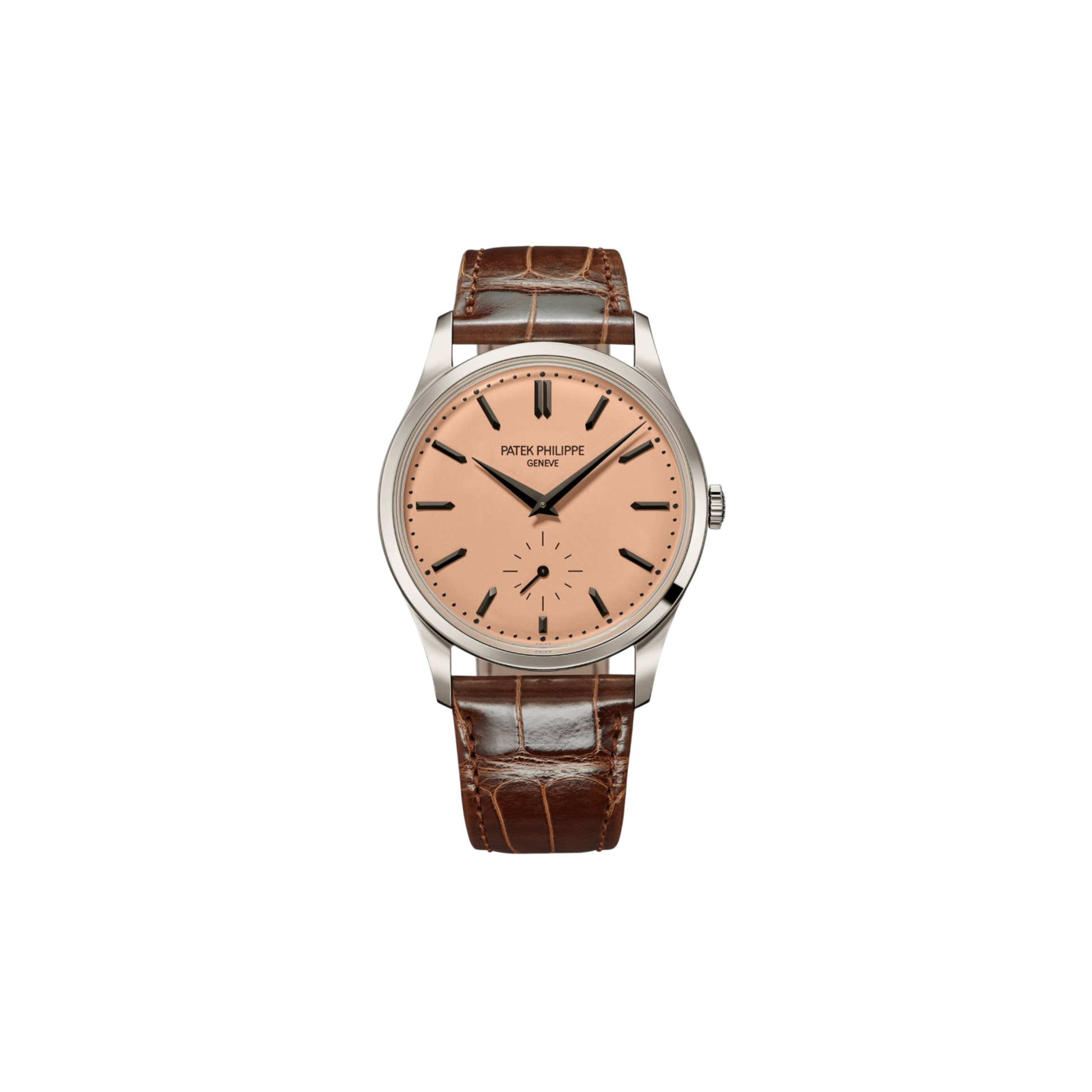 Crafted in platinum, the 38mm case presents a perfect balance of modern proportions and classic sophistication. The warm opaline rose-gilt dial—a subtle nod to vintage salmon tones—features minimalist baton hour markers and a small seconds subdial at 6 o’clock, showcasing Patek’s dedication to purity in design.