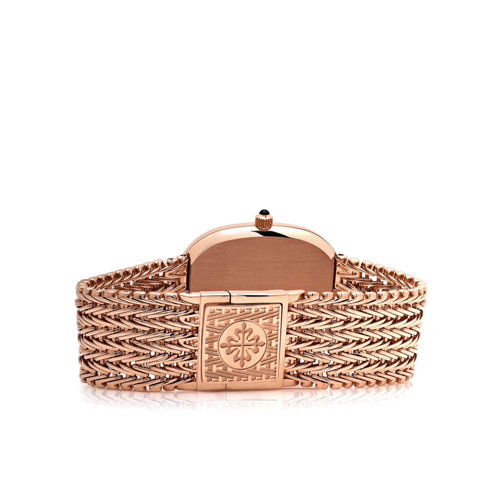 The black dial serves as a striking contrast to the warm rose gold tones, while simple hour markers and hands ensure clarity and minimalism. Powered by a manual-winding movement, the Golden Ellipse maintains the brand’s signature level of mechanical excellence and impeccable finishing. With its iconic shape, refined materials, and understated elegance, the 5738/1R-001 embodies Patek Philippe’s legacy of fine watchmaking and timeless design.