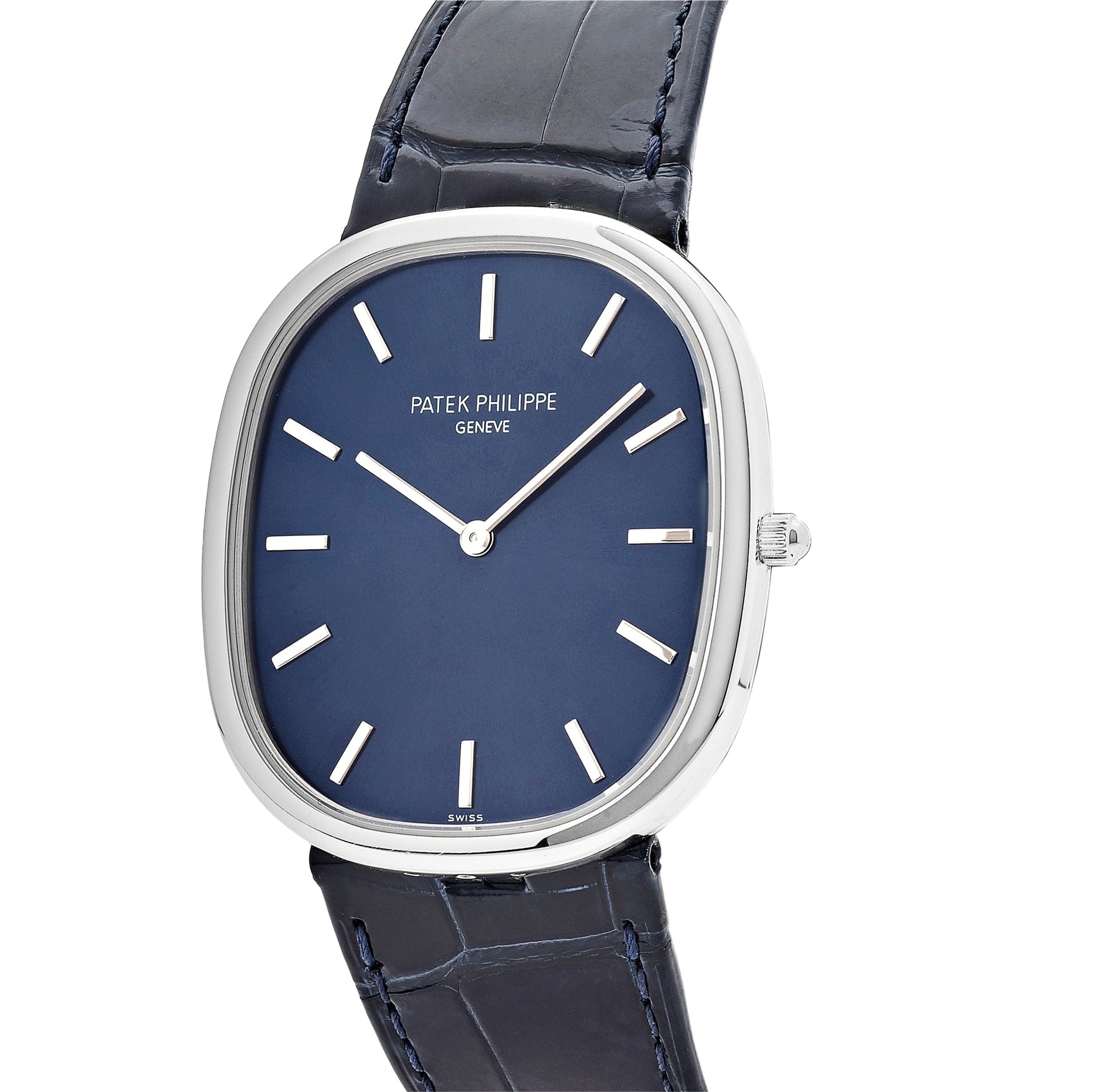 The Patek Philippe Golden Ellipse 5738P-001 in platinum with a blue dial combines iconic design with modern sophistication. The elegant platinum case frames a stunning blue dial, creating a striking contrast that enhances its refined look. Known for its distinctive elliptical shape and perfectly balanced proportions, this timepiece offers timeless elegance. Released as part of a limited edition, the 5738P-001 is a rare piece for collectors seeking both exclusivity and exceptional craftsmanship.