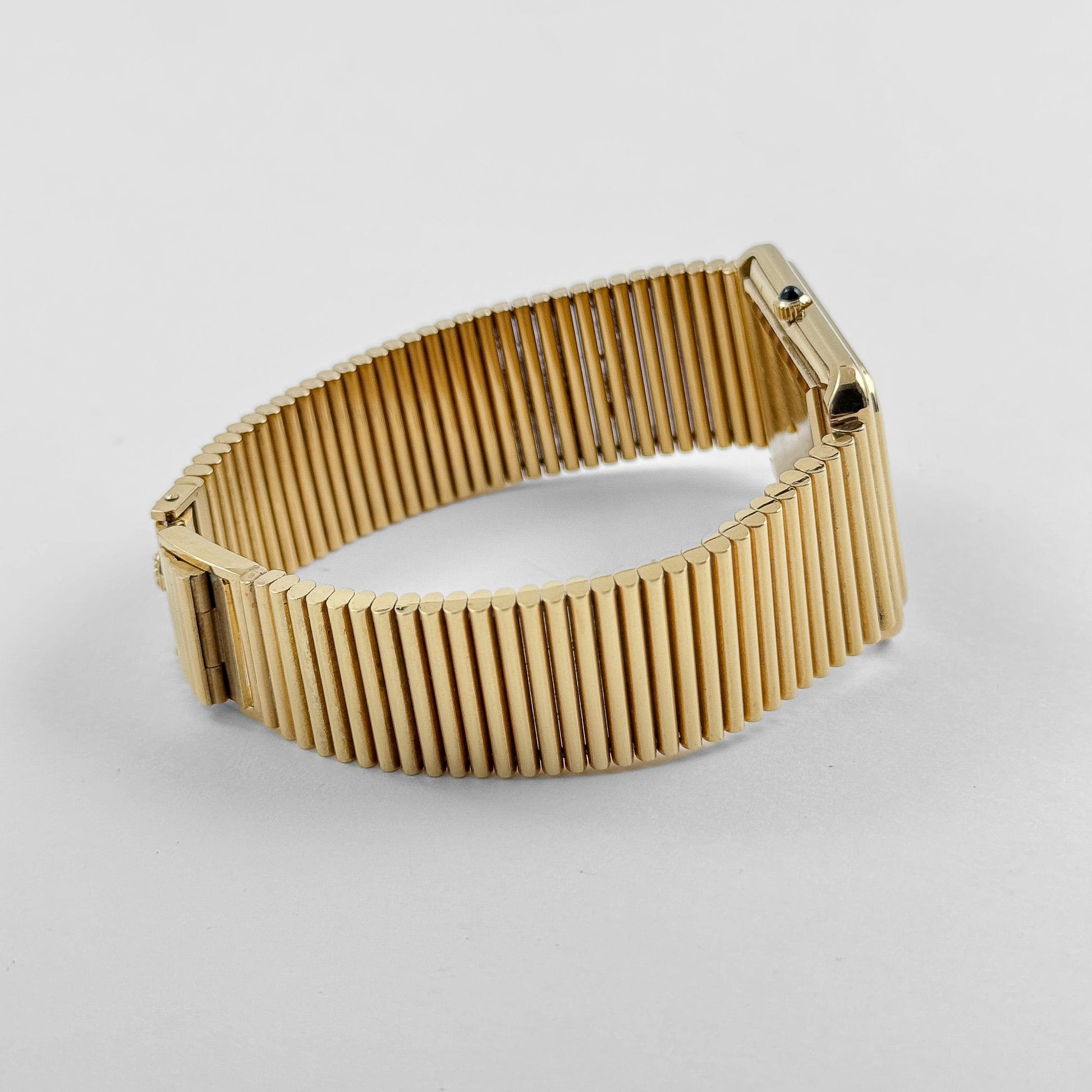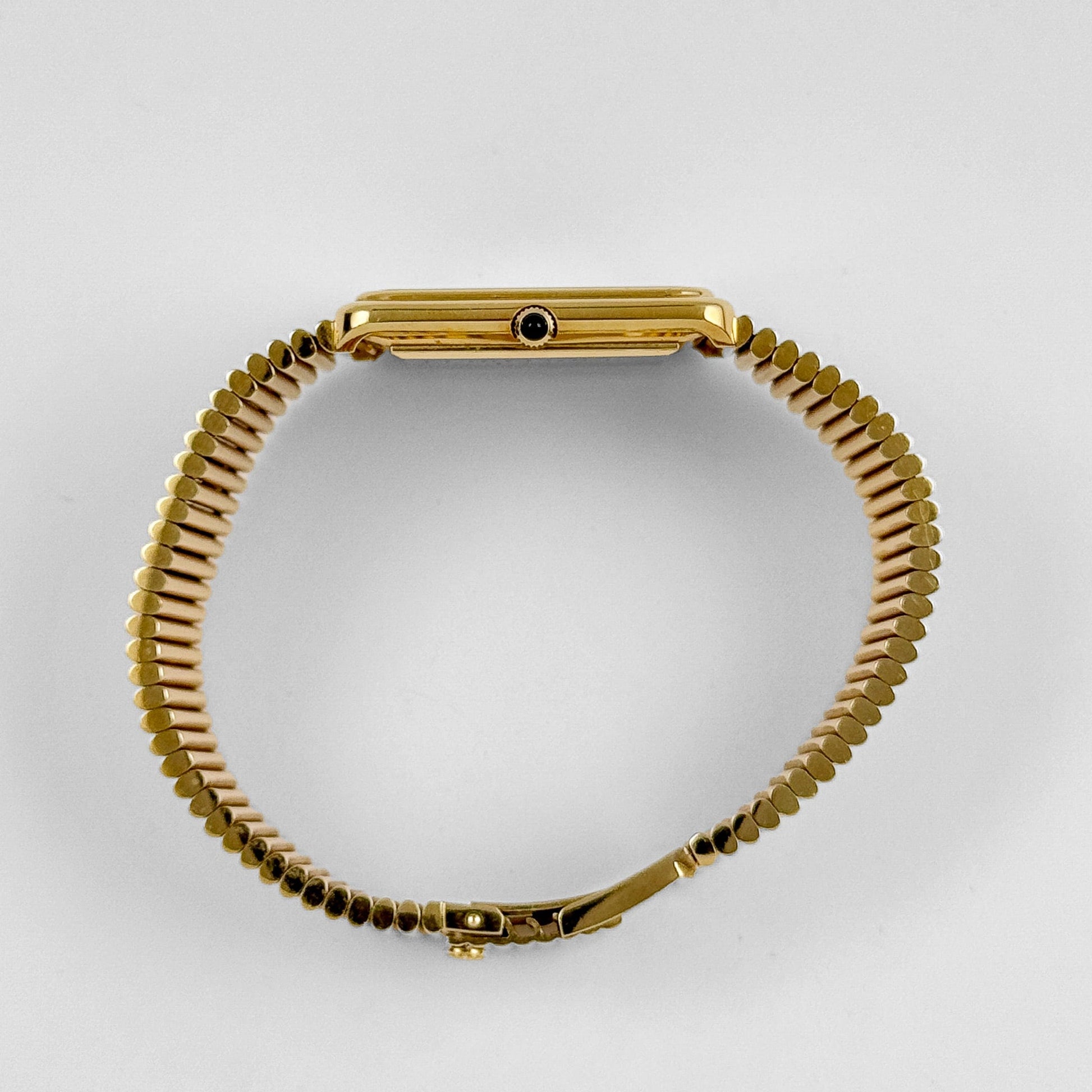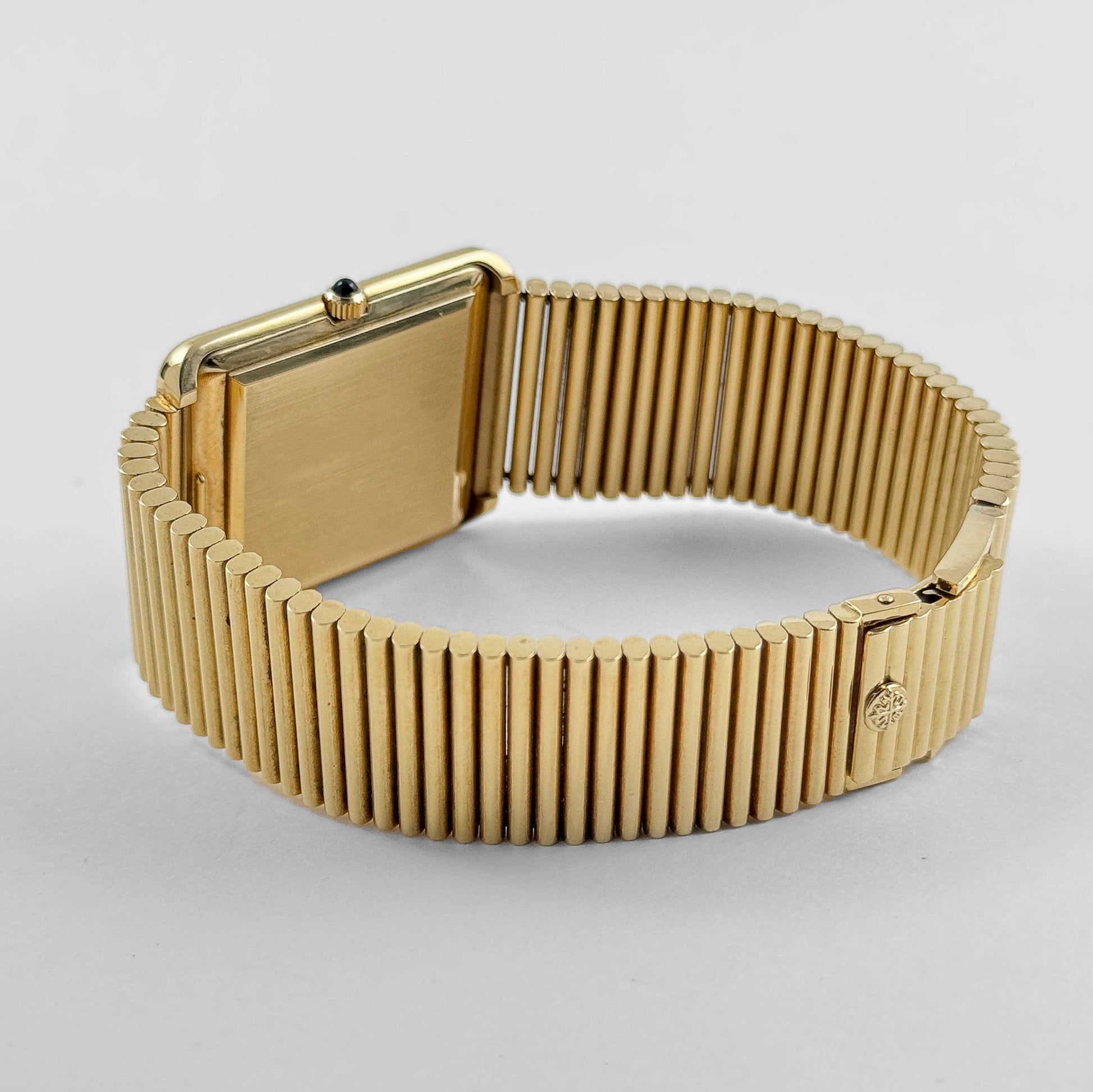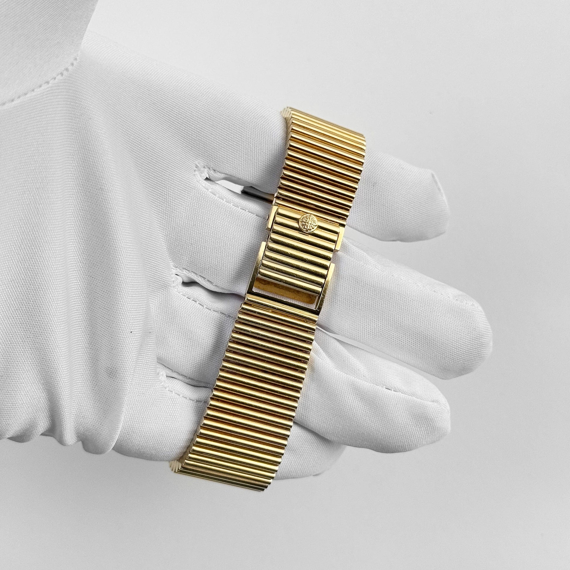 The Patek Philippe Gondolo Ref. 3649-1 is a striking example of the Gondolo line’s Art Deco legacy, housed in a stepped rectangular 18k yellow gold case measuring approximately 30 mm. Its standout feature is the factory onyx stone dial, paired with sharp dauphine hands that contrast beautifully against the dark backdrop. The case is topped with a stepped bezel and set on an integrated yellow gold bracelet or tubular link design, emphasizing seamless geometry and bold vintage presence.