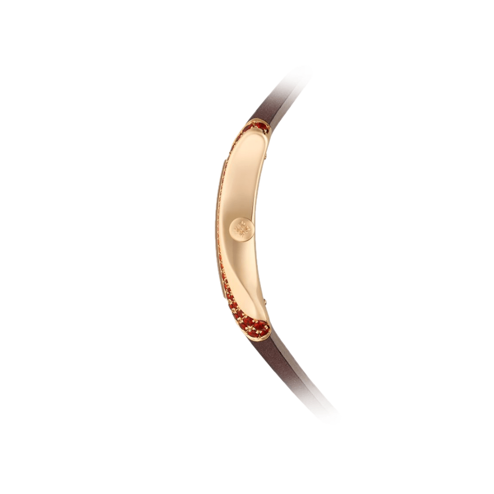 The Patek Philippe Gondolo 4962/200R-001 in rose gold with a spessartine bezel and brown floral motif dial combines exceptional craftsmanship with distinctive design. The warm rose gold case is enhanced by a bezel set with vibrant spessartine gemstones, adding a touch of luxury. The dial, featuring elegant Breguet numerals and a refined floral motif, offers a sophisticated and timeless aesthetic. This exquisite timepiece is ideal for collectors seeking a rare and elegant piece that combines both beauty and precision.