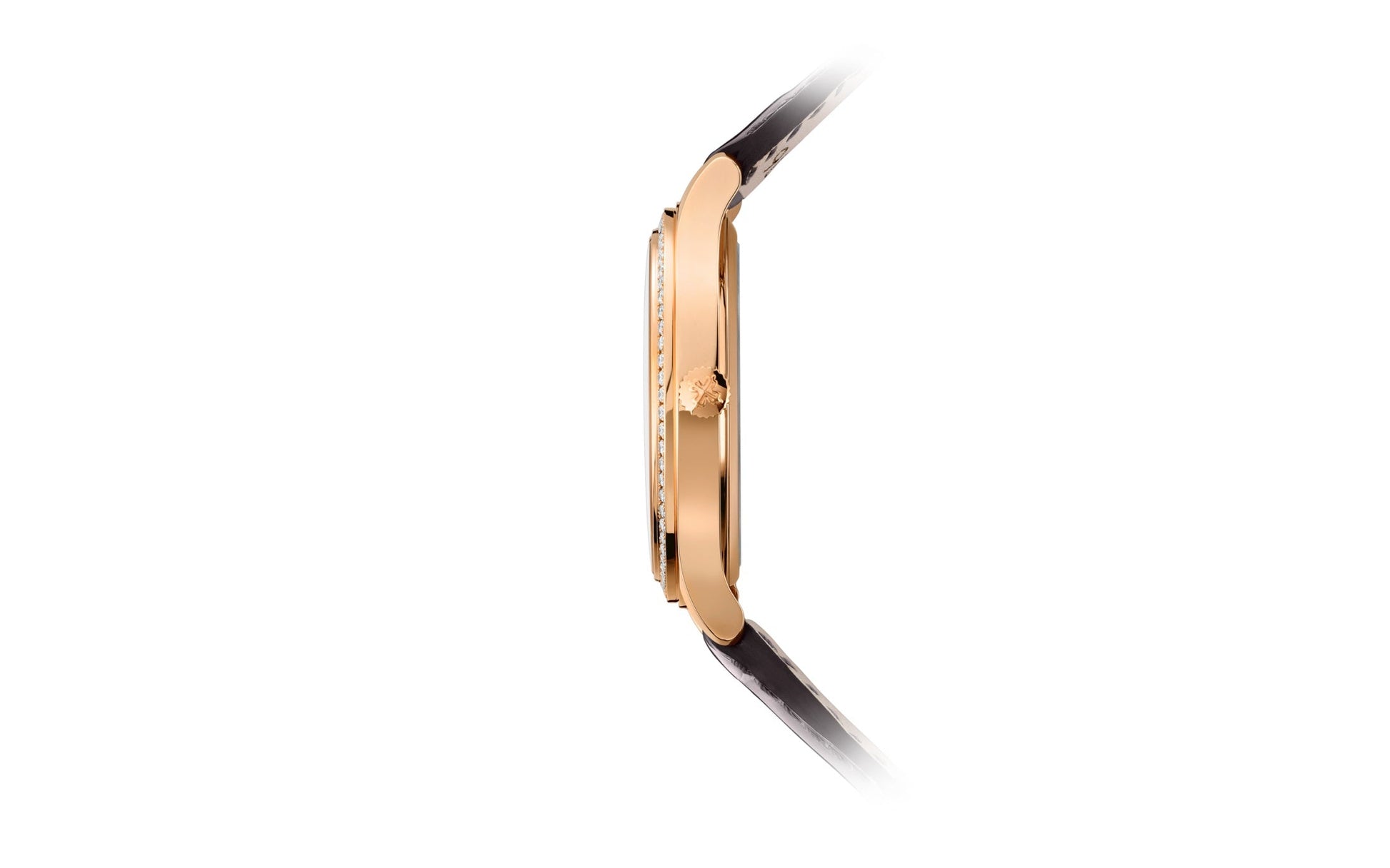 Unworn Patek Philippe Grand Complication Luxury Ladies watch, 35,1mm with 18k Rose Gold case, Reference 7140R-001. This model has Silvery white Opaline dial with Polished 18k Rose Gold hands and large applied polished 18k Rose Gold Arabic numerals hour markers. Applied polished 18k Rose Gold dot minute track on teh dial perimeter. Day of the week sub-dial at 9 o'clock. Month sub-dial at 3 o'clock. Date sub-dial at 6 o'clock. 24-hour AM/PM indicator at the center of the 9 o'clock sub-dial. Leap Year indicator located at the center of the 3 o'clock sub-dial. Moonphase indicator located at the center of the 6 o'clock sub-dial. Polished 18k Rose Gold Pull / push crown with ribbed edge for comfortable grip and logo Patek Philippe. The dial closed by a Scratch-resistant Sapphire Crystal and Interchangeable full case back of sapphire-crystal. The watch is equipped fixed polished 18k Rose Gold bezel set with 68 brilliant cut diamonds weighing a total of +/- 0.68 carats. The watch Patek Philippe caliber 240 Q, features a solid 22kt micro-rotor, beats at 21,600 vph (3Hz), contains 27 jewels, composed of 275 parts and has a power reserve of 38-48 hours. This model presented on shiny alligator with square scales, hand-stitched, mink gray (originally fitted) and royal purple (additional strap). 18k Rose Gold Prong buckle set with 27 diamonds (~0.2 ct). The water resistance is up to 30m/100ft (3 ATM).
