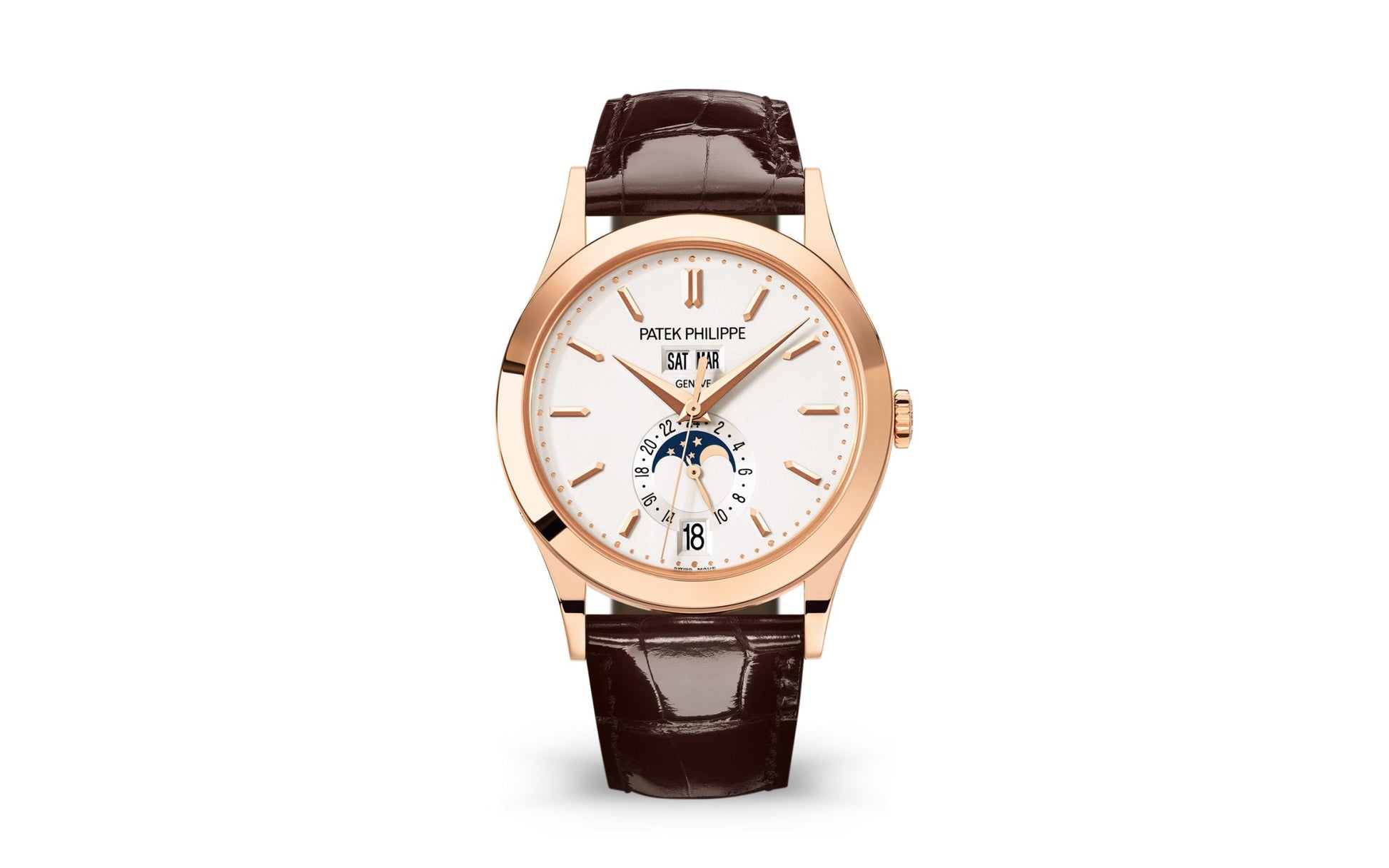 Unworn Luxury Patek Philippe Complication watch. The 18k Rose Gold Annual Calendar / Moonphases, 38,5mm, Reference 5396R-011. The model has silvery opaline dial the highlight of which are with is beautifully finished with 18k Rose Gold applied index hour markers and hands and the Patek Philippe logo at 12 o’clock. On the outer edge of the dial there is a minute scale consisting of 18k Rose Gold dots. The patented annual calendar is ingenious mechanism. Сonsists date in aperture located at 6 o'clock along with the day of the week and the month in apertures at 12 o’clock. Besides there is a 24-hour sub-dial at 6 o’clock and, perhaps the standout feature of this dial, a Moon phase within that. Polished 18k Rose Gold crown that with ribbed edge for comfortable grip and logo Patek Philippe are located on the right side of the case. The dial closed by a Scratch-resistant Sapphire Crystal and Scratch-resistant Sapphire Crystal case back. The watch is fixed 18k Rose Gold bezel. The watch Patek Philippe Caliber 324 S QA LU 24H/303 has Self-winding mechanical movement, containing 34 Jewels, and power reserve min. 35 hours, max. 45 hours. This model presented on shiny dark brown alligator strap secured by an 18k Rose Gold fold-over clasp. The water resistance is up to 30m/100ft (3 ATM).