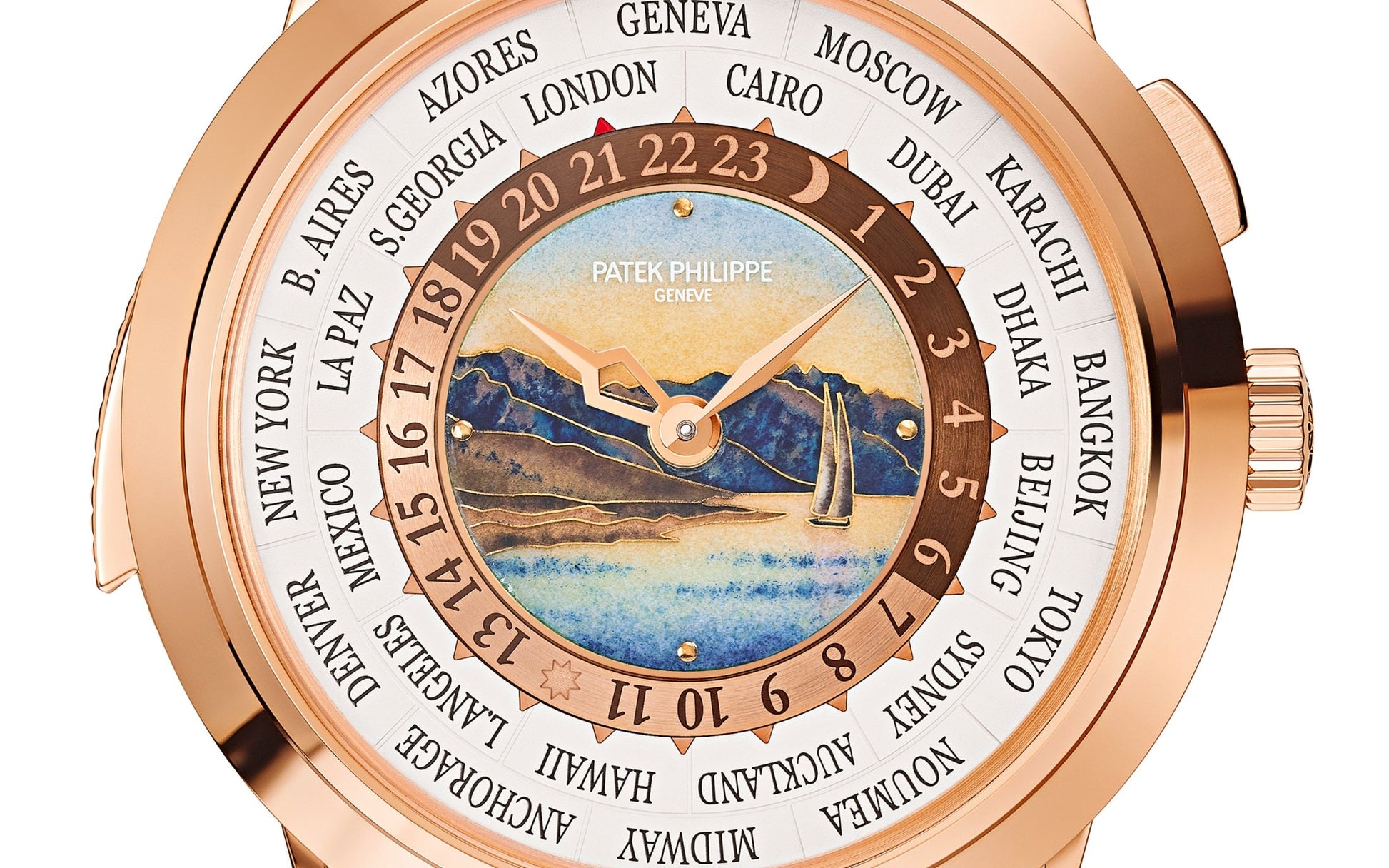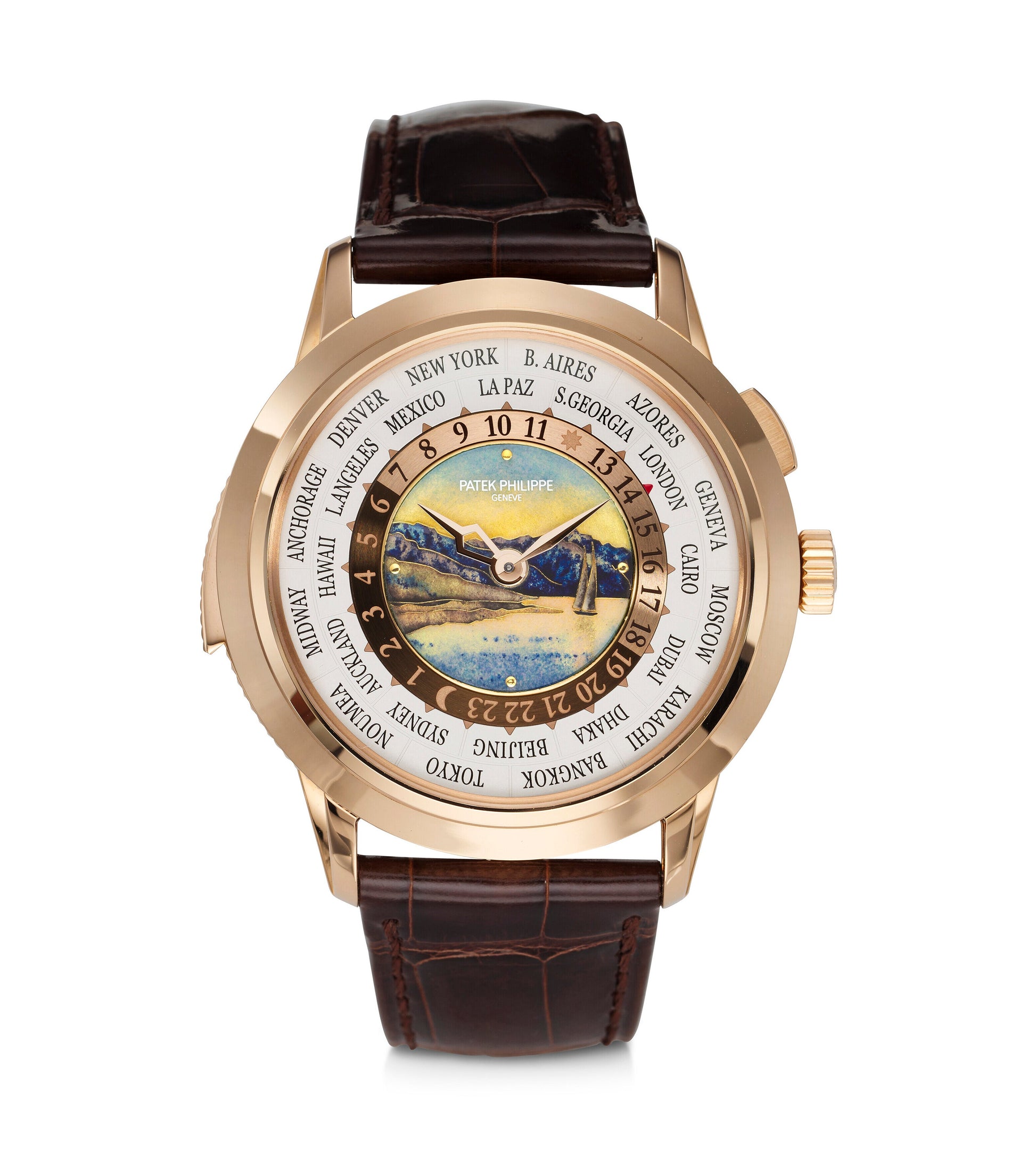 New unworn luxury Patek Philippe Grand Complication watch, 40,2mm, 18k Rose Gold Reference 5531R-012. As the first minute repeater that always strikes local time, the World Time Minute Repeater innovatively unites two of Patek Philippe’s most emblematic complications. The 18k Rose Gold case is adorned with a hand-guilloched hobnail pattern and a dial center in cloisonné enamel depicting the Lavaux vineyards on the shores of Lake Geneva. Also on the outer perimeter of the dial is placed City disk in German silver (maillechort). A closer to dial center is placed 24 hour disk in rose gold. The 18k Rose Gold Skeletonized hour hand and 18k Rose Gold Spear-shaped minute hand. 18k Rose Gold crown with ribbed edge for comfortable grip and logo Patek Philippe. The dial closed by a Scratch-resistant Sapphire Crystal and sapphire-crystal case back (also accompanied by interchangeable). The watch is equipped fixed polished 18k Rose Gold bezel. The watch Patek Philippe Calibre R 27 HU Self-winding mechanical movement, containing 45 Jewels, and has a power reserve of min. 43 hours - max. 48 hours. This model presented on shiny chocolate brown Alligator leather with square scales, hand-stitched and 18k Rose Gold Fold-over clasp. Humidity and dust protected only (not water resistant).