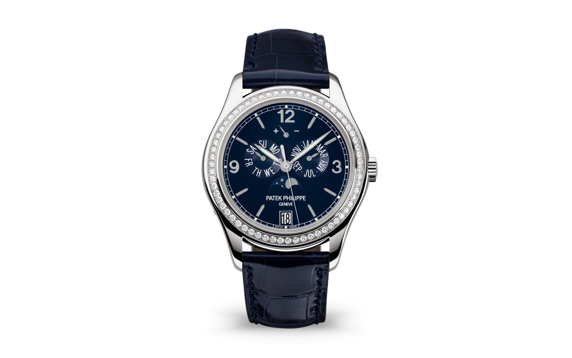 Unworn Luxury Patek Philippe Complication watch. The 18k White Gold Annual Calendar / Moonphases, 39mm, Reference 5147G-001. The model has navy blue lacquered dial the highlight of which are with is notable for its applied 18k White Gold Arabic numerals at the 3, 9 and 12 o'clock positions. The dial also has index hour markers and minute markers around the outer rim. The 18k White Gold hours and minutes hands in leaf design with luminescence. The patented annual calendar is ingenious mechanism. Сonsists four sub-dials: date in aperture located at 6 o'clock and day of the week and month, moonphase and power reserve. Also there is graceful center seconds hand. Polished 18k White Gold crown that with ribbed edge for comfortable grip and logo Patek Philippe are located on the right side of the case. The dial closed by a Scratch-resistant Sapphire Crystal and Scratch-resistant Sapphire Crystal case back. The watch is eye-catching fixed bezel of 18k White Gold with 62 diamonds 0.82 ct . The watch Patek Philippe Caliber 324 S IRM QA LU has Self-winding mechanical movement, containing 36 Jewels, and power reserve min. 35 hours, max. 45 hours. This model presented on shiny dark blue alligator strap hand stitched with 18k White Gold Fold-over clasp. The water resistance is up to 30m/100ft (3 ATM).