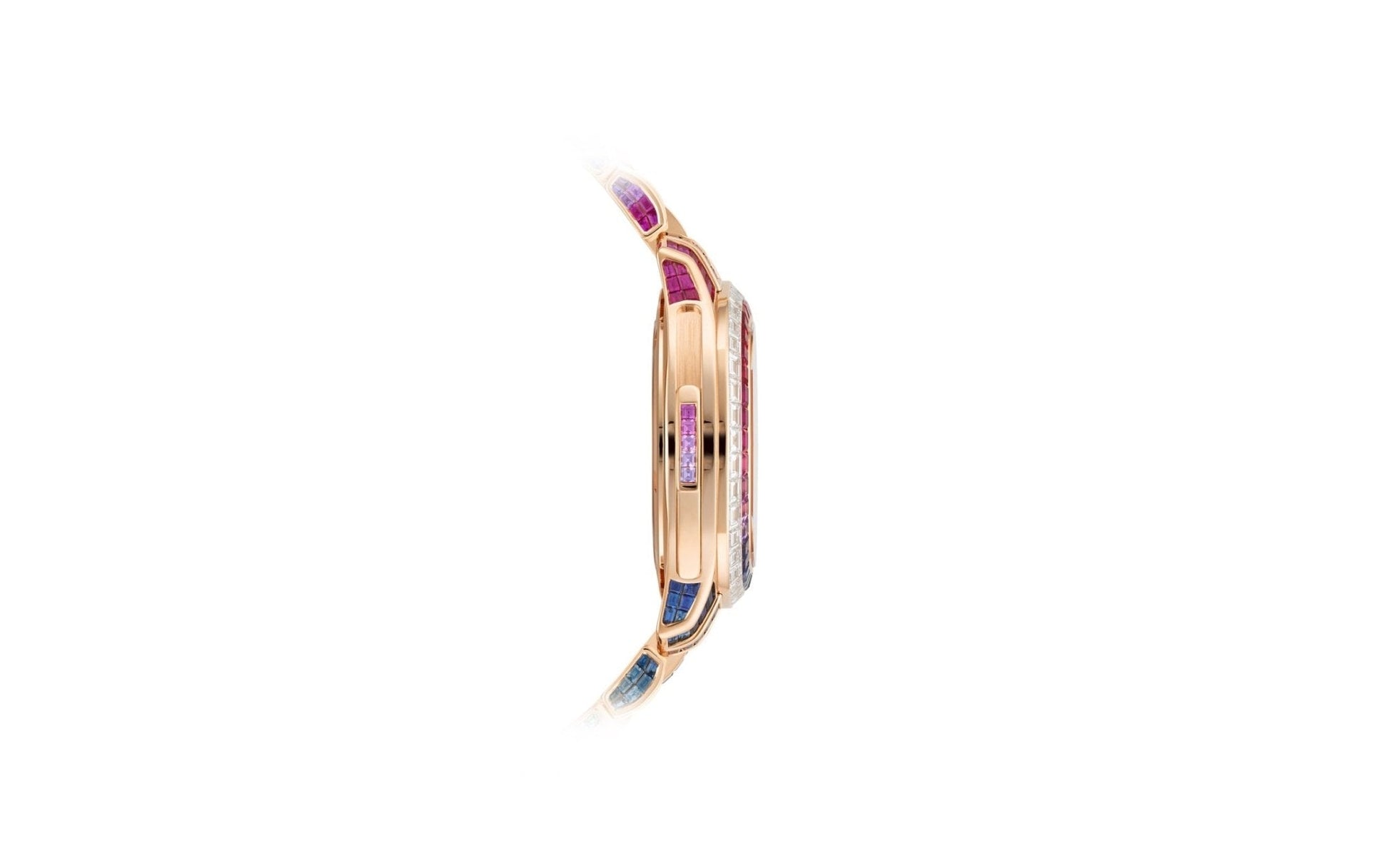 This Haute Joaillerie minute repeater is paved with 130 baguette-cut diamonds (8.66 cts) on the dial and 779 multicolored baguette-cut sapphires (45.05 cts) forming a rainbow on the bezel, case sides and bracelet using the sophisticated "invisible setting" technique.