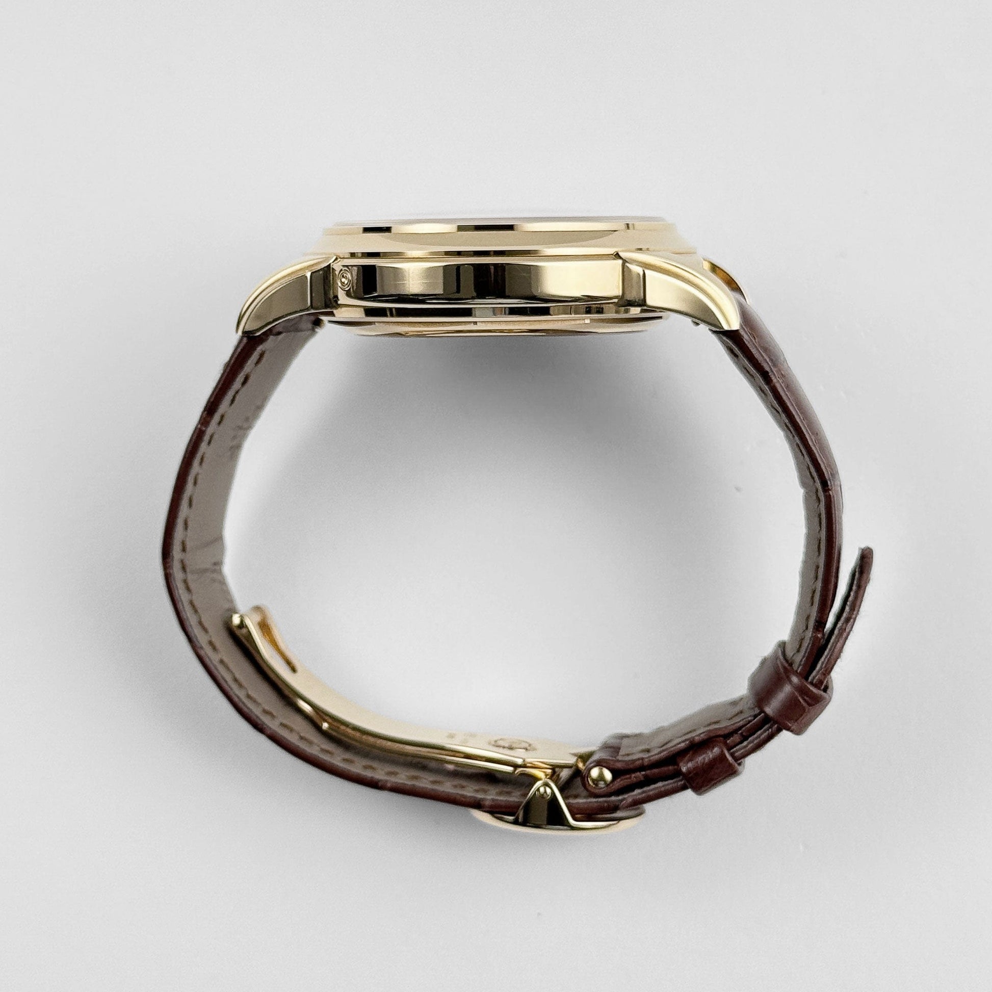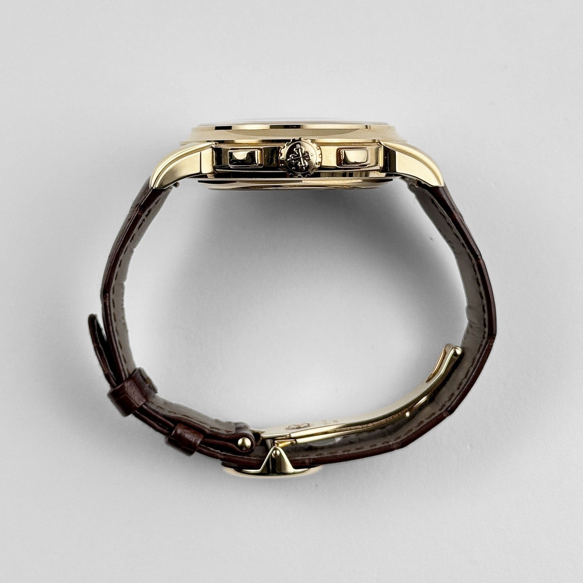 The Patek Philippe Grand Complications 5270J-001 Perpetual Chronograph in yellow gold with a white dial combines iconic design with sophisticated functionality. Featuring both a perpetual calendar and chronograph complications, this timepiece offers precision and versatility. The warm yellow gold case beautifully complements the crisp white dial, creating a refined contrast that enhances its timeless appeal. A highly sought-after model, this watch is perfect for collectors who appreciate both horological complexity and luxurious craftsmanship.