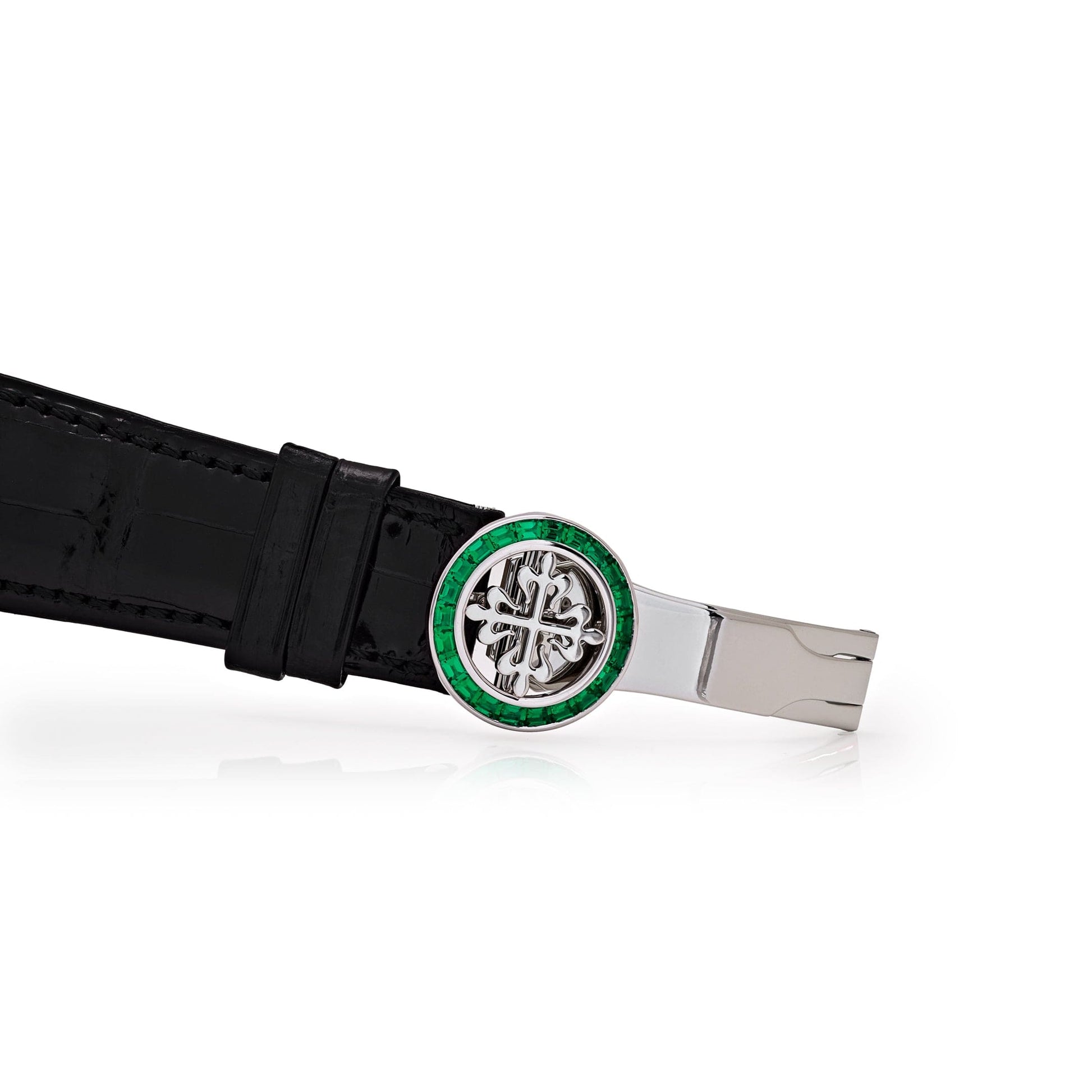 The Patek Philippe Grand Complications 5271/13P-001 is a masterpiece of haute horology, blending the intricate craftsmanship of a perpetual calendar chronograph with an opulent design. Crafted in platinum, its 41mm case is adorned with a breathtaking emerald-set bezel, adding a striking contrast to the deep black lacquered dial. The emeralds, meticulously selected and set by Patek Philippe’s artisans, elevate this already prestigious timepiece into the realm of high jewelry.