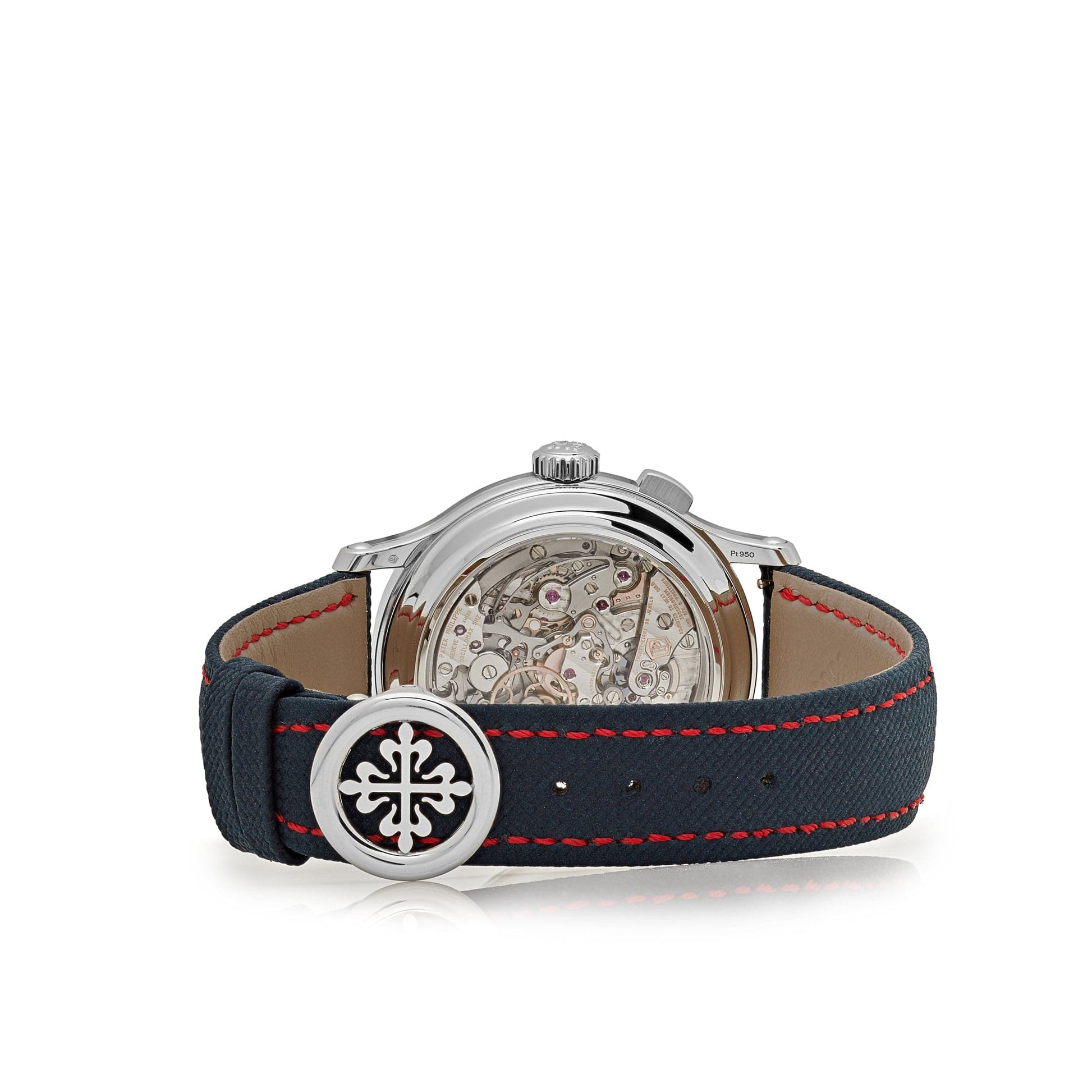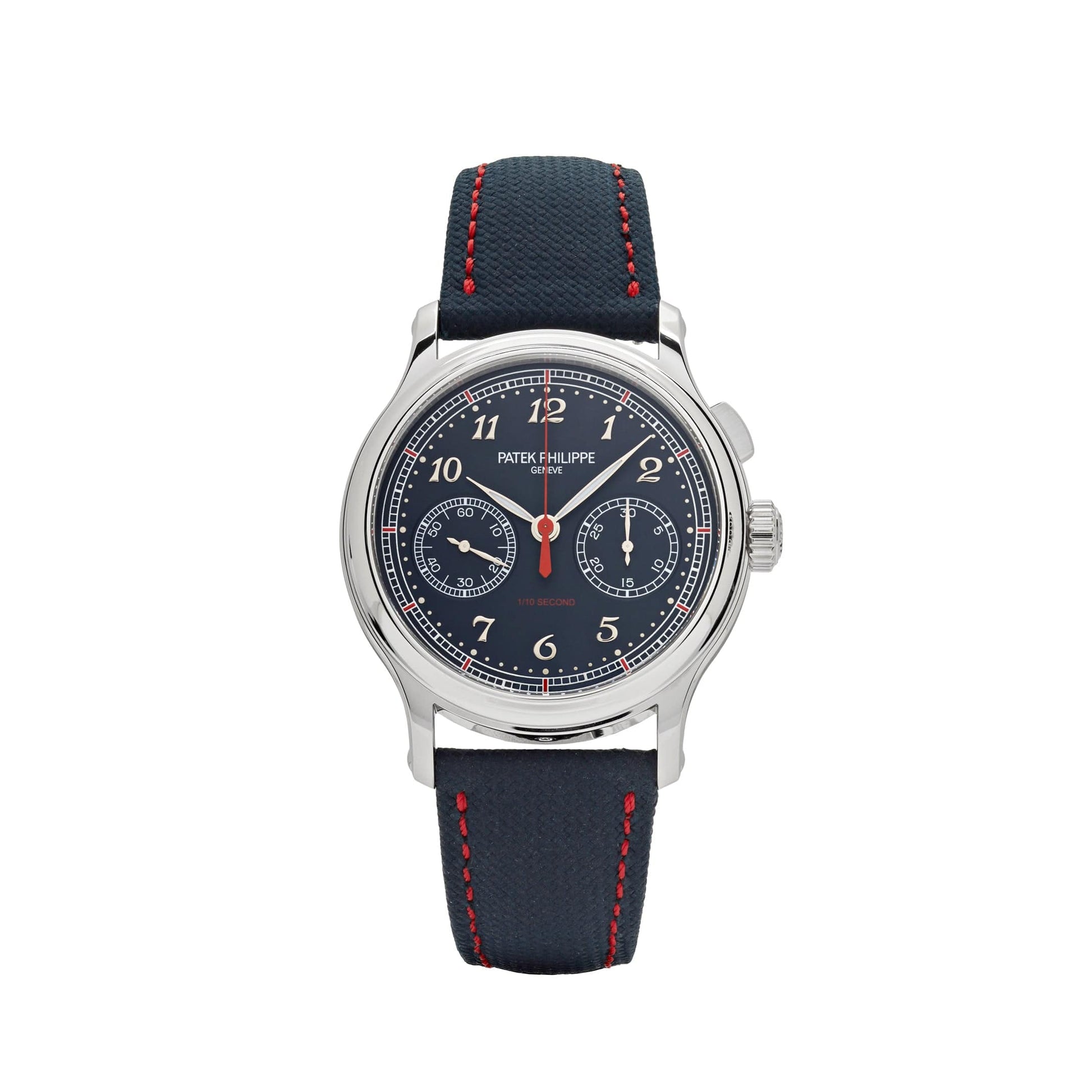 This Patek Philippe Grand Complications presents a new high-performance manually wound movement that measures and displays 1/10 th of a second. The platinum case measures 41mm surrounding a blue varnished dial featuring gold applied Breguet numerals. The watch comes on a navy blue calfskin, embossed with fabric pattern, hand-stitched, with a fold-over clasp.