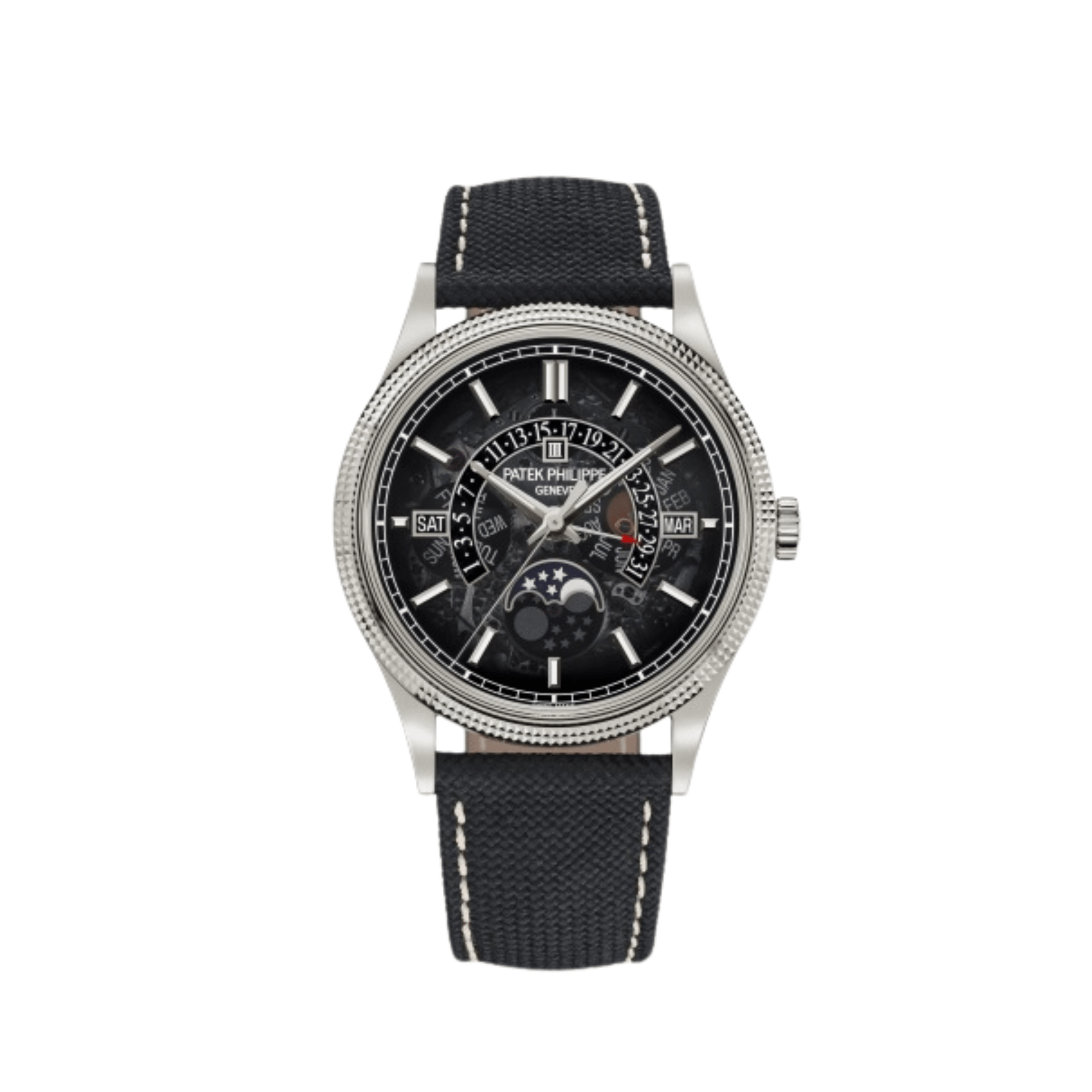The Patek Philippe Grand Complication 6159G-001 is a remarkable new interpretation of the perpetual calendar, blending contemporary styling with mechanical mastery. Crafted in 18k white gold, the watch features a perfectly balanced 39.5mm case, making it exceptionally wearable while retaining the gravitas expected of Patek Philippe’s Grand Complication line. At the heart of this timepiece lies a sapphire crystal dial with gray metallization and a subtle black-gradient rim, allowing a partial view of the meticulously finished movement beneath—a strikingly modern take on classic watchmaking.