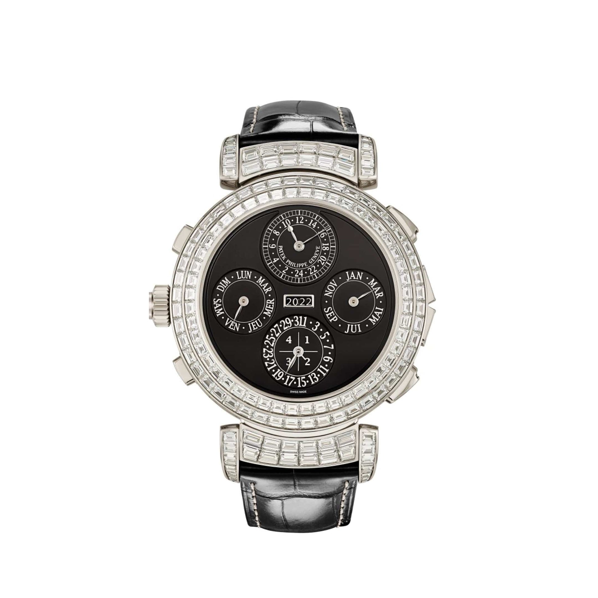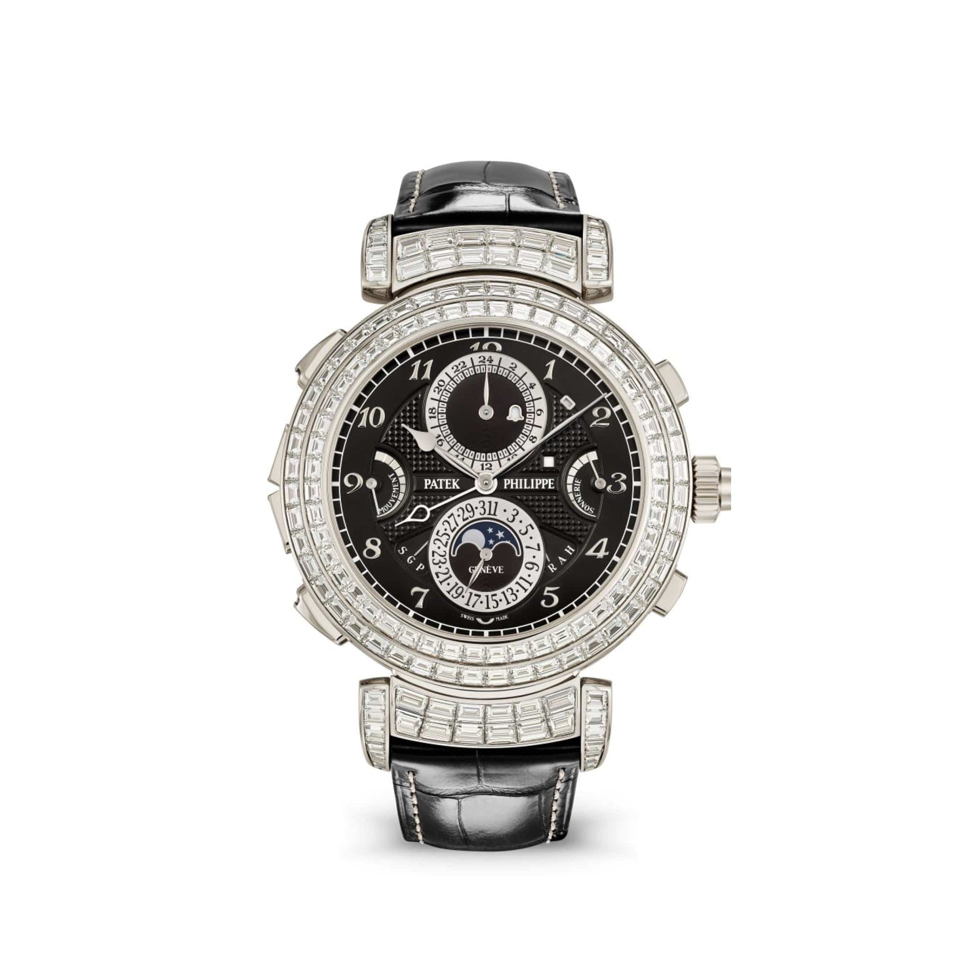 The Patek Philippe Grand Complications Grandmaster Chime 6300/400G-001 is crafted in a 49.4mm white gold case and styled on a leather strap. The black opaline dial is highlighted by glamorous set with 409 baguette-cut diamonds on the case and bezel. The watch features over 20 complications shared between the dual-faced dials. From Grande and petite sonnerie to perpetual calendar timekeeping, this Haute Joaillerie version has elevated one of the most complicated timepieces to date.