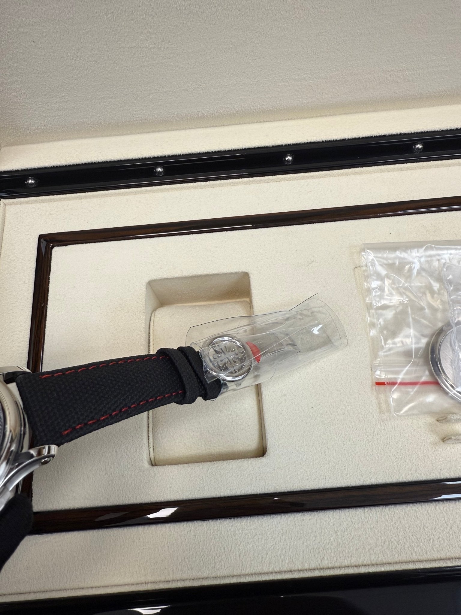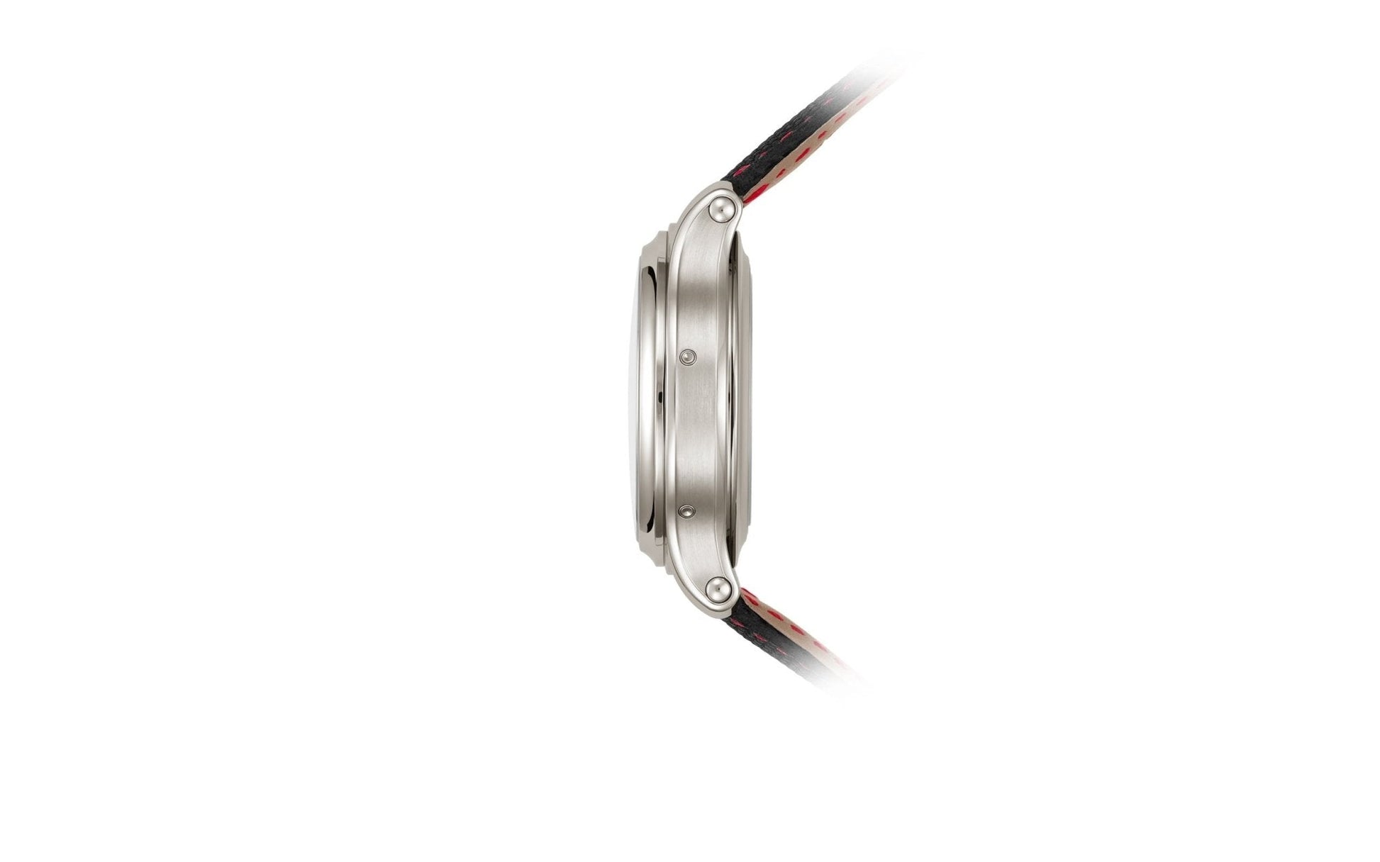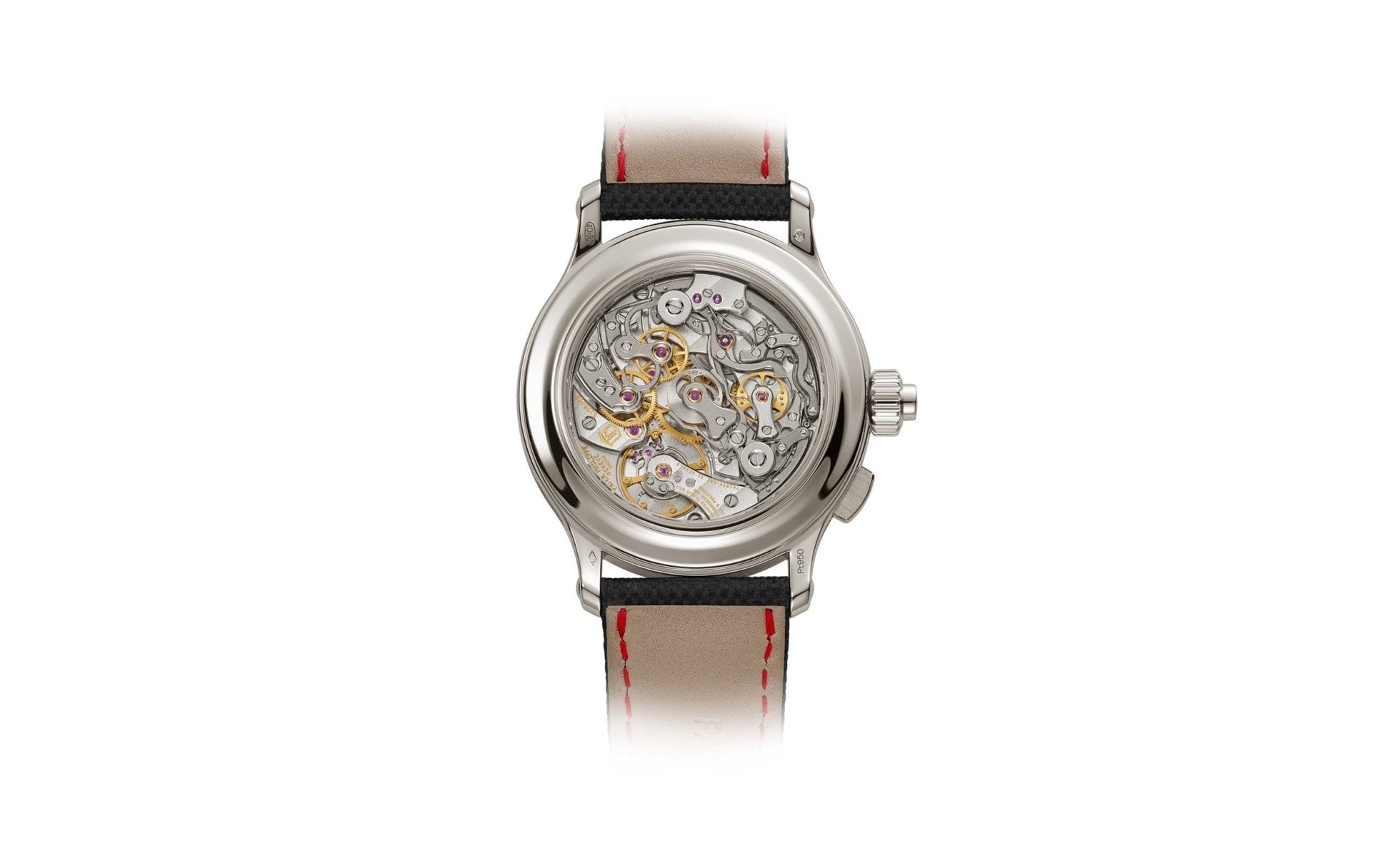 Its platinum case is endowed with the caliber CHR-27-525 PS Q, the thinnest split-seconds chronograph movement with perpetual calendar ever built. It is crafted to venerable traditions. The charcoal-colored dial with a black gradation and red varnished chronograph hands reflects a sporty and contemporary style echoed on the strap.