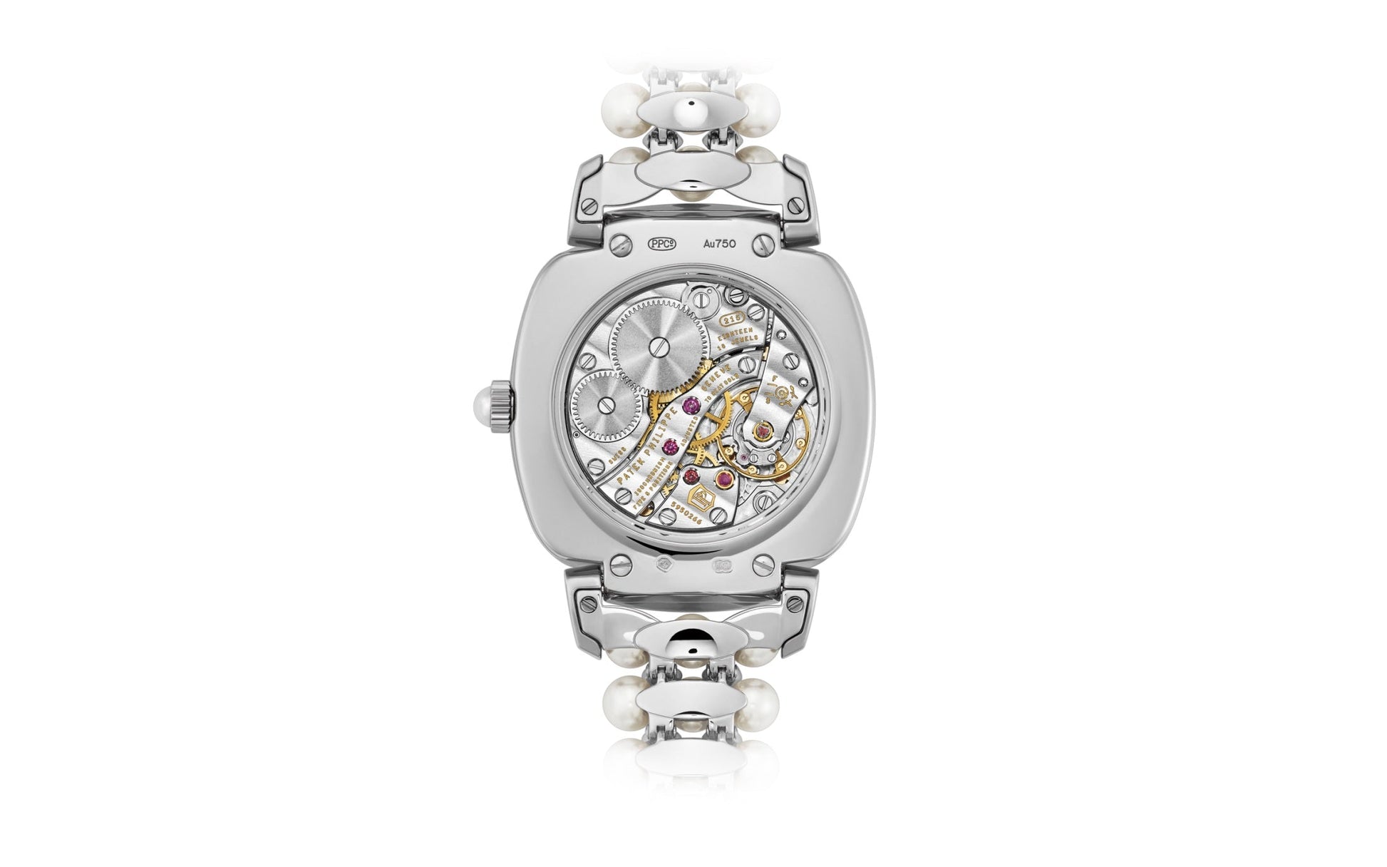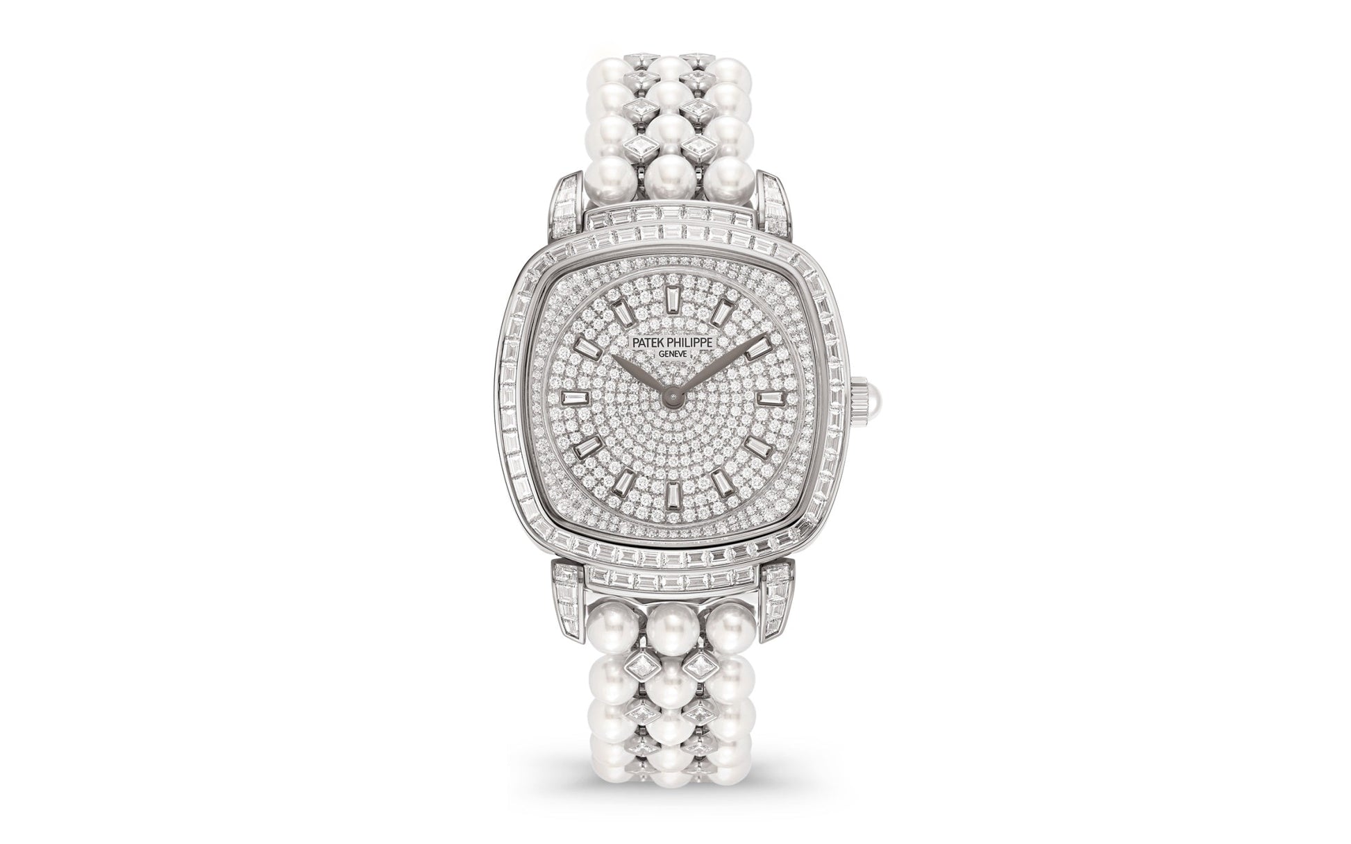 Patek Philippe Ladies Gondolo Haute Joaillerie, 18kt White Gold set with diamonds and Akoya pearls, 31 × 34.8mm, Ref# 7042/100G-010