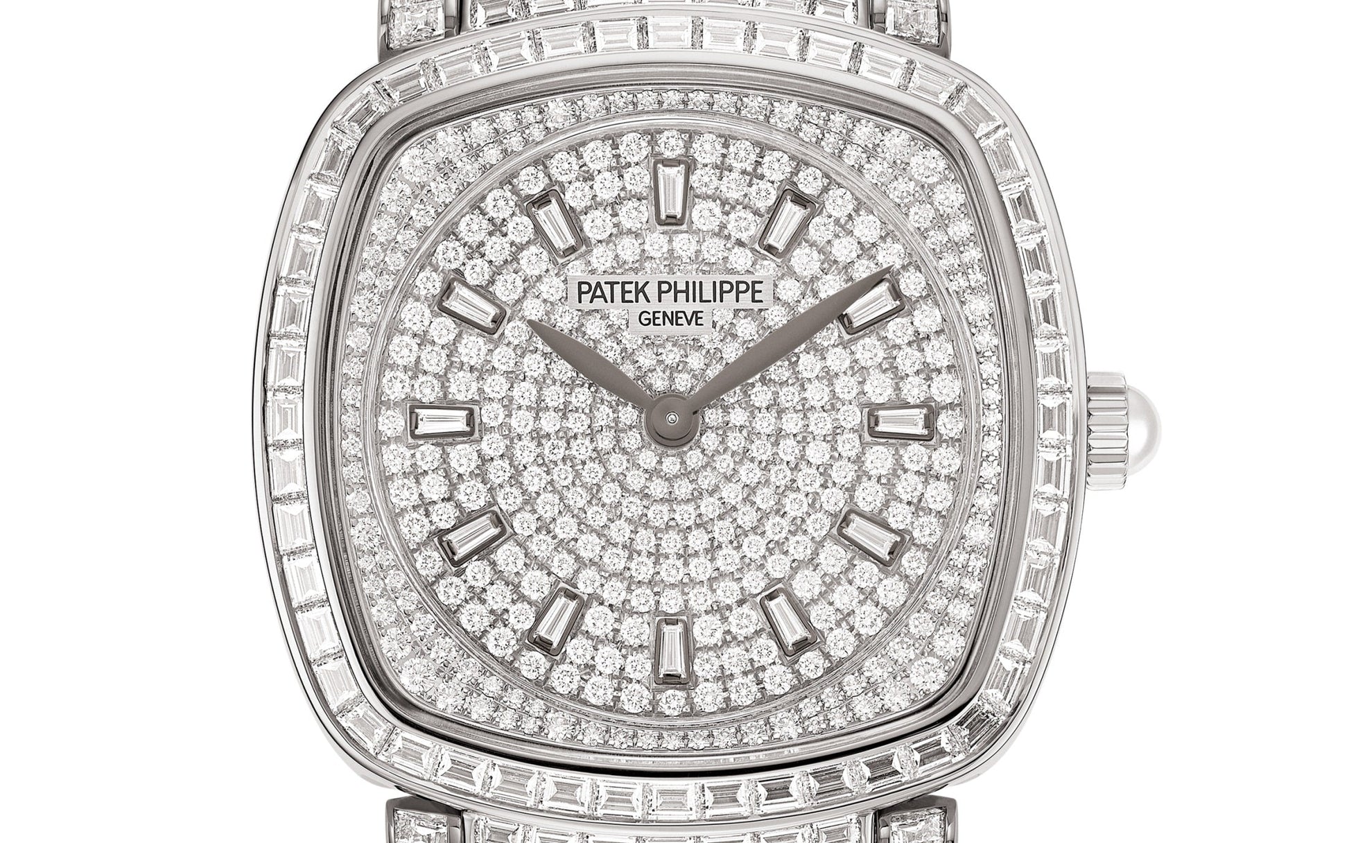 Ladies Watch Patek Philippe Gondolo Haute Joaillerie, 18kt White Gold, 31 × 34.8mm, Reference 7042/100G-010 - luxury, tenderness and fabulous beauty. The one of Patek's newest and most striking women’s watches. Them Art Deco style cushion-shaped case with rounded corners. The Dial flange set with 108 diamonds weighing a total of 0.33 carats, which in a very unusual fashion around its him, give a truly refined and unique look. The 18kt White Gold dial shines 251 diamonds (~0.73 carats), arranged in a circle, among which 12 trapezoid-cut index hour markers (~0.14 carats) stand out. Thanks to the gray coloring, the elegant minute and hour hands are clearly visible on the sparkling dial. A polished 18kt White Gold crown with a ribbed edge for easy grip and encrusted with a cabochon of Akoya pearls is located on the right side of the case. The dial closed by a Scratch-resistant Sapphire Crystal. Sapphire-crystal too case back, which allows of the case, allows you to see the magical work of the movement. The watch features fixed 18kt White Gold bezel. Together with the ears, it is set with a bewitching 78 baguette-cut diamonds (~2.33 carats). This model has caliber Patek Philippe Caliber 215, a mechanical manually wound movement containing 18 Jewels, with a power reserve of 44 hours. A luxurious 18k White Gold bracelet with 78 Akoya pearls (~48.85 carats) and decorative white gold links set with 48 princess-cut diamonds (~2.28 carats) is an extension of this magical watch. And the unique 18k White Gold folding clasp, adorned with 55 diamonds (~0.23 carats), puts a beautiful end to all this magnificence. The water resistance is up to 30m/100ft (3 ATM)..
