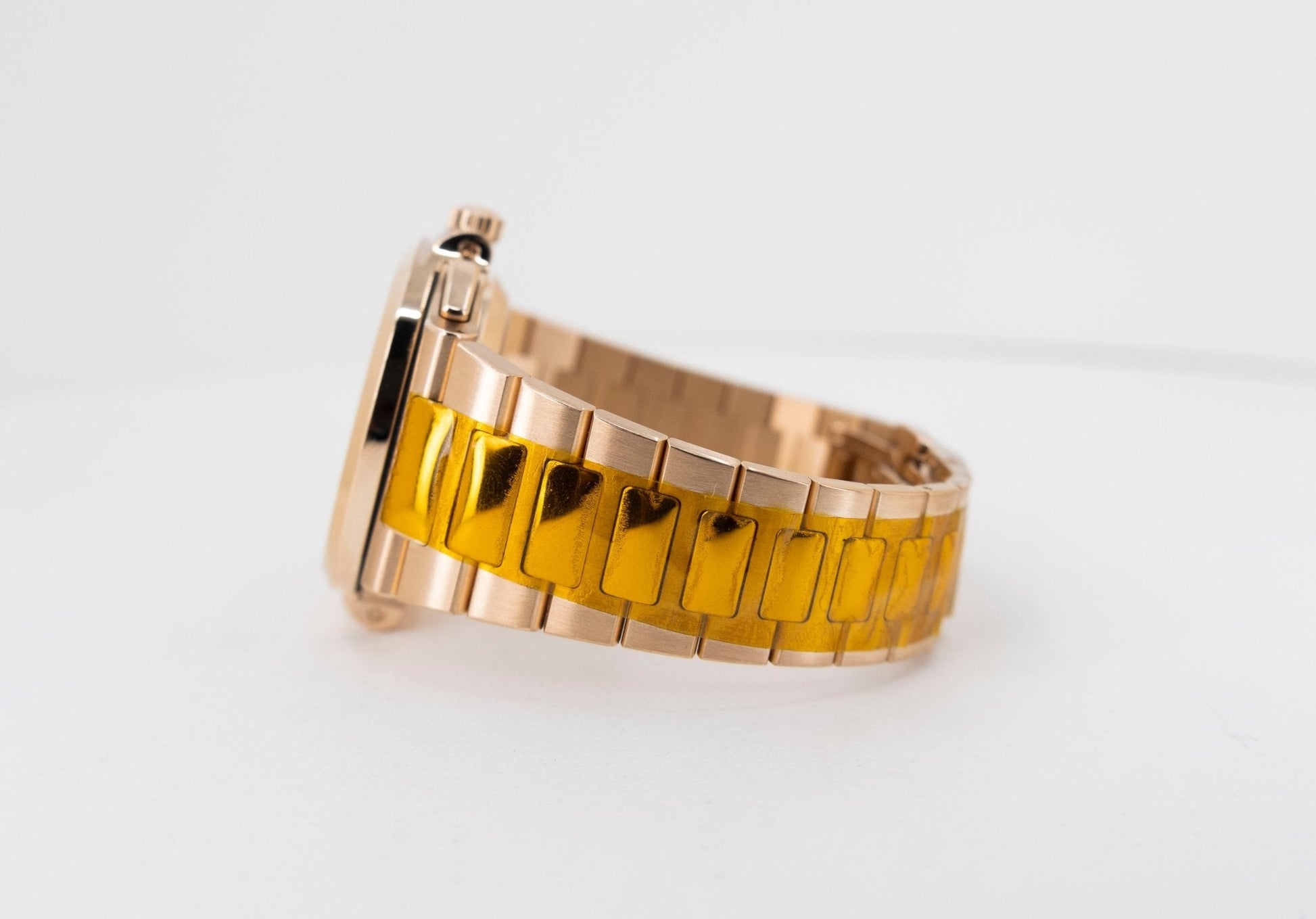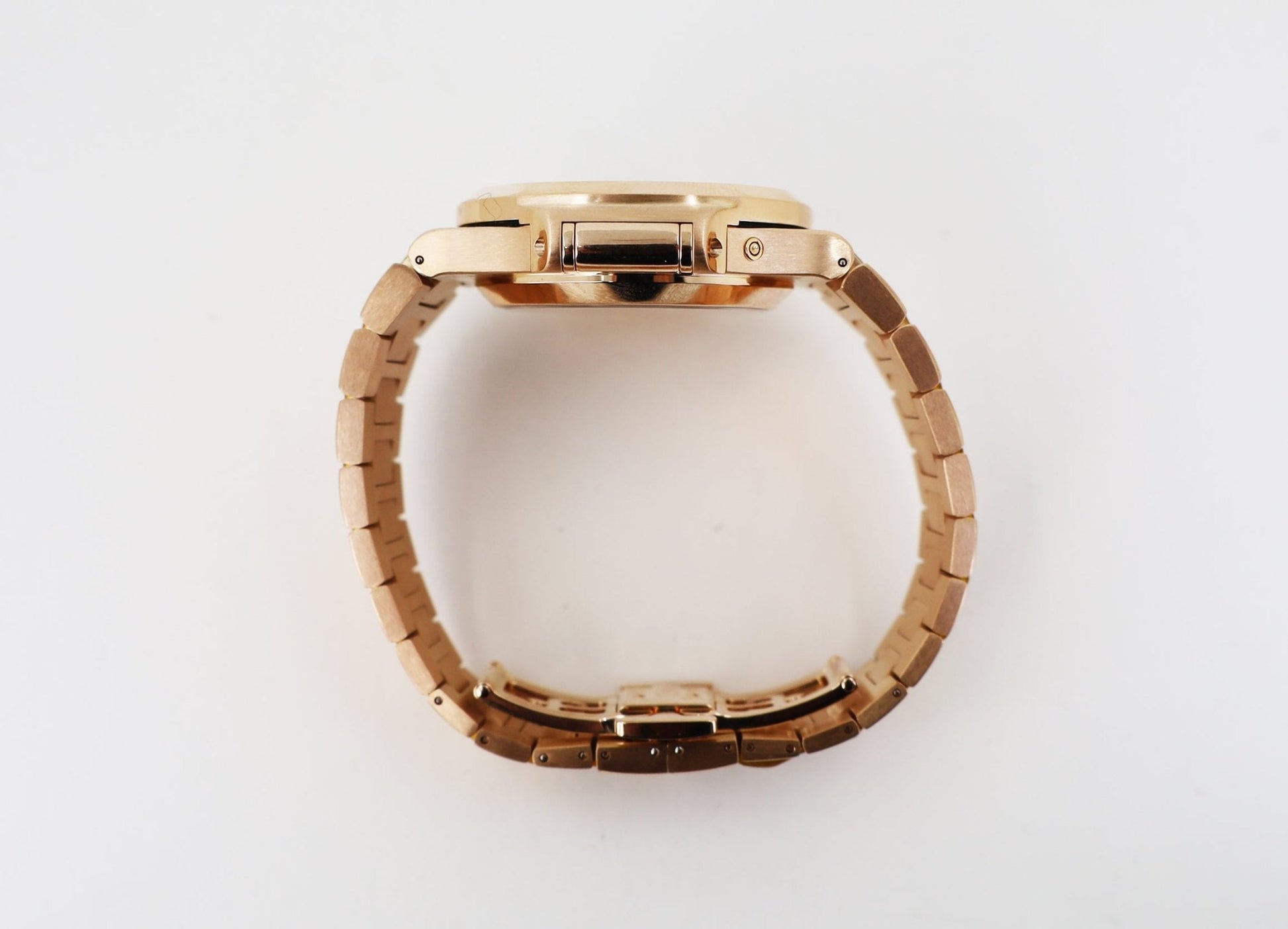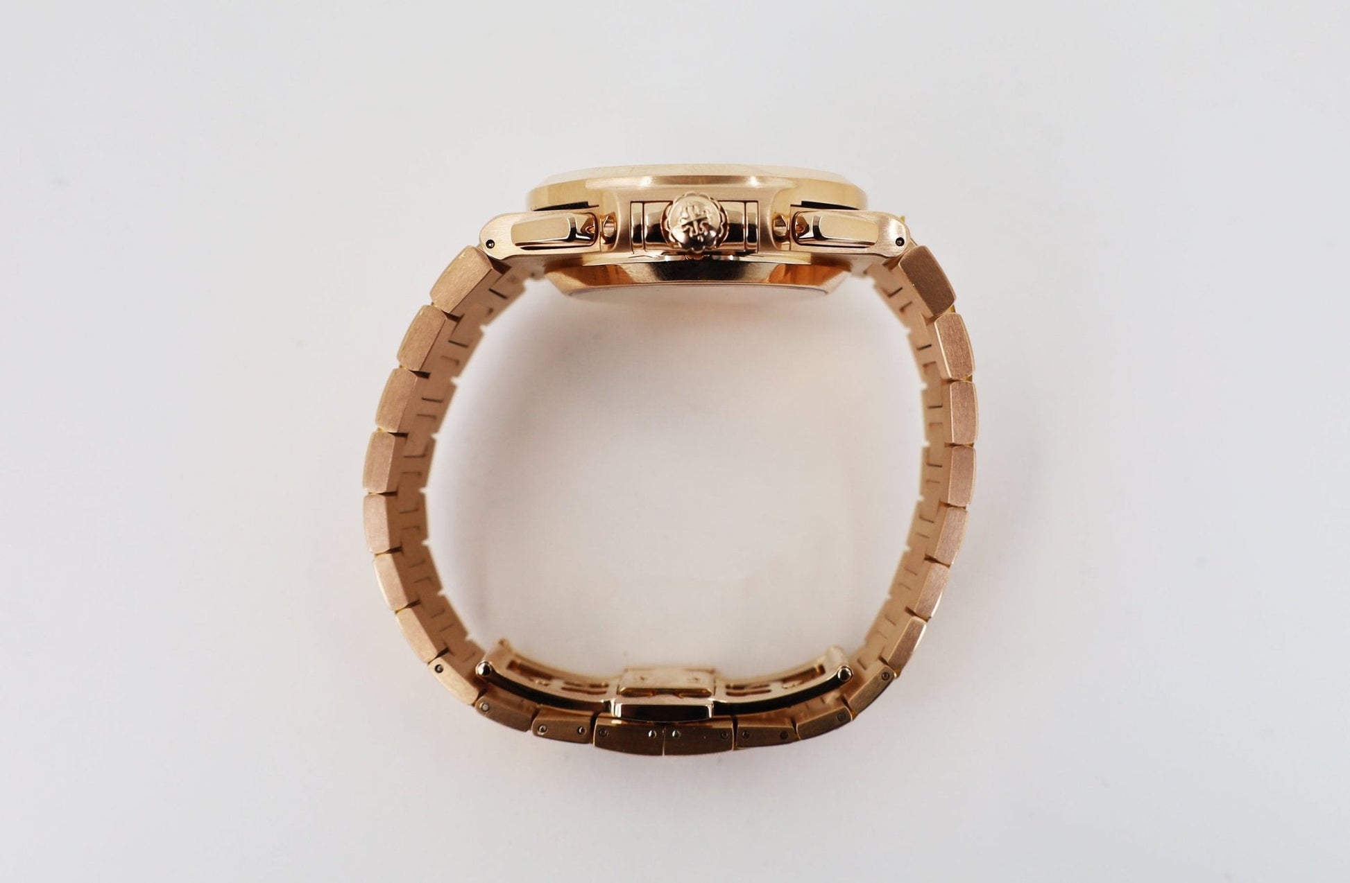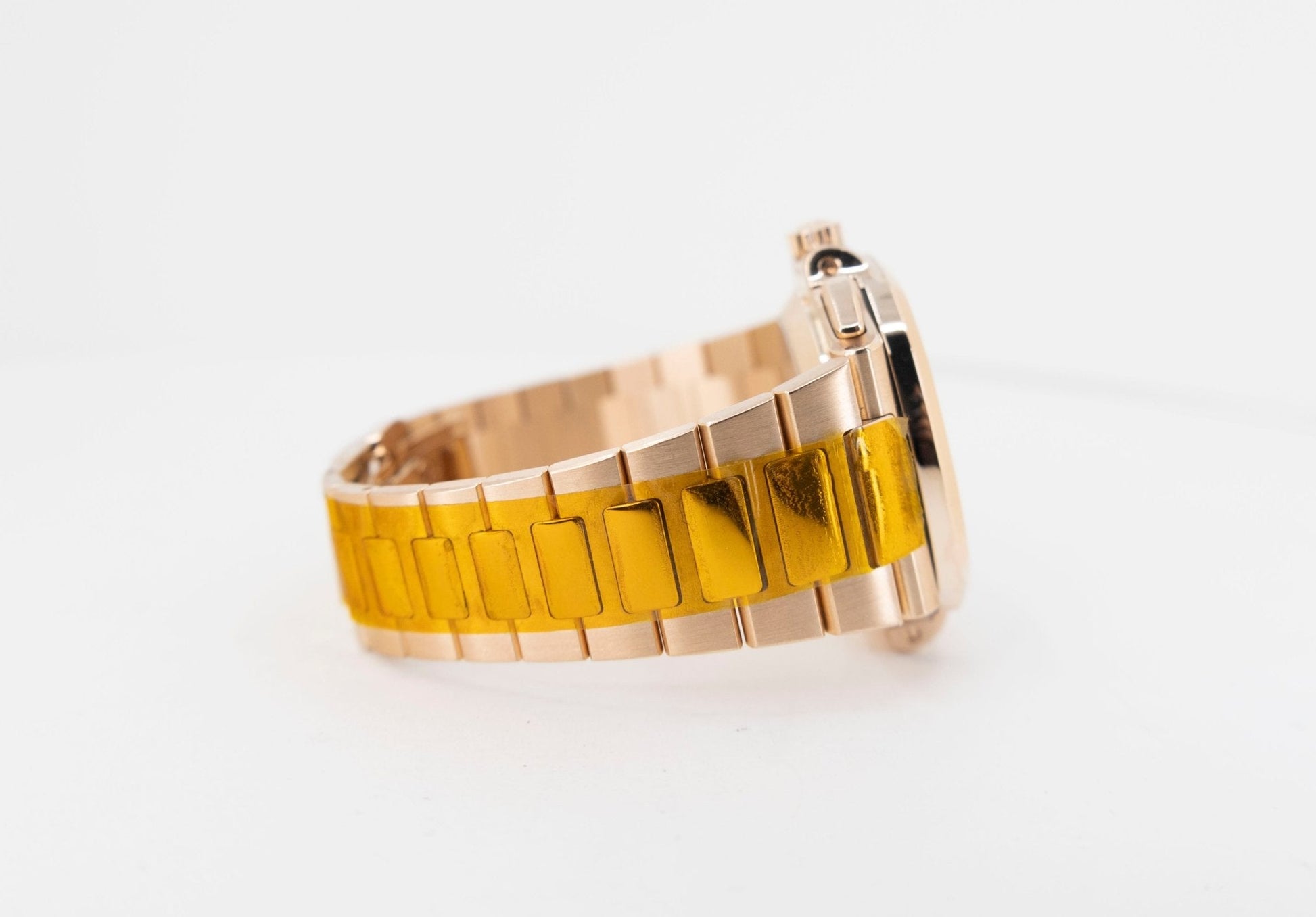 40.5mm 18K rose gold case, sapphire crystal back, black gradient dial with gold applied hour markers with luminescent coating, self-winding Caliber CH 28-520 C movement with date, chronograph, 60-minute and 12-hour monocounter at 6 o’clock, sweep seconds hand (chronograph hand), approximately 45-55 hours of power reserve, 18K rose gold bracelet Nautilus fold-over clasp. Water resistant to 120 meters.