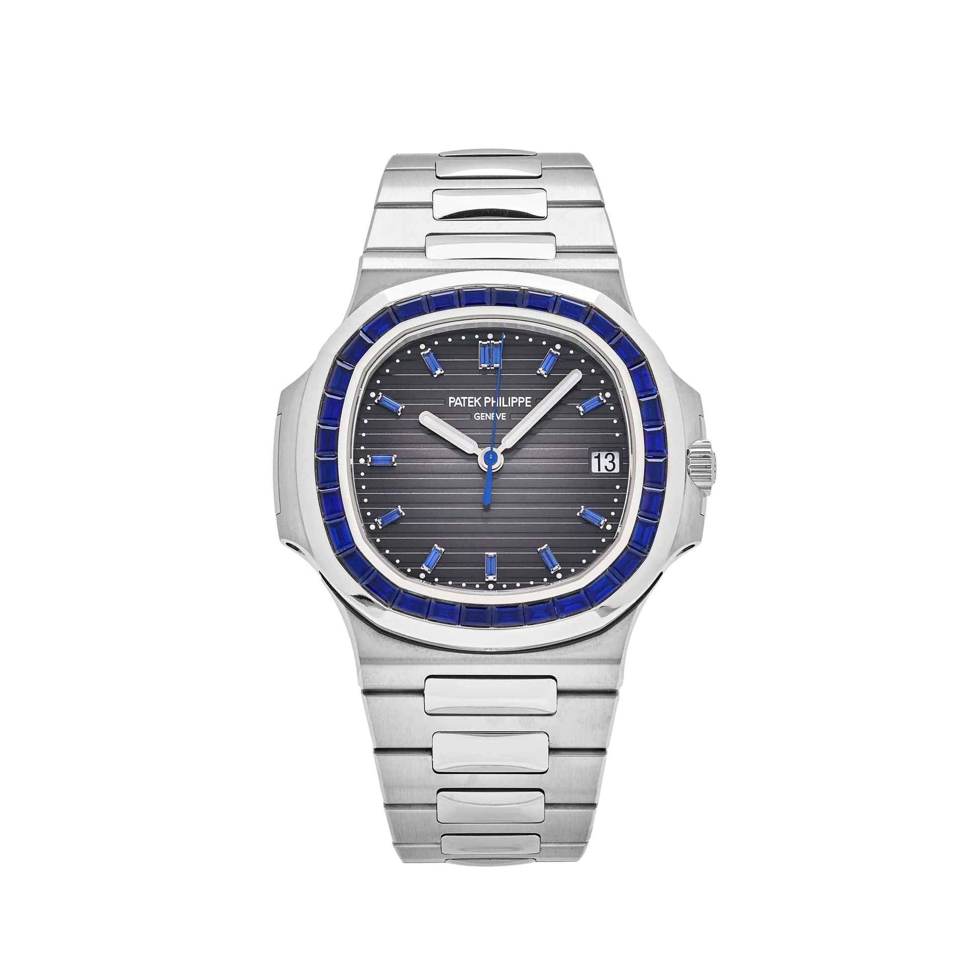 The gradient blue dial is a standout feature, accented by baguette-cut blue sapphire hour markers that elevate the watch's elegance and rarity. Subtle yet striking, these details enhance the timeless Nautilus aesthetic while adding a layer of opulence. A discreet date window at 3 o’clock blends seamlessly into the design, ensuring functionality without distraction.