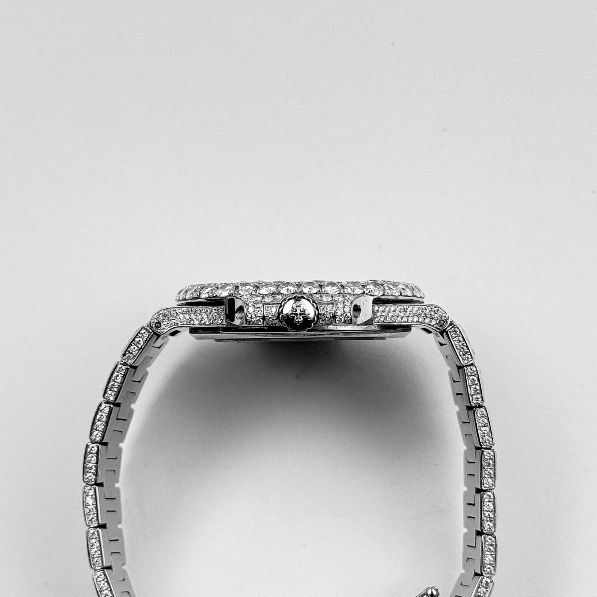 This Patek Philippe Nautilus 5711/1A-011 timepiece features a 40mm x 38mm stainless steel case surrounding a brilliant after market diamond pavéd dial with luminous hours and hands. It is finished on a stainless steel after market diamond pavé bracelet and fold-over clasp.