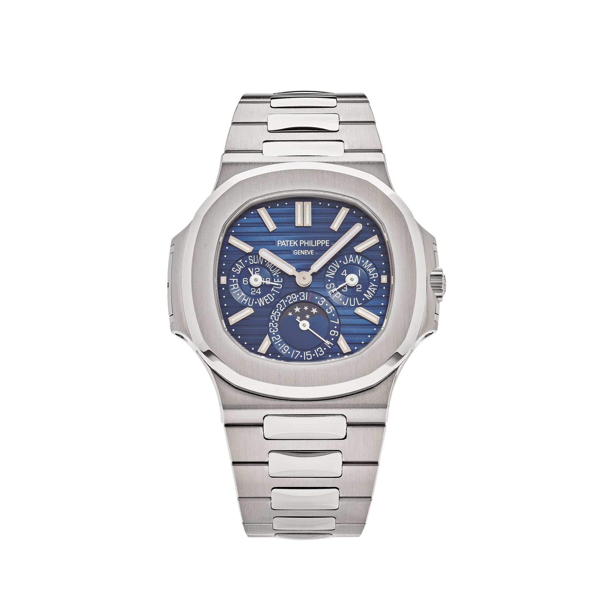 The Patek Philippe Nautilus Perpetual Calendar Moon Phase 5740/1G-001 stands as an epitome of horological excellence, blending the iconic design of the Nautilus collection with the intricate functionality of a perpetual calendar. Crafted in 18k white gold, this timepiece exhibits a harmonious balance between sportiness and sophistication.