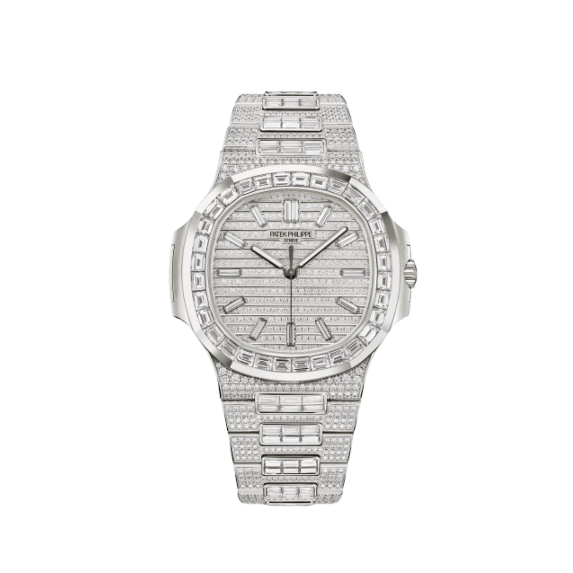 The dial alone features 297 brilliant-cut diamonds (1.33 ct) and 13 baguette diamond hour markers (0.48 ct), offering a radiant backdrop while preserving legibility through the perfectly cut and placed markers. The case is set with 100 brilliant-cut diamonds (0.74 ct), while the bezel glows with 32 baguette diamonds (4.84 cts). The integrated bracelet is a masterpiece in itself, adorned with 888 brilliant-cut diamonds (4.36 cts) and 150 baguette diamonds (7.95 cts). Behind the brilliance lies the self-winding Caliber 26‑330 S C, delivering both date functionality and impeccable timekeeping. The Nautilus 5811/1460G-001 is not just a watch—it is a dazzling statement of artistry, exclusivity, and Patek Philippe’s unparalleled mastery in gem-set watchmaking.