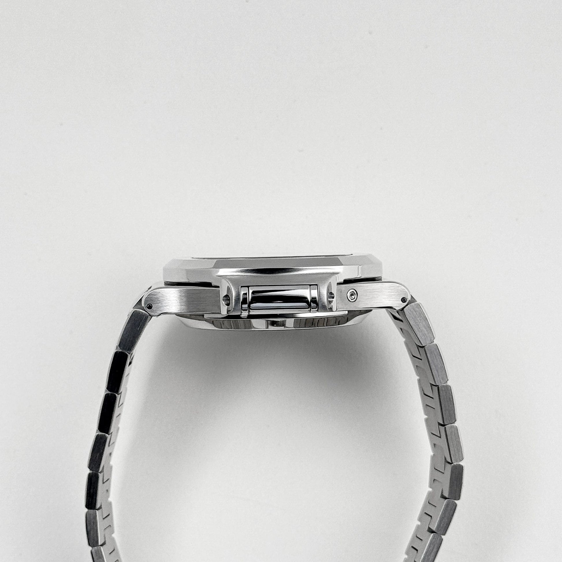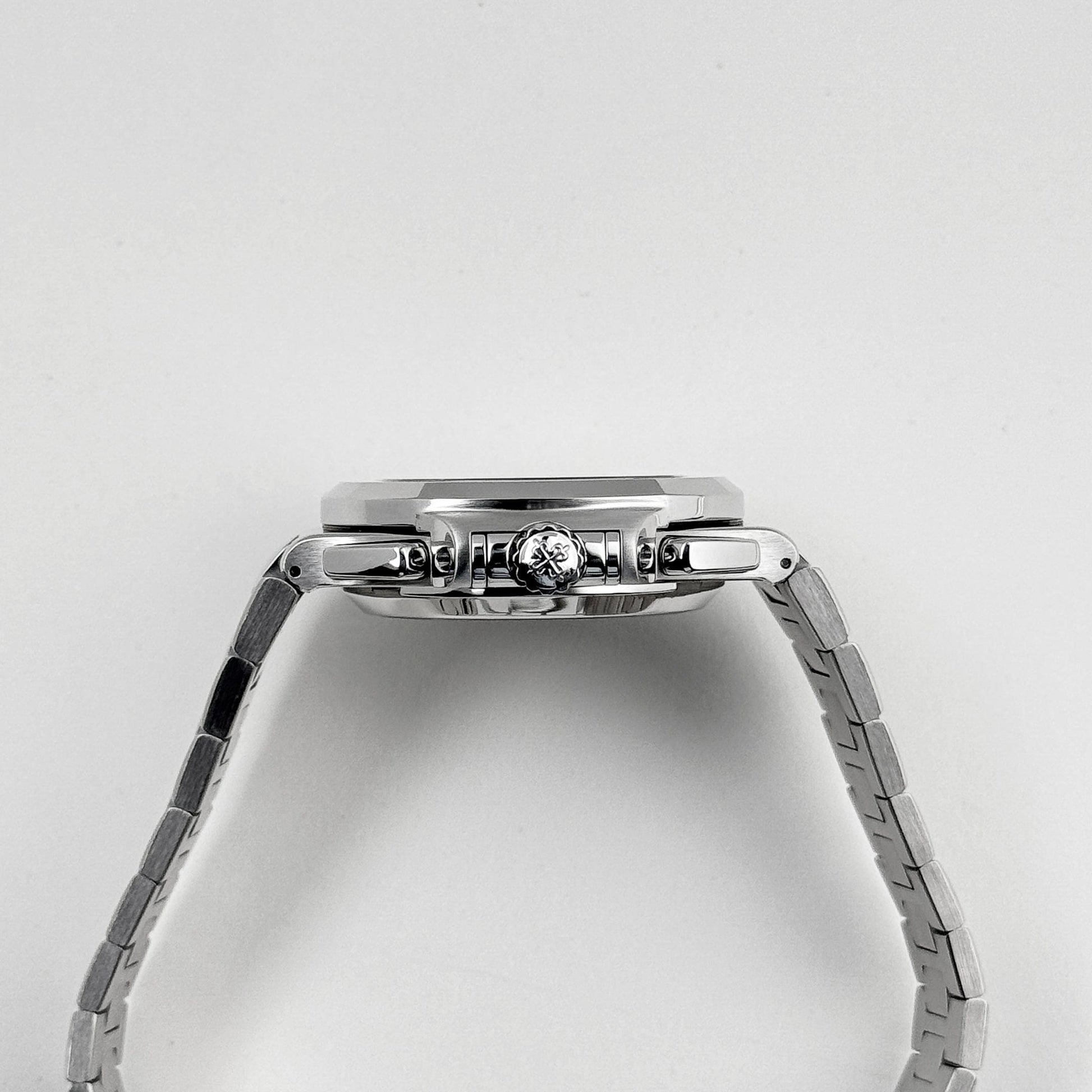 Powered by the self-winding Caliber CH 28-520 C, the watch offers a flyback chronograph function, vertical clutch for smoother operation, and a 55-hour power reserve. With its robust build, integrated steel bracelet, and clean grey aesthetic, the 5980/1A-014 remains one of the most coveted stainless steel chronographs in the Nautilus lineup, celebrated for its blend of technical prowess and everyday wearability.