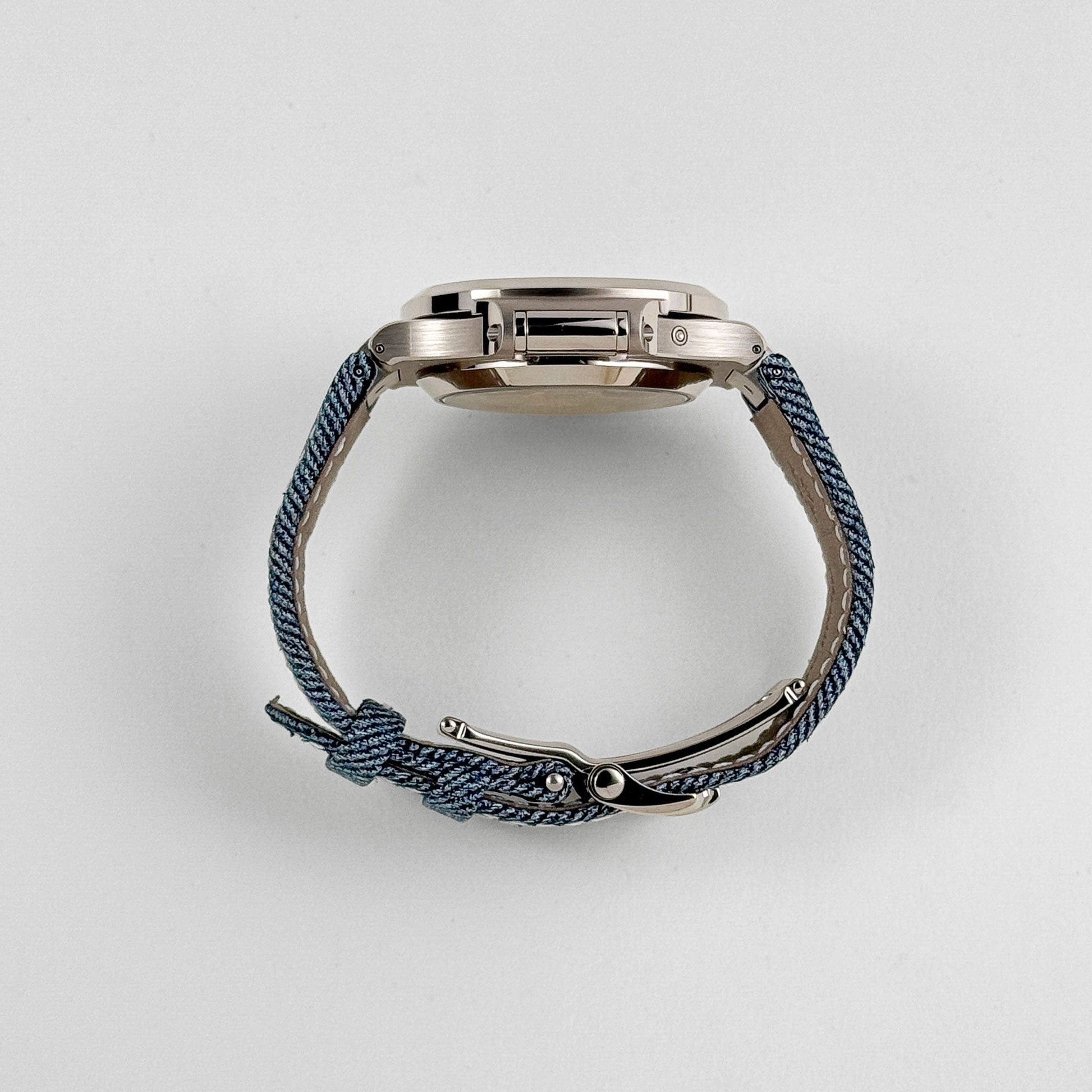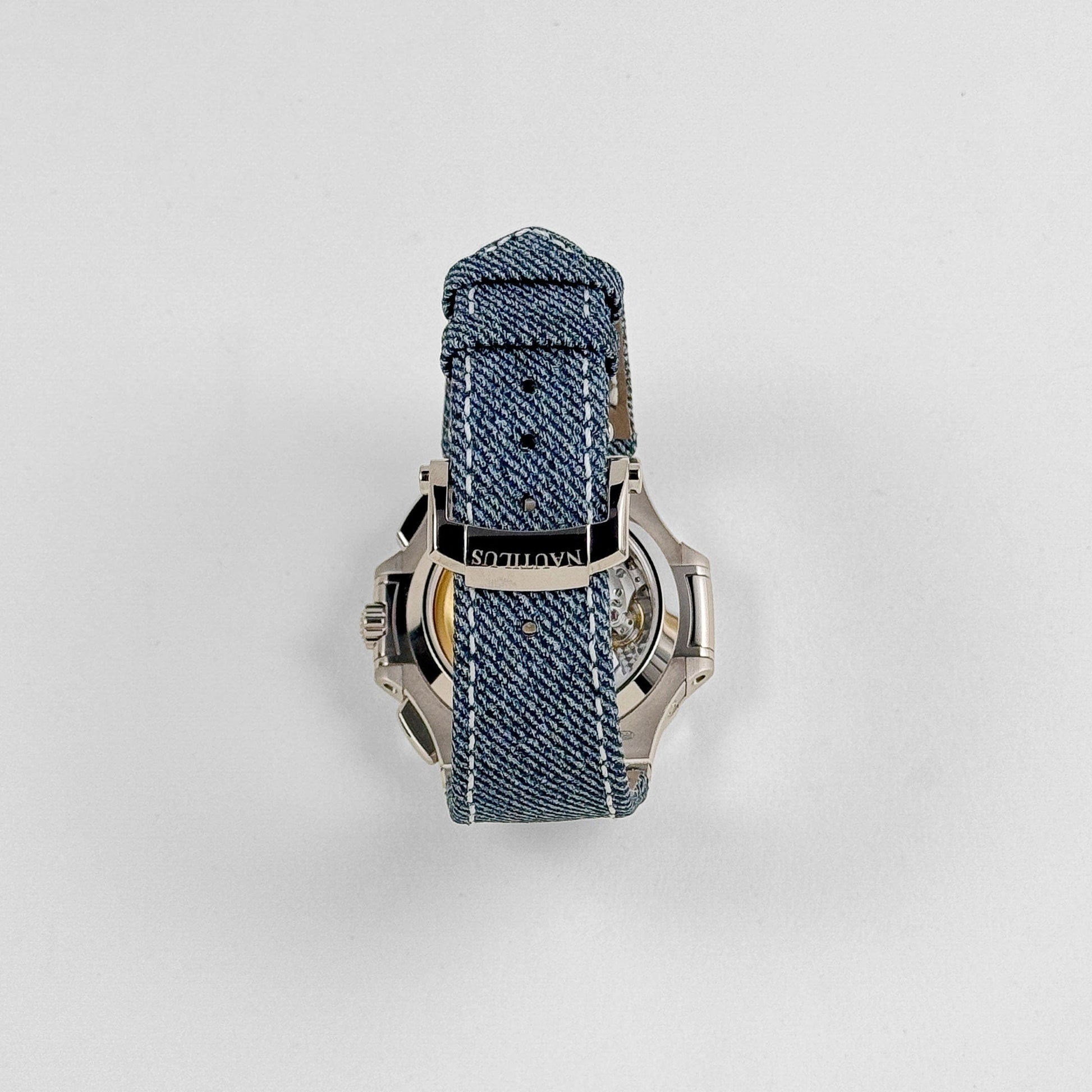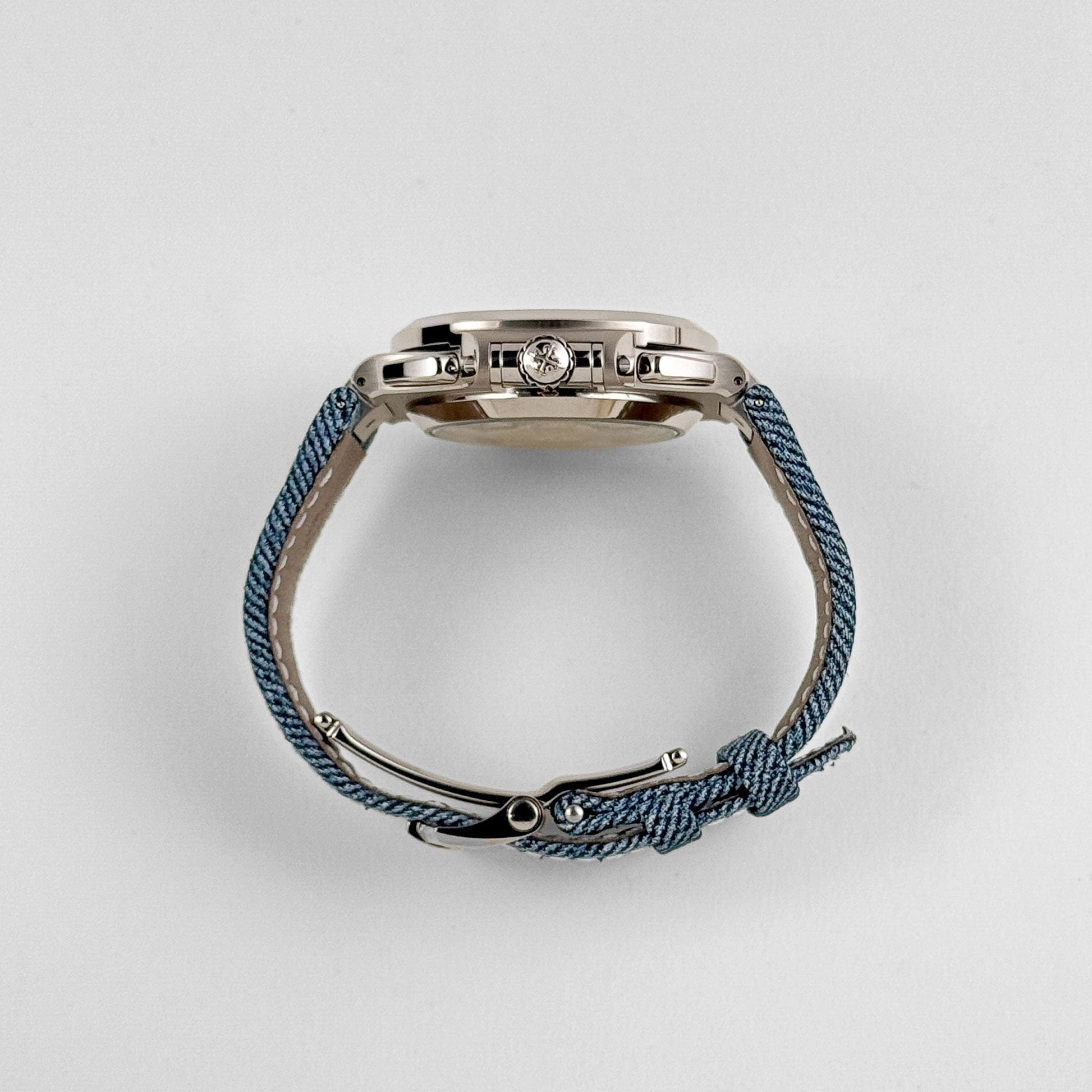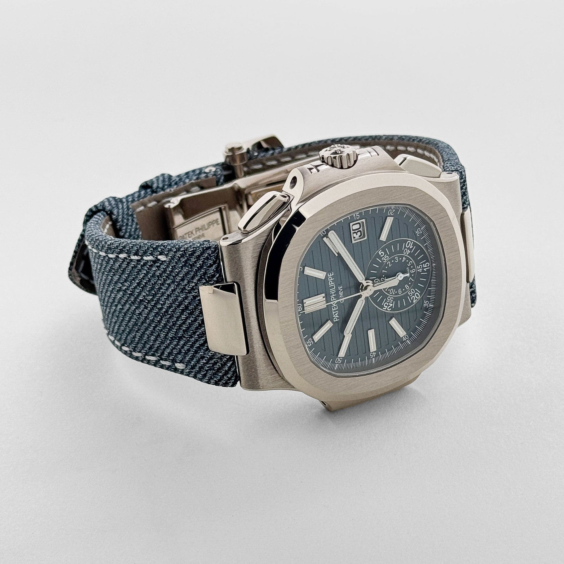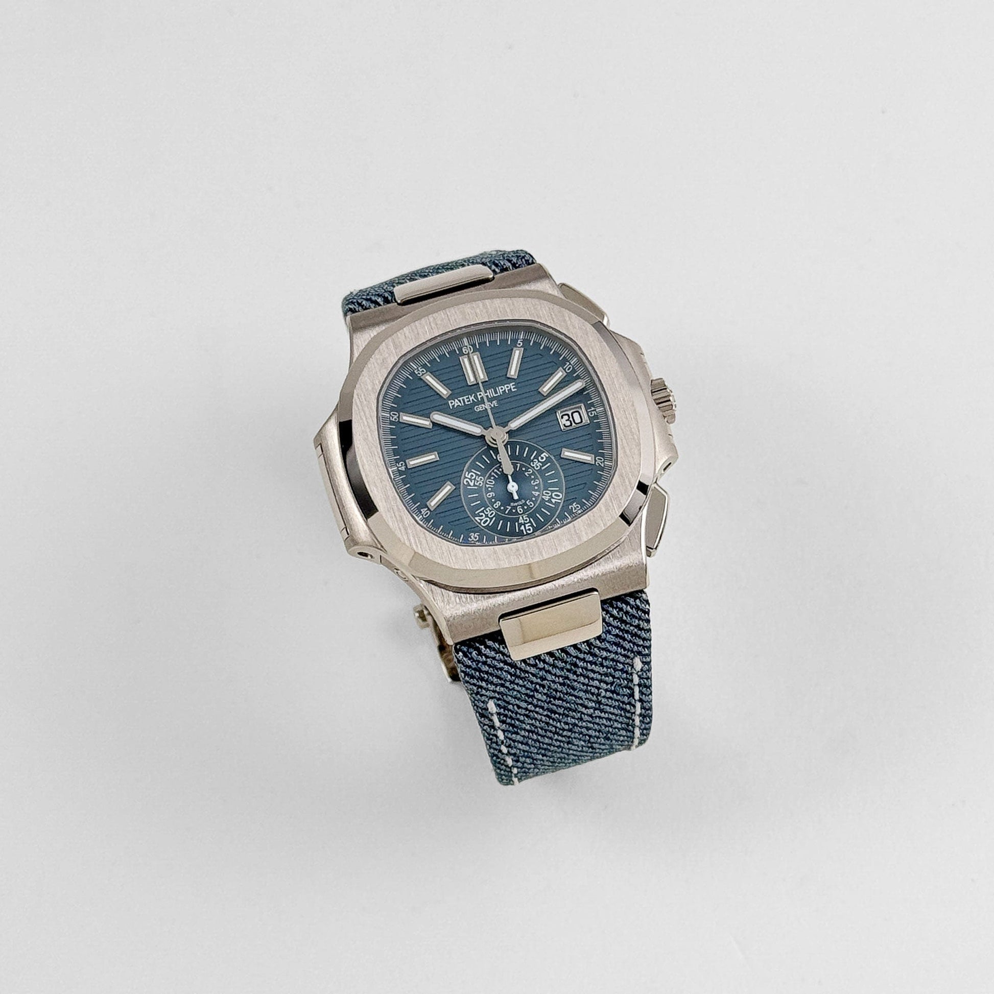 The Patek Philippe Nautilus 5980/60G-001 Flyback Chronograph is a stunning timepiece that combines sporty elegance with exceptional functionality. Crafted in a 40.5mm white gold case and paired with a blue-gray strap embossed with a casual denim pattern, this watch exudes sophistication and style.
