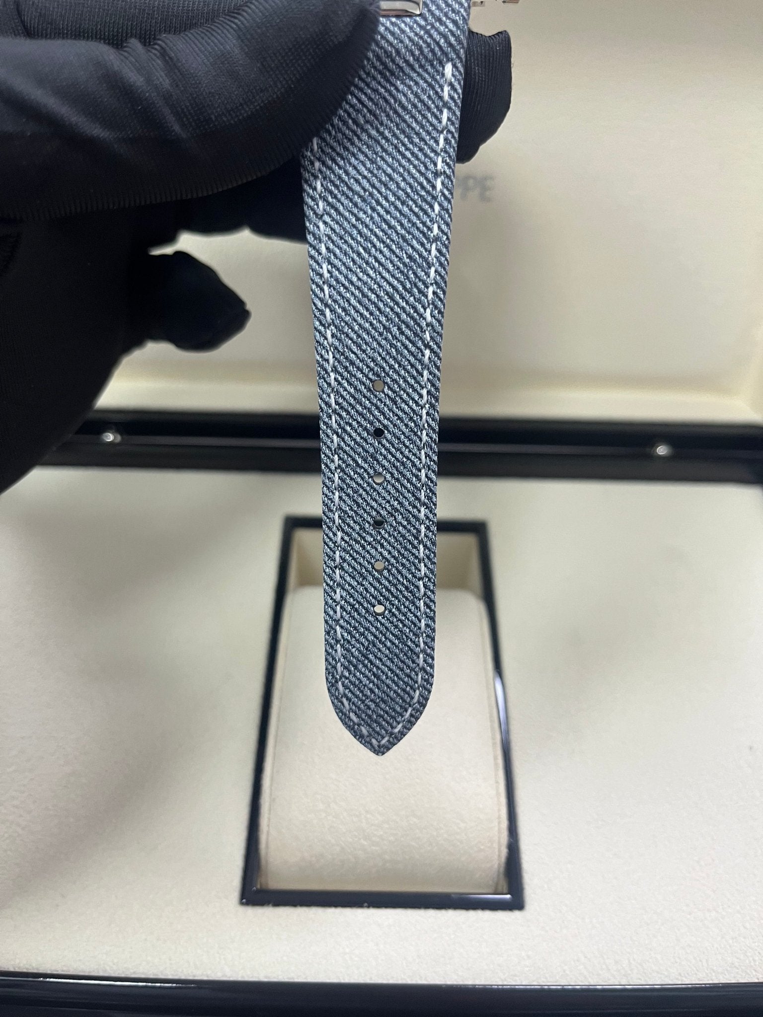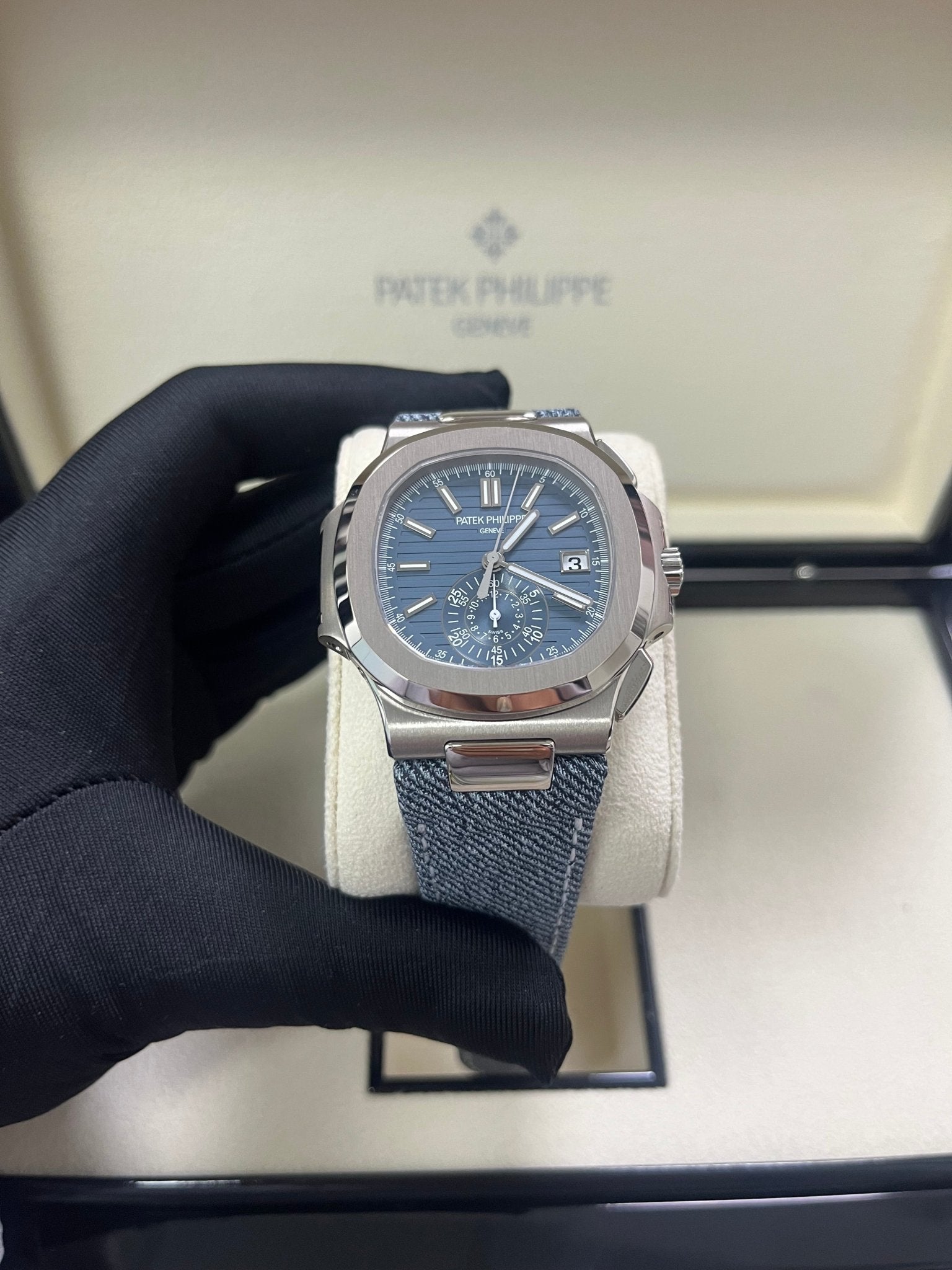 |   The Nautilus self-winding flyback chronograph comes in a new white gold version with an opaline blue-gray dial. This refined shade is echoed on the blue-gray denim-patterned calfskin strap with white gold Nautilus fold-over clasp. The watch is also delivered with an additional blue-gray composite material strap with fabric pattern.  The case and bezel are distinguished by contrasting polished and satin finishes. Chronograph indications are grouped in an original and legible large 6 o'clock monocounter with three concentric scales. The central chronograph seconds hand can also be used as a running seconds display. WATCH Self-winding mechanical movement. Caliber CH 28‑520 C/522. Flyback chronograph. Central chronograph hand. 60-minute and 12-hour monocounter. Date in an aperture. DIAL Opaline blue-gray, horizontally embossed, white gold applied hour markers with white luminescent coating. CASE White gold. Diameter (10 - 4 o’clock): 40.5 mm. Thickness: 12.2 mm. Water-resistant to 30 m. Screw-down crown. Sapphire crystal case back. STRAP Calfskin, hand-stitched, denim pattern, blue-gray (originally fitted). Composite material, fabric pattern, blue-gray (additional strap). Nautilus fold-over clasp in white gold.  |
