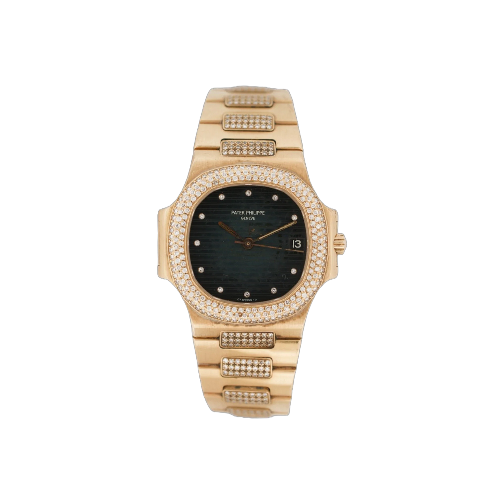 Created by Gerald Genta, the Patek Philippe Nautilus stands as one of the earliest luxury sports watches introduced to the market, becoming a lasting symbol of 70s contemporary design. The reference 4700 marked a significant innovation for the Nautilus, emphasizing its evolving identity and broader appeal. This specific Nautilus is crafted in yellow gold, featuring a blue dial, diamond hour markers, and a pavé diamond bezel, showcasing the brand's elegance and prestige.