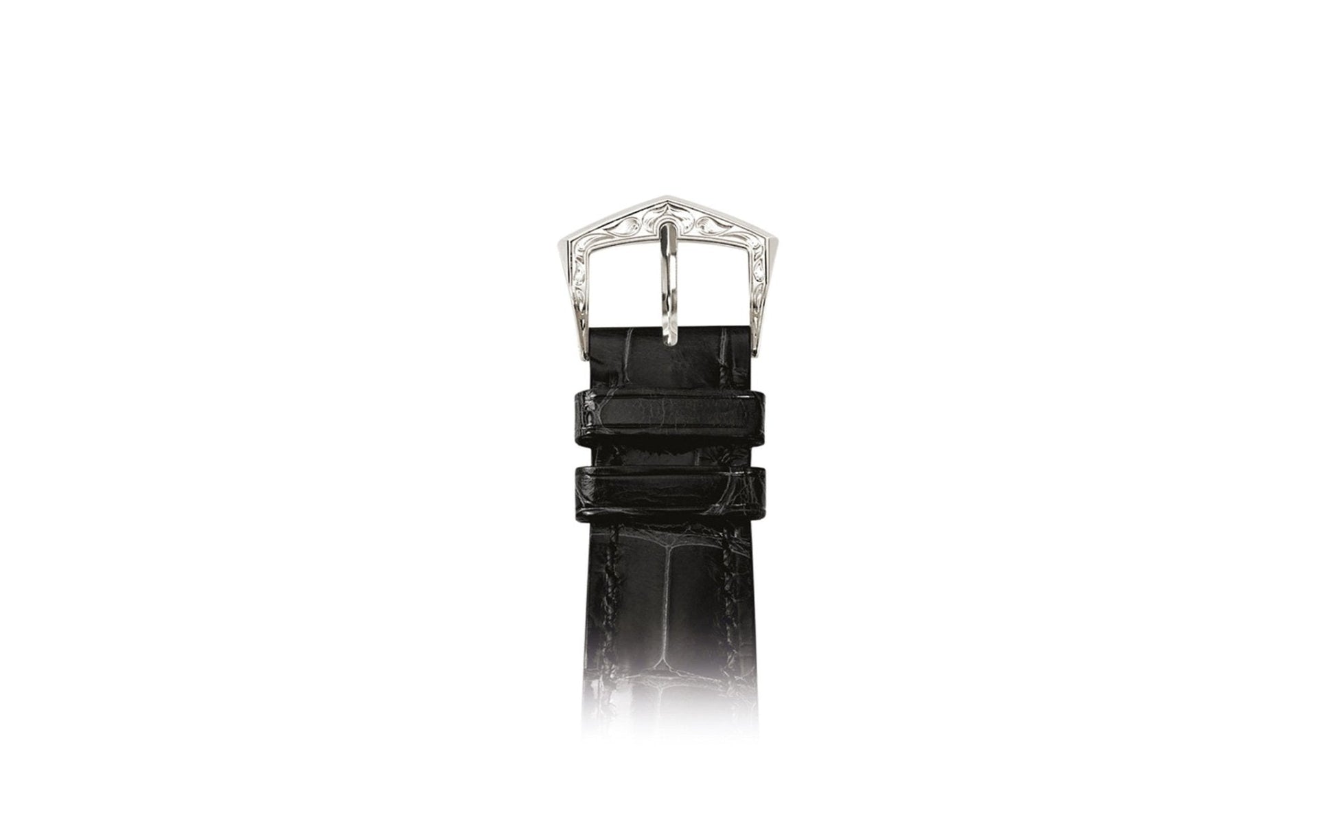 Platinum. Calatrava wristwatch with hand-engraved and enameled dial. Sapphire crystal case back. Water-resistant to 30 m. Diameter: 38 mm. Height: 8.3 mm.