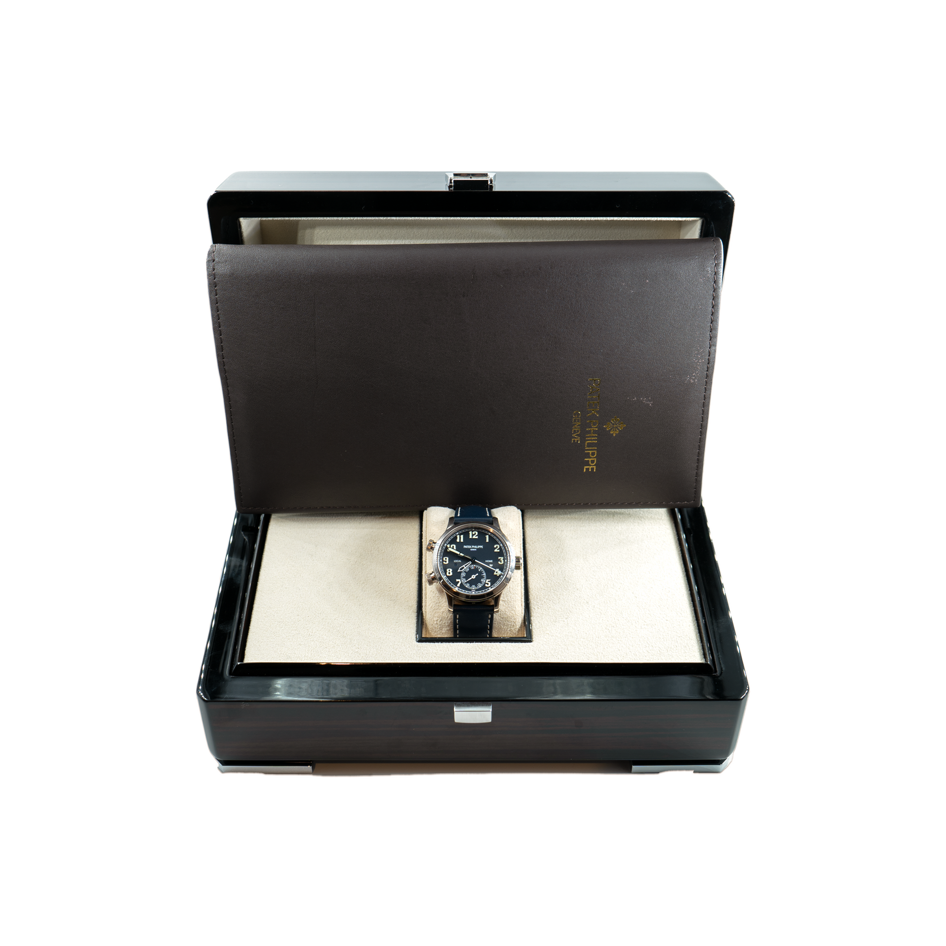 The watch features a rich blue lacquered dial with bold, luminous Arabic numerals and blued white gold hands—ensuring maximum legibility. Powered by the self-winding caliber 324 S C FUS, the 7234G includes Patek Philippe’s ingenious Travel Time mechanism, allowing seamless local time adjustment via pushers on the left side of the case. It displays both local and home times along with day/night indicators for each and a date subdial synchronized to local time.