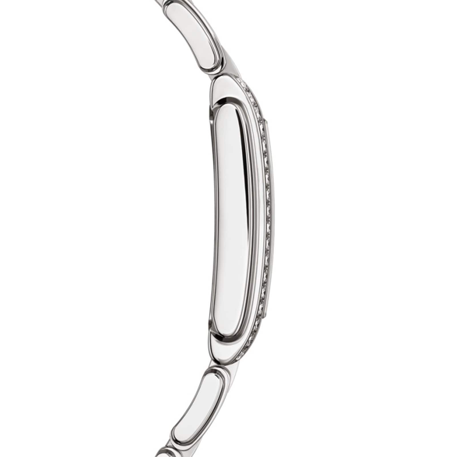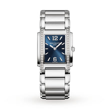 The medium-format Twenty~4 manchette quartz watch is infused with fresh momentum and comes in two new versions: the former Roman numerals are replaced with applied Arabic numerals in gold and trapeze-shaped gold markers take the place of the diamond markers. With its timeless and yet contemporary face, this watch is a companion for all of the hours of an active life. This steel model is available with a blue or gray sunburst dial. The crown is decorated with the Calatrava cross, Patek Philippe’s trademark emblem. WATCH Quartz movement. Caliber E15. DIAL Blue sunburst. Gold applied hour markers and numerals with luminescent coating. White gold baton-style hands with luminescent coating. CASE Stainless steel. Solid case back. Water-resistant to 30 m. Dimensions: 25.1 x 30 mm. Height: 6.8 mm. GEMSETTING 36 diamonds : ~0.42 ct. (case). STRAP Steel bracelet. Fold-over clasp.