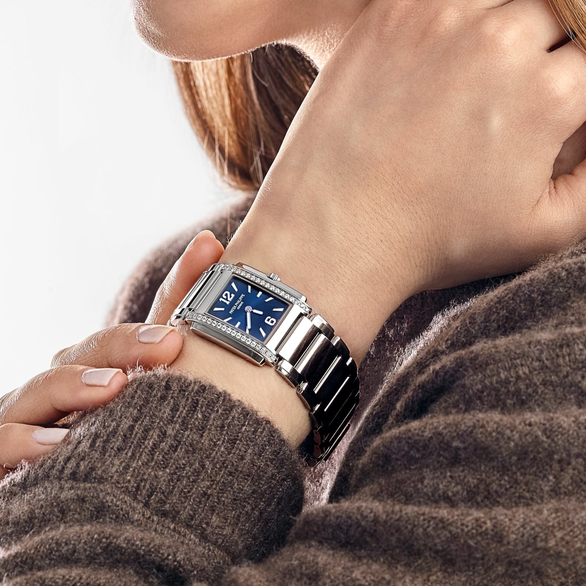 The Patek Philippe Twenty-4 4910/1200A-001 is a strikingly elegant ladies’ timepiece, combining everyday practicality with timeless sophistication. Crafted in stainless steel, its rectangular case is adorned with two vertical rows of sparkling diamonds that frame the dial and add a touch of brilliance. The rich blue sunburst dial provides a bold contrast, accentuated by applied white gold Roman numerals and hour markers for an effortlessly refined look.