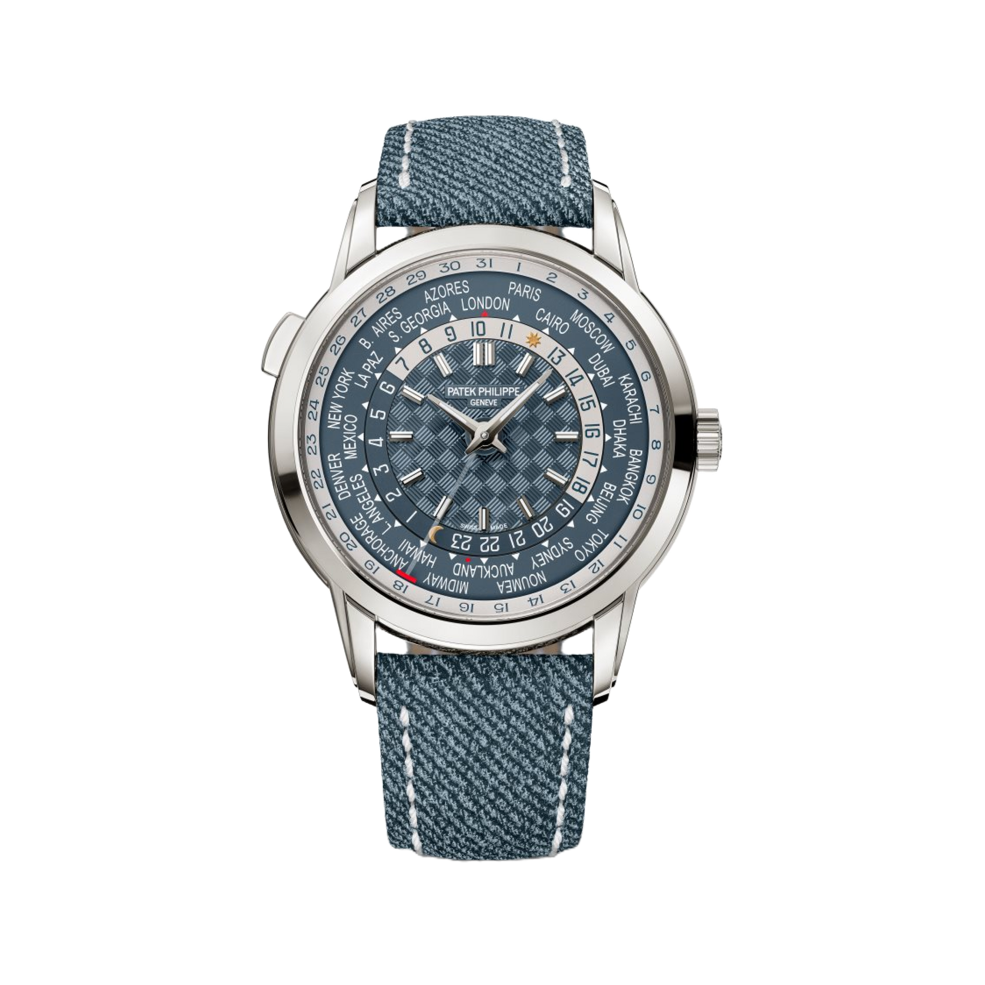This new generation of the World Time features a patented world first: a date display indexed to local time, corresponding to the time zone selected at 12 o'clock and indicated by the central hands.