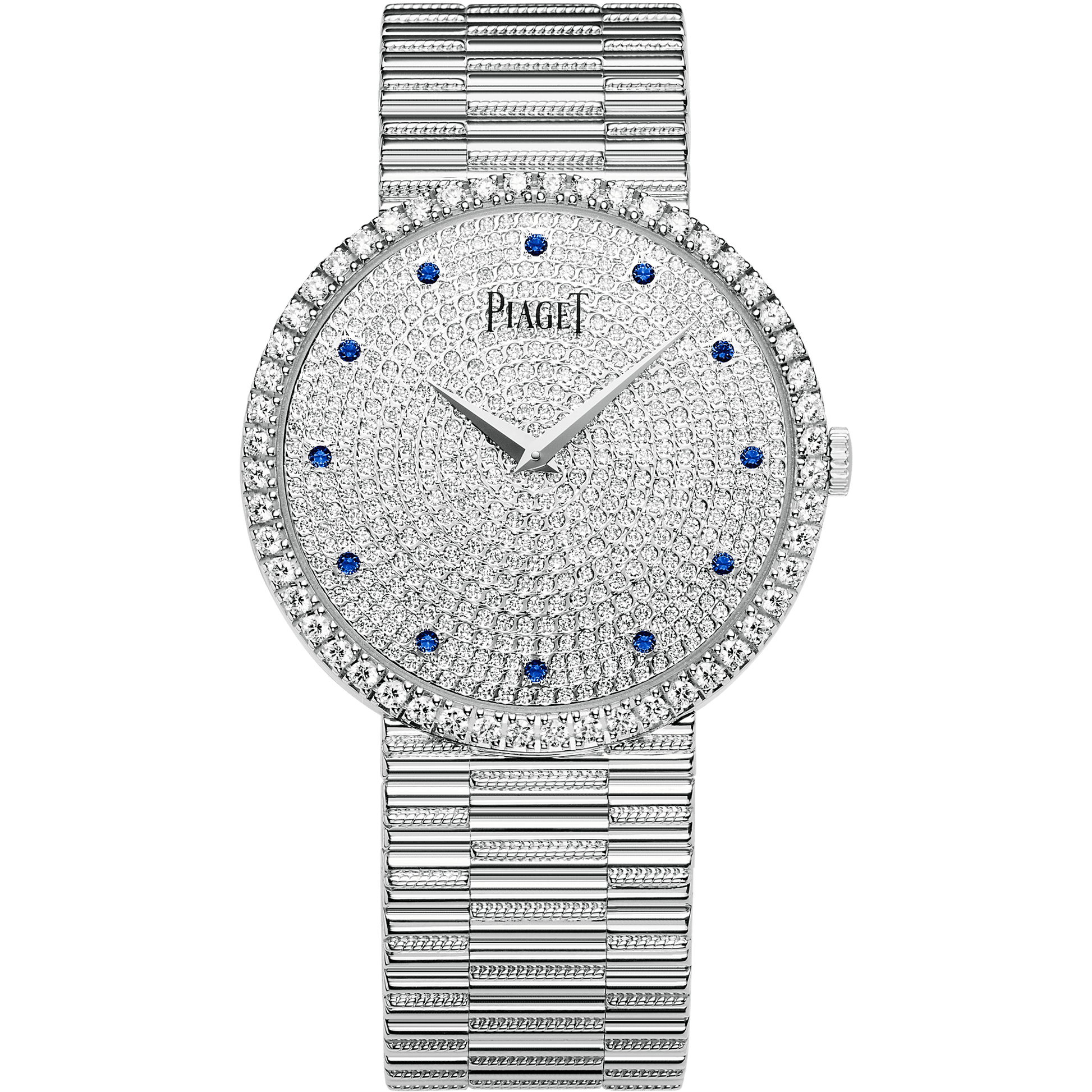 Altiplano Traditional watch, 34 mm. Case in rhodium finish 18K white gold set with 52 brilliant-cut diamonds (approx. 0.8 ct). Dial set with 492 brilliant-cut diamonds (approx. 1.6 ct) with hour-markers set with 12 sapphires (approx. 0.1 ct). Rhodium finish 18K white gold bracelet. Manufacture 430P ultra-thin mechanical movement with manual winding.